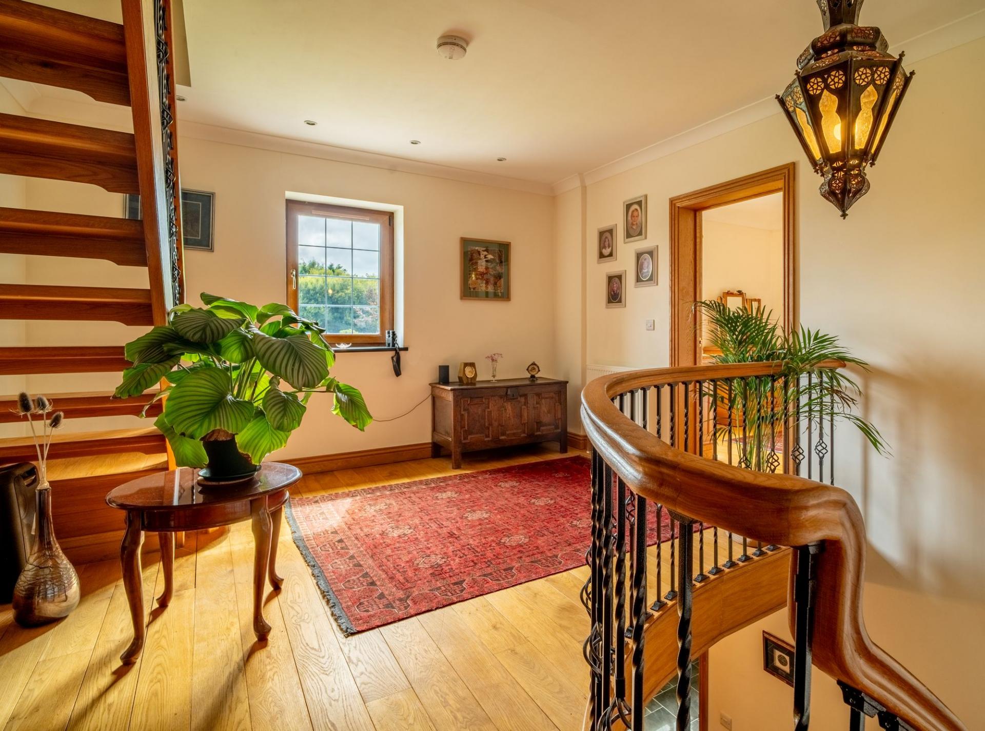 This bright and spacious landing features a curved wooden staircase with wrought-iron detailing, oak flooring, and a large window that fills the space with natural light. A striking pendant light and room for statement furniture complete the welcoming feel.