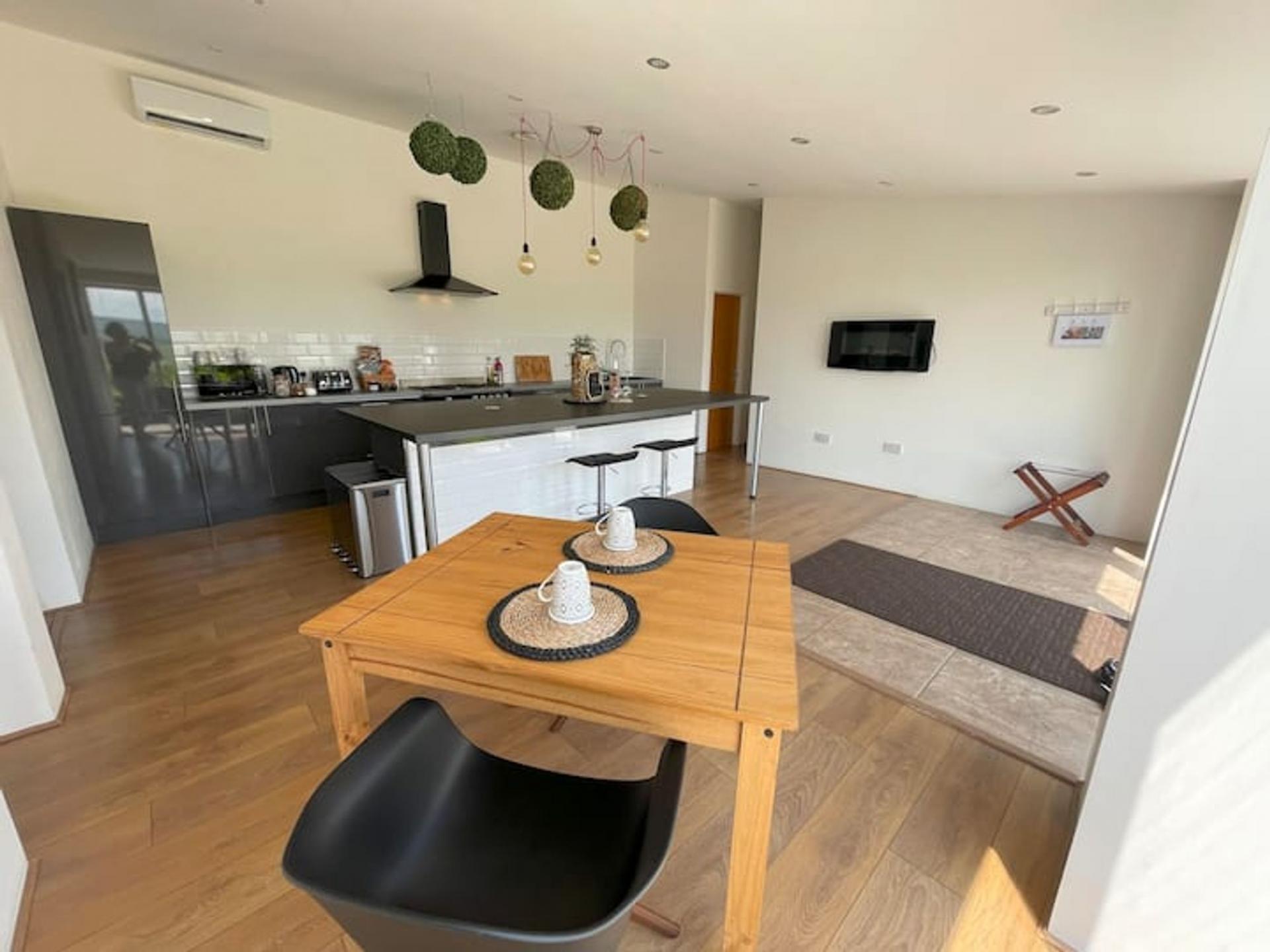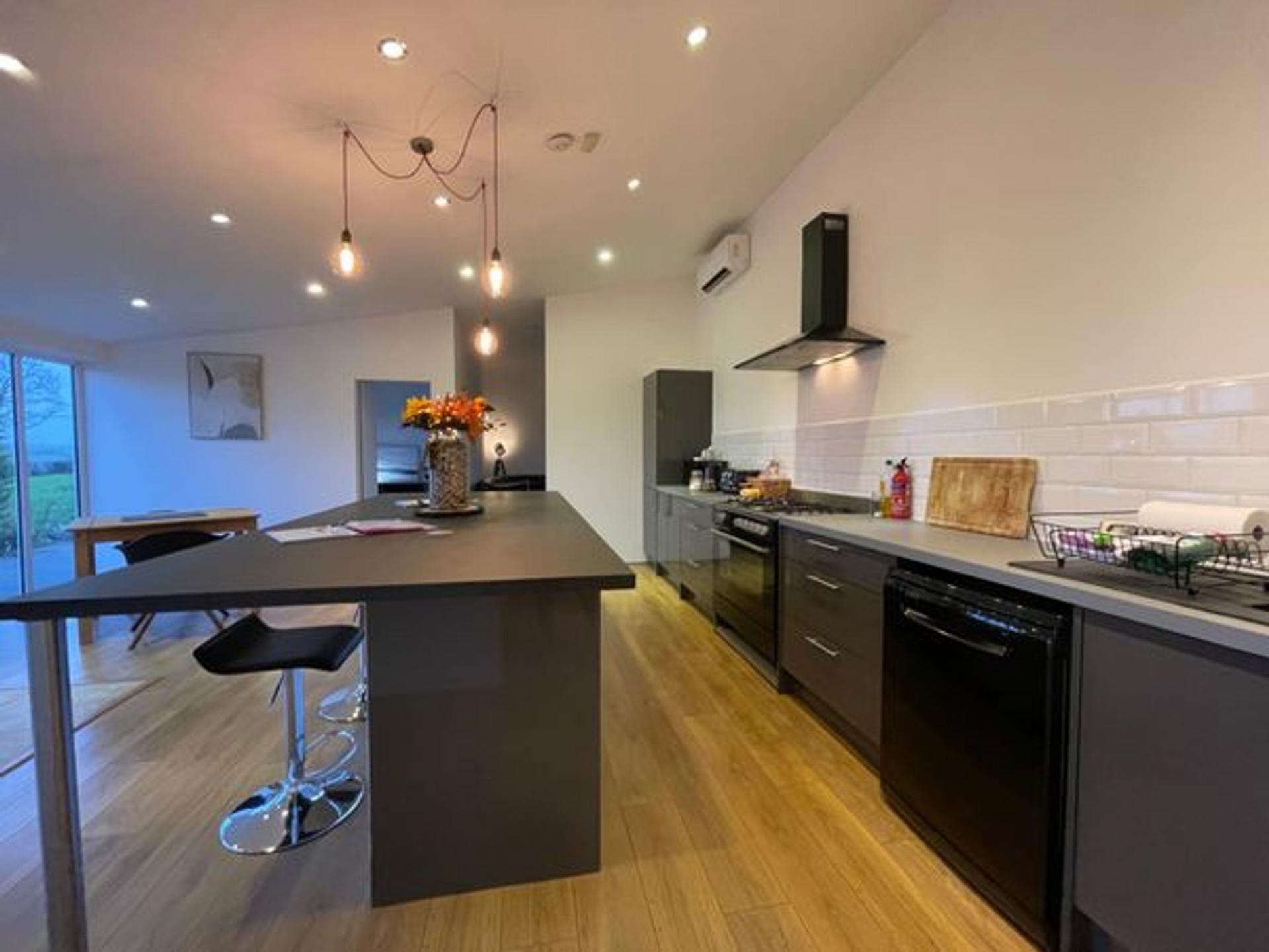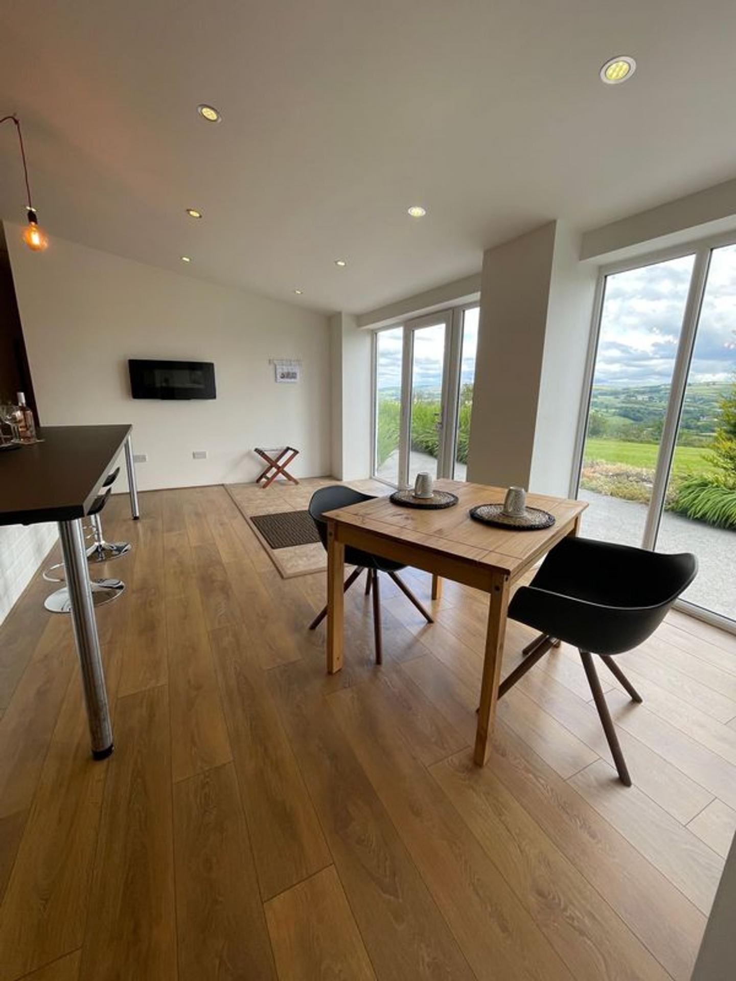 A spacious open-plan kitchen and dining area with uninterrupted scenic views of Brechfa Forest.