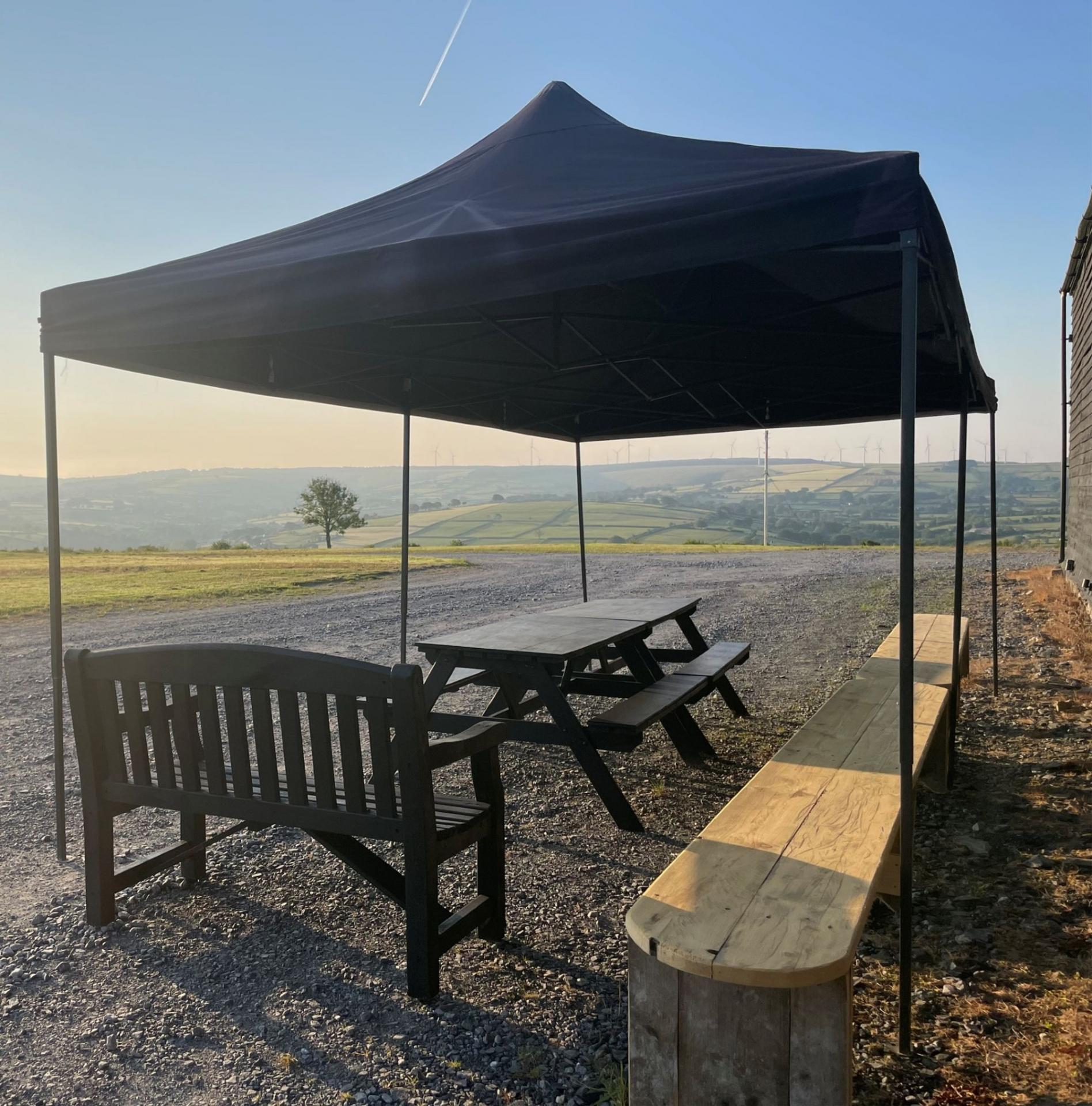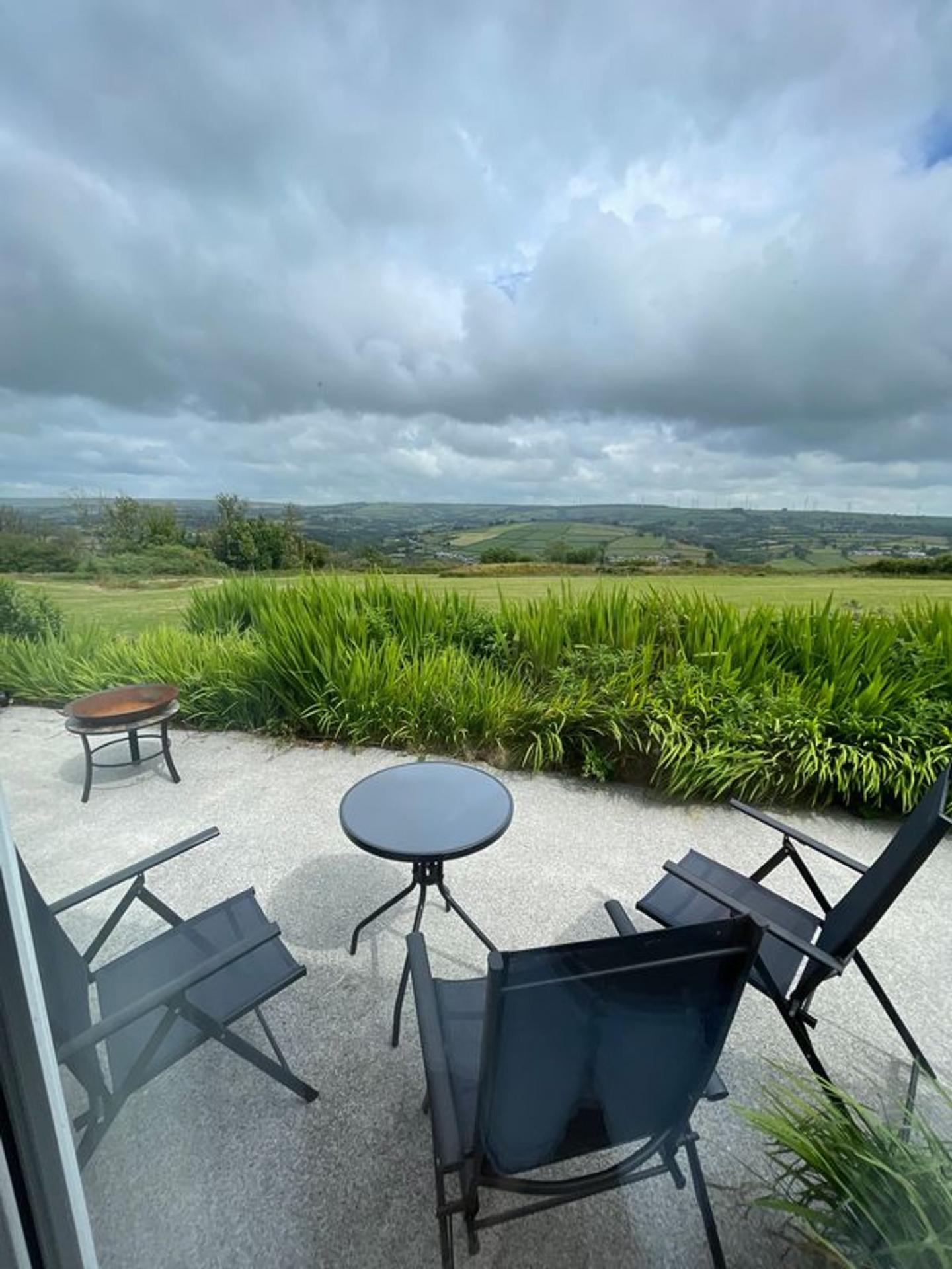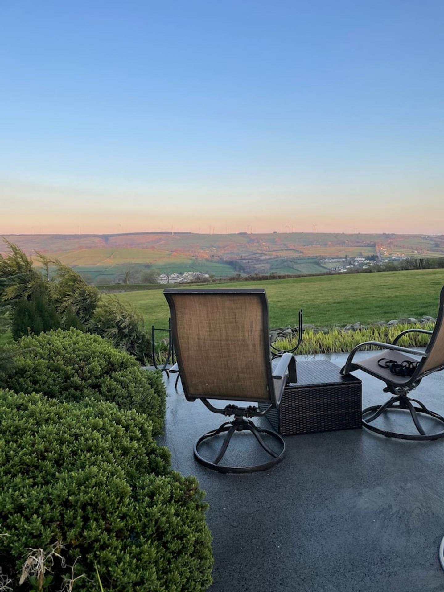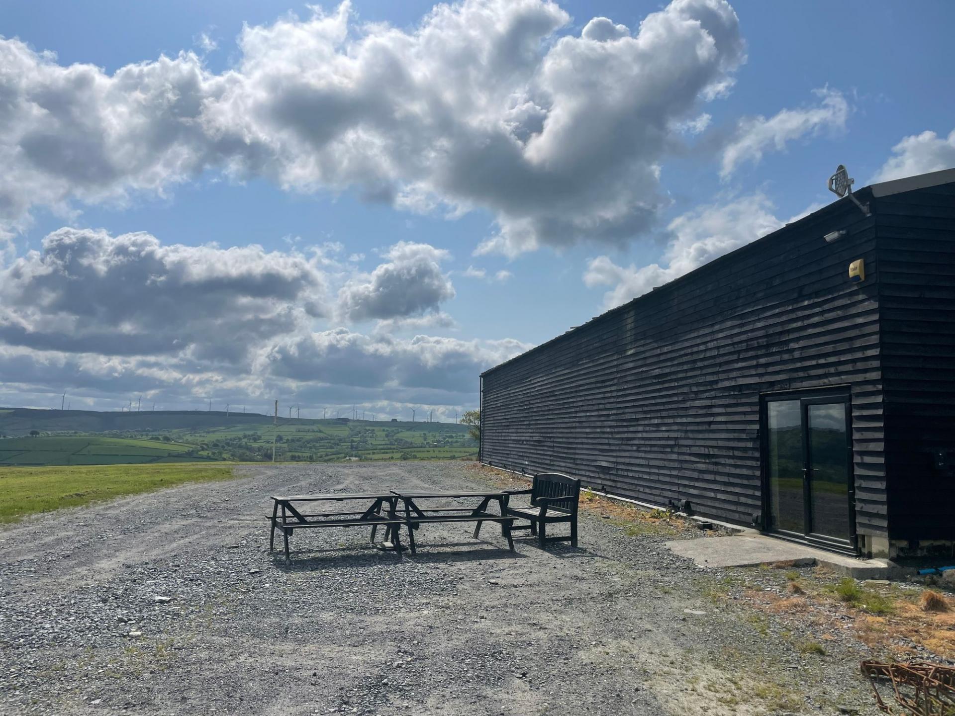 A spacious open-plan kitchen and dining area with uninterrupted scenic views of Brechfa Forest.