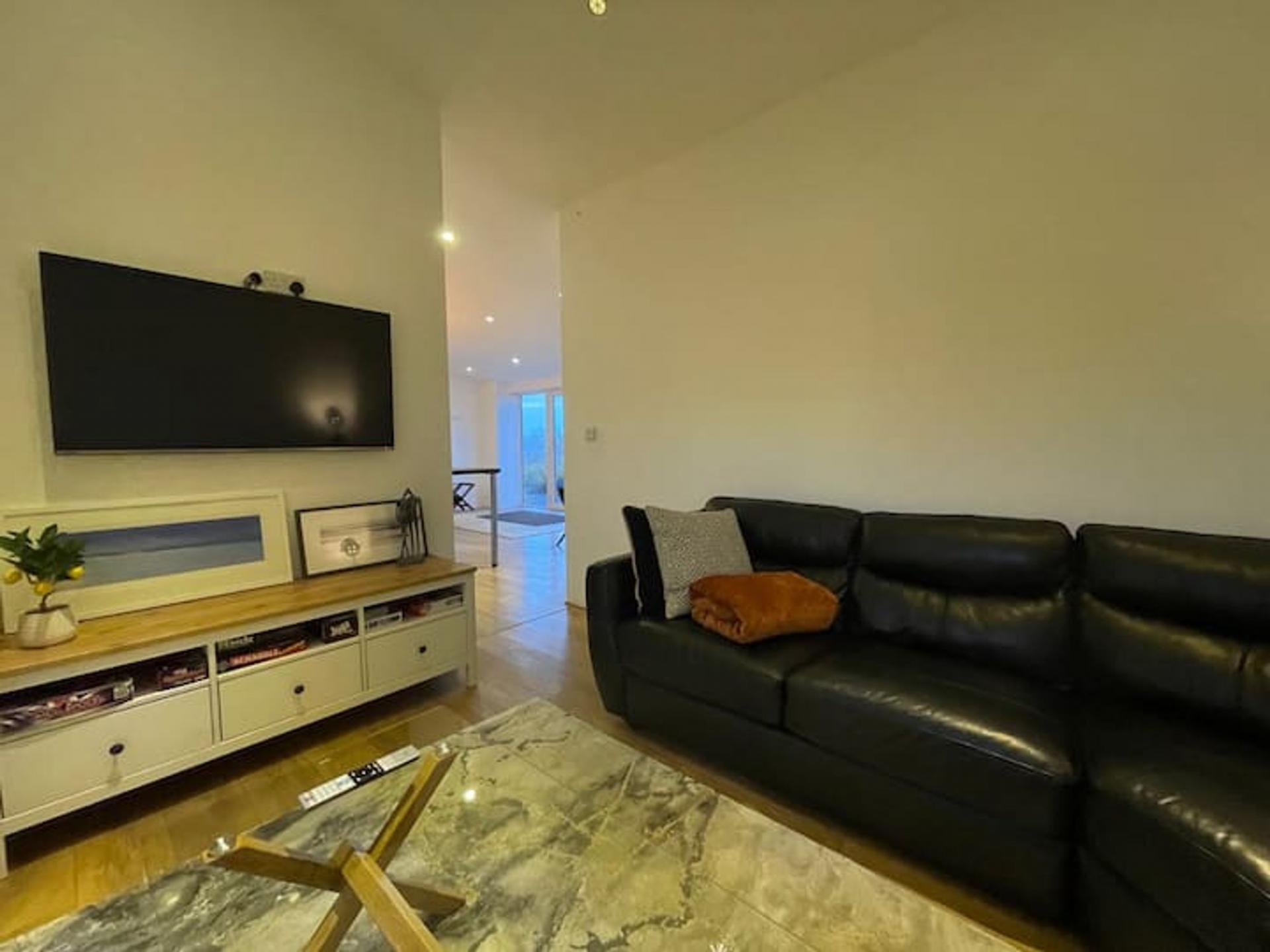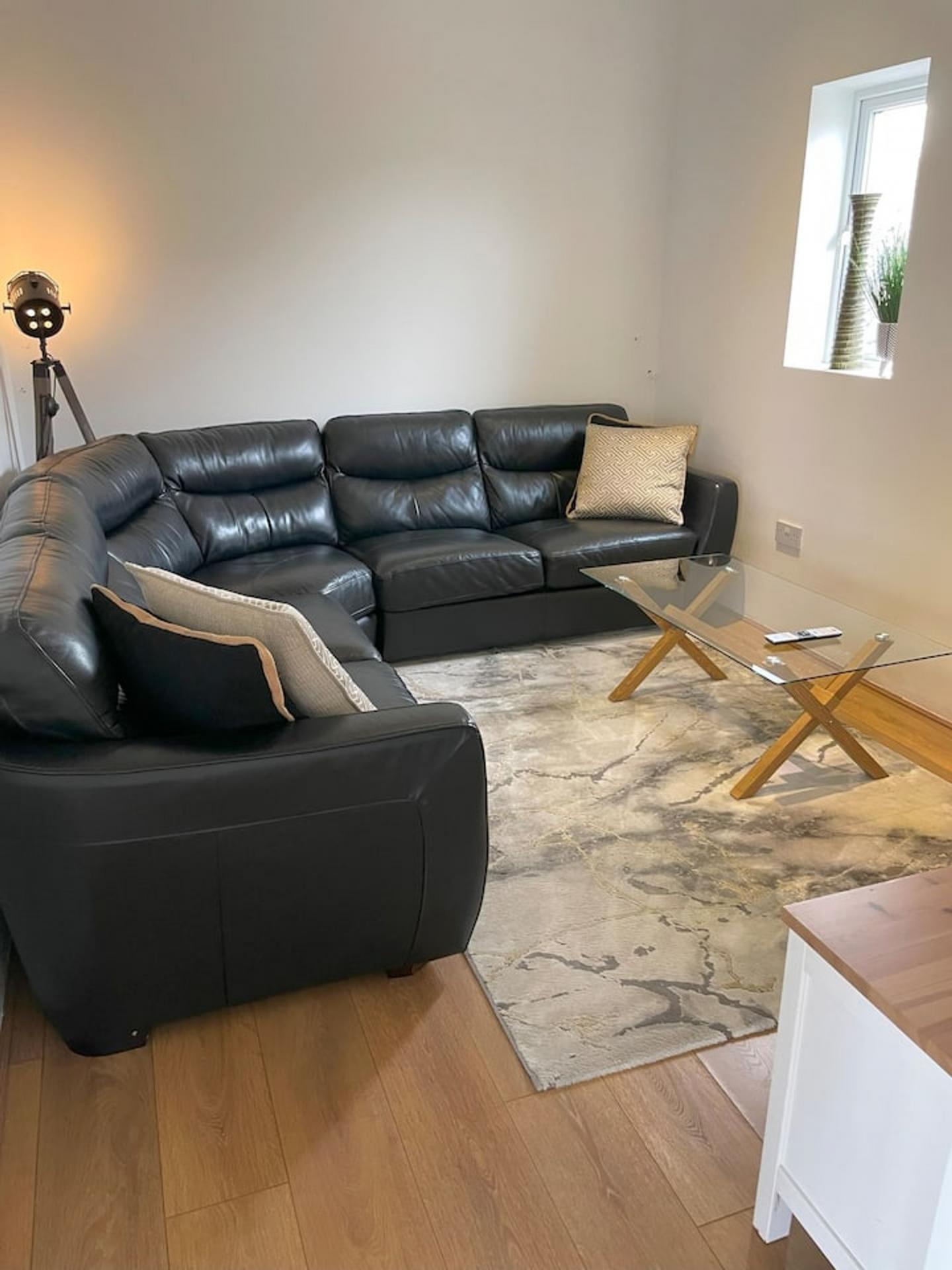 A bright and cosy living area with high ceilings, ideal for relaxing and hosting guests.