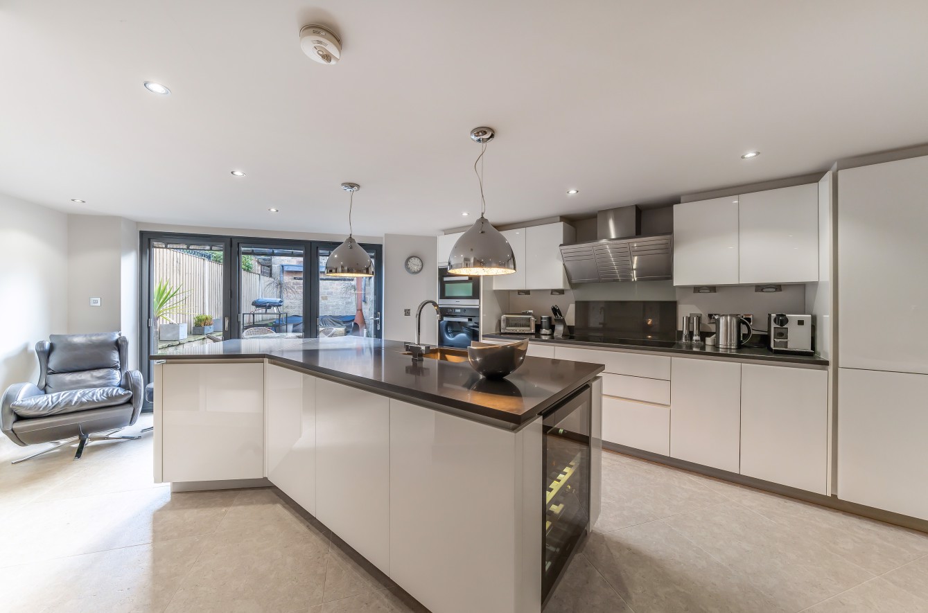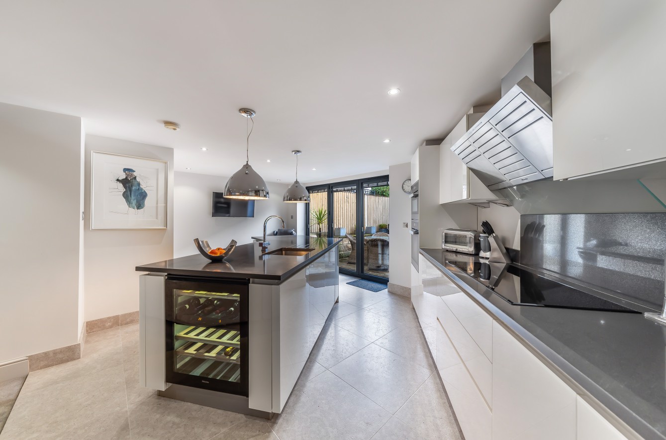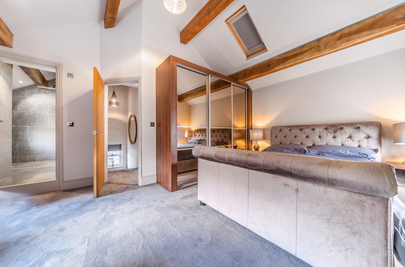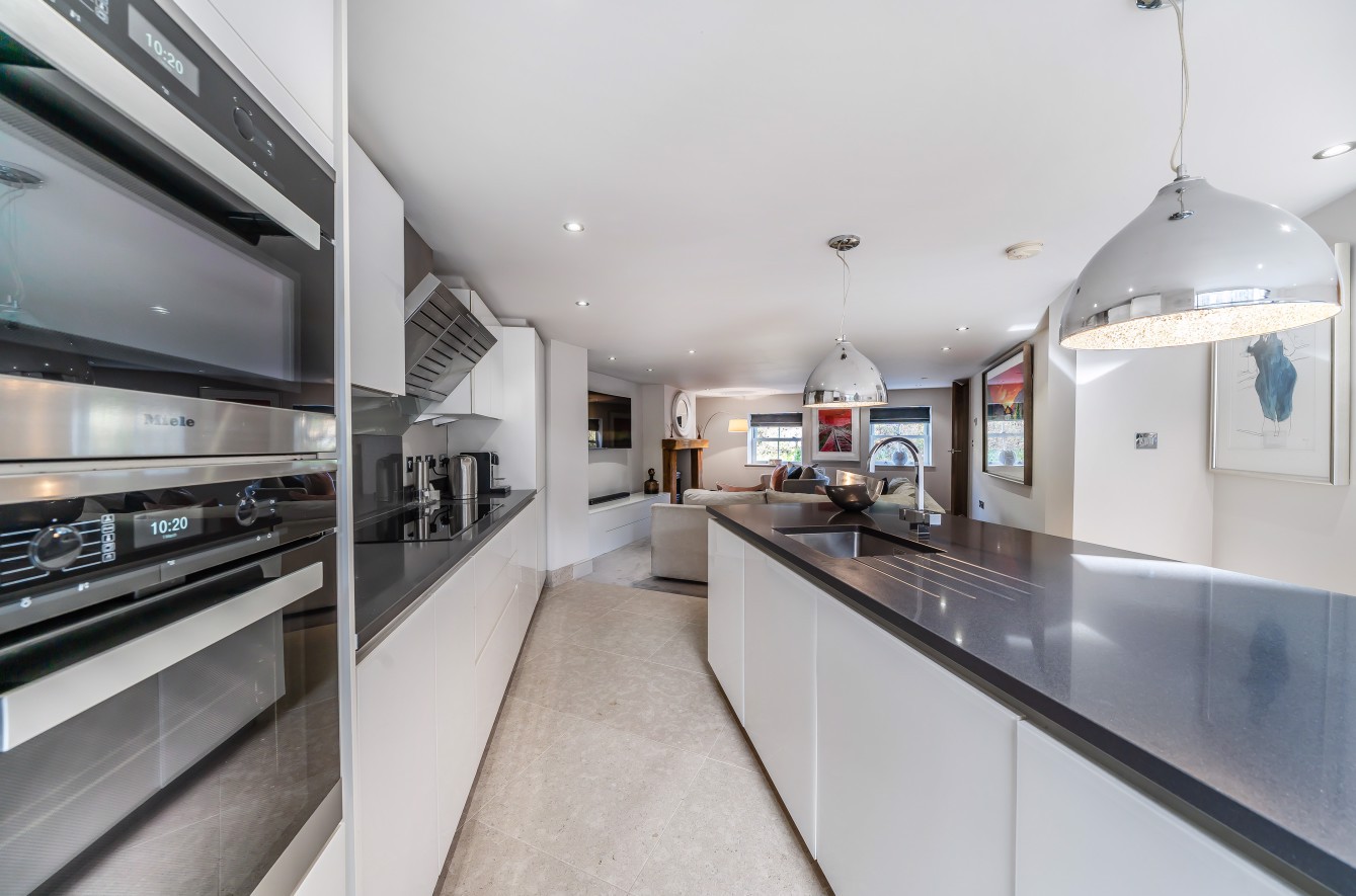 Upon entering the property via a solid oak door, you are greeted by stylish and spacious living room providing a perfect space for relaxation having an attractive, recessed central feature fireplace incorporating a wood burning stove, double aspect windows to front elevation, recessed spotlights, underfloor heating and open access to the kitchen. The stunning, contemporary 'Hacker' kitchen has an extensive range of high-end glass finish units fitted at floor and wall height, a central island unit having granite work surfaces and an array of high spec. ‘Miele’ integrated appliances including an induction hob, dishwasher and wine fridge. In addition, there are bi-folding doors with integrated blinds to the rear elevation leading out to a delightful garden area, attractive stone tiled flooring with continued under floor heating, access to a separate utility room having continued storage units with plumbing for washing machine and tumble dryer, solid oak side entrance door and access to a guest WC. To the first floor the master bedroom is a great size having two windows to front elevation with two further skylights allowing for plenty of natural light to flood the room. Wooden beams to a vaulted ceiling, fitted wardrobes and door to a luxurious en-suite shower room with stone tiles and underfloor heating. The second double bedroom has attractive fitted wardrobes and window to the rear elevation. The modern house bathroom comprises a three-piece white suite with underfloor stone tiled heating and stylish tiled walls.