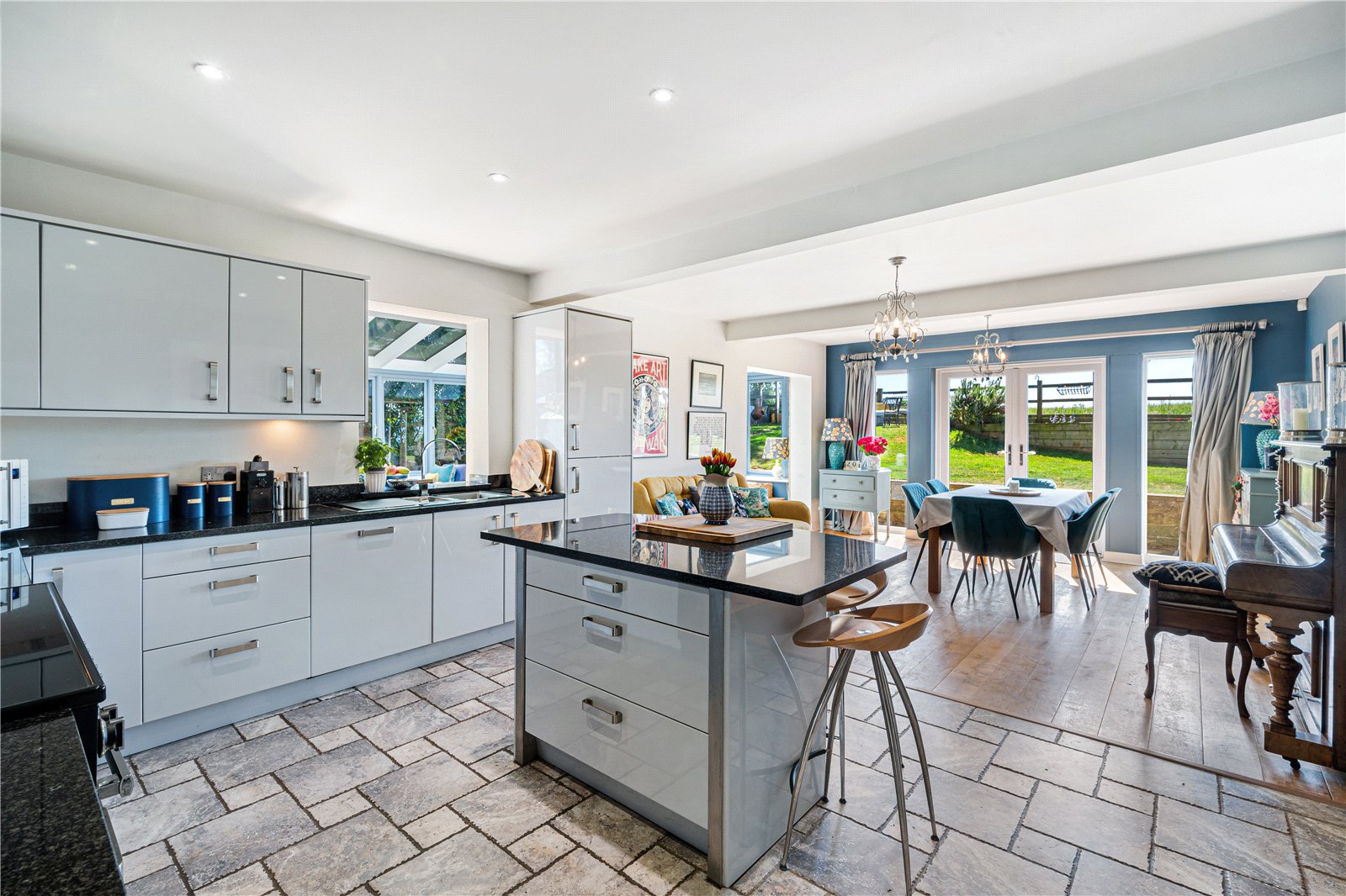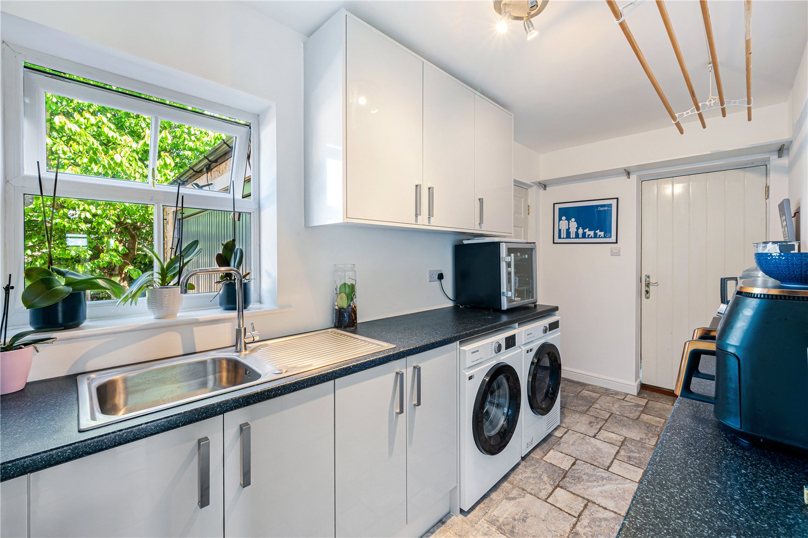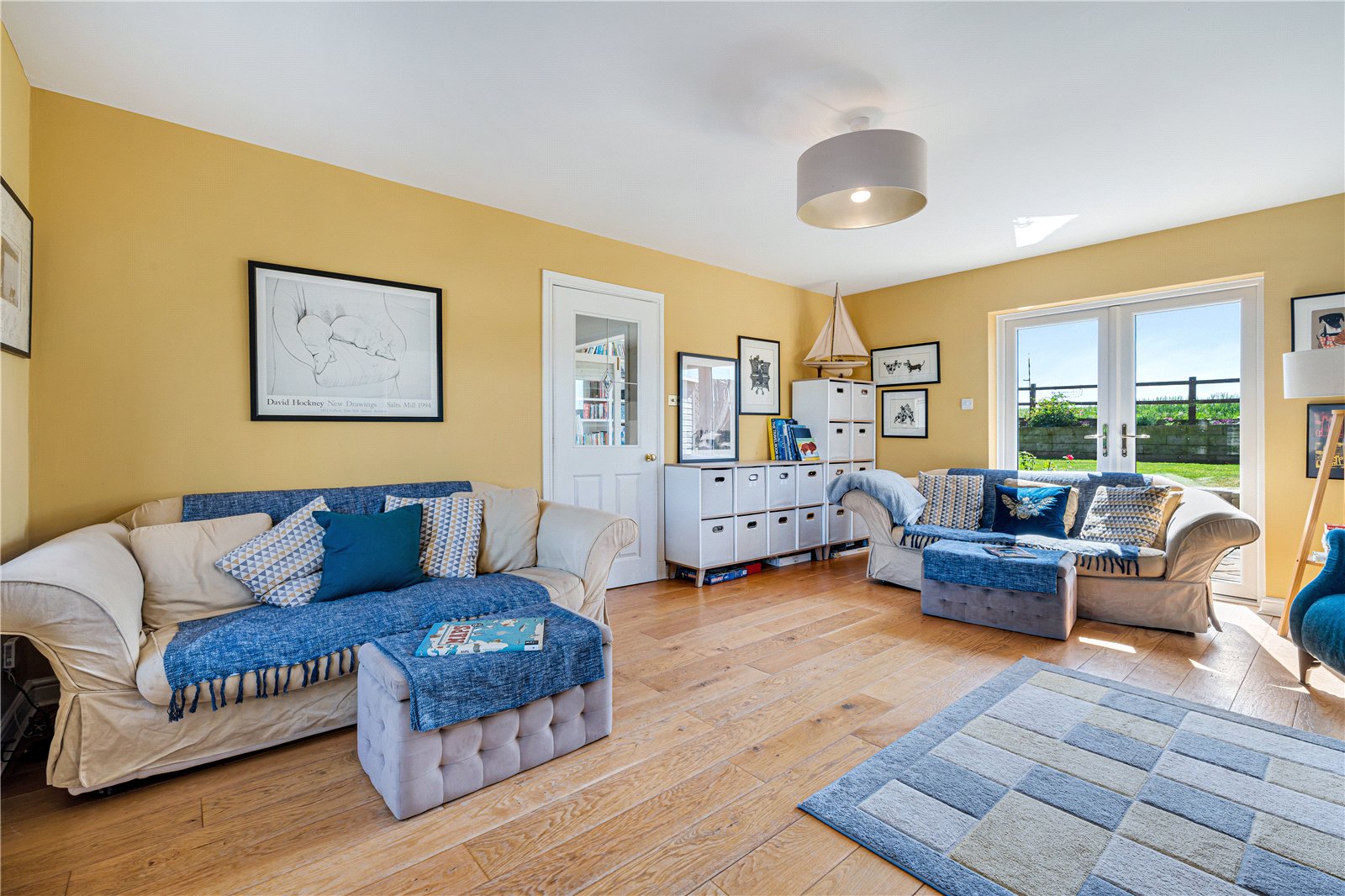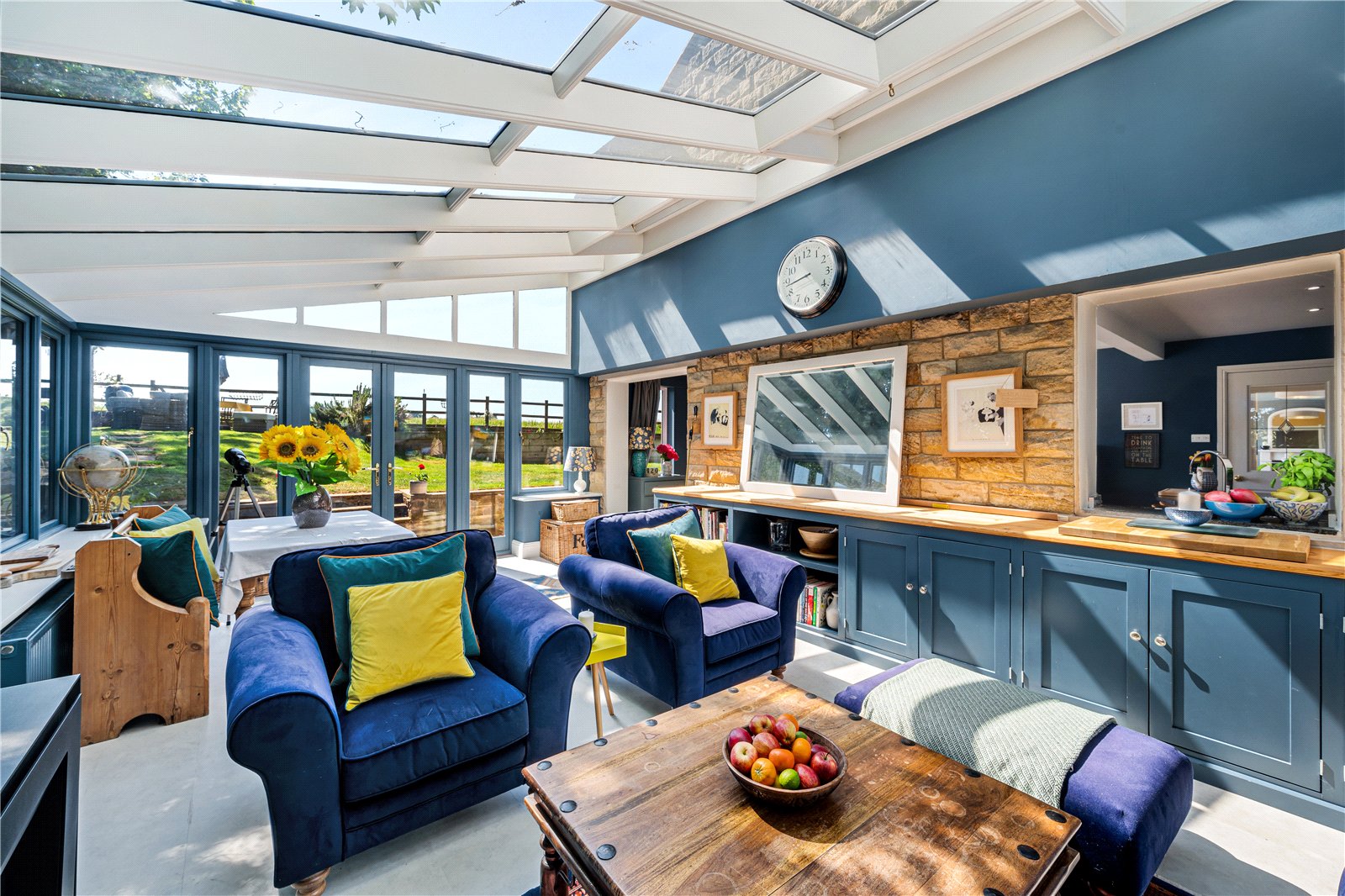 For those working from home, a dedicated office features built-in shelving and storage, ensuring a practical and quiet workspace. At the heart of the home is a generous open-plan kitchen and dining room, boasting a range cooker, integrated dishwasher and fridge, stone flooring, and ample space for a family dining table and entertaining — all framed by French doors and windows with stunning garden views. A utility room offers additional functionality, while the bright and airy garden room creates the perfect spot to relax and enjoy the natural surroundings year-round.