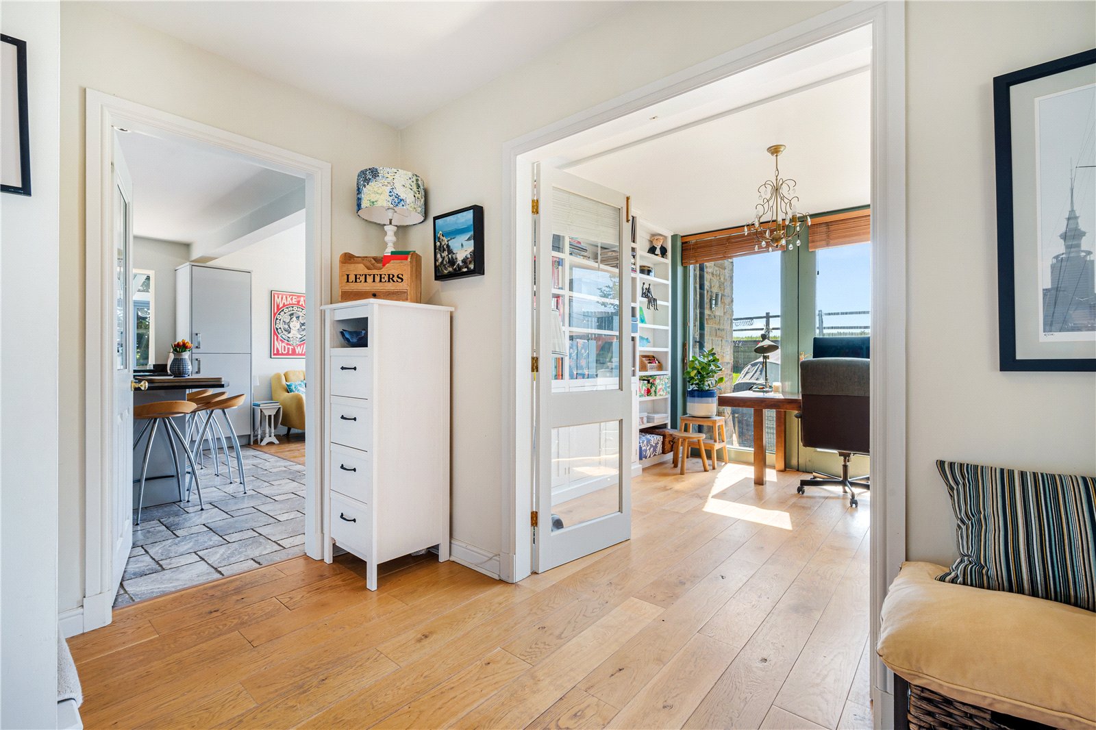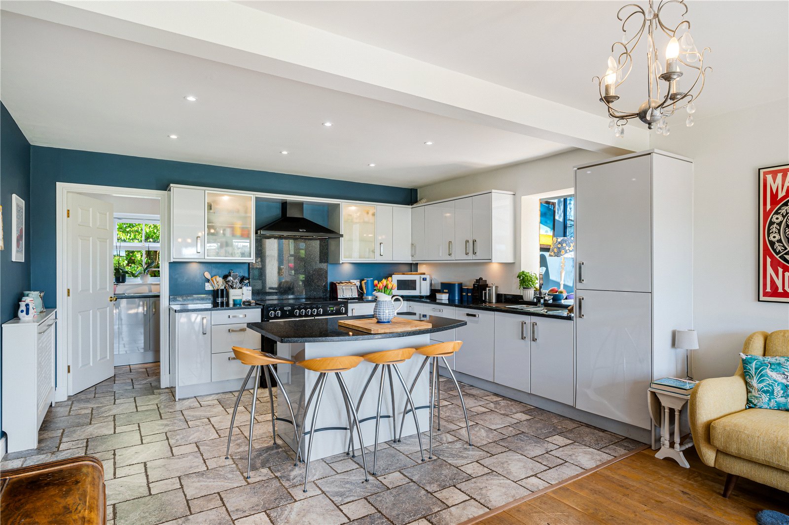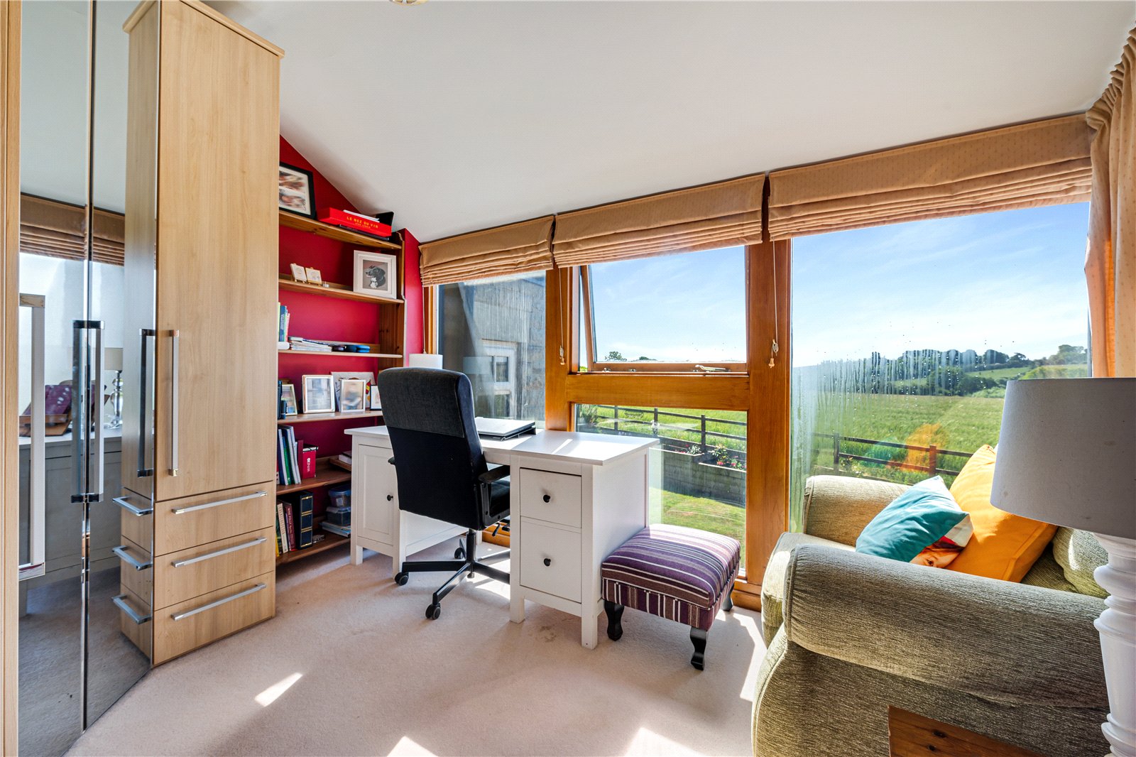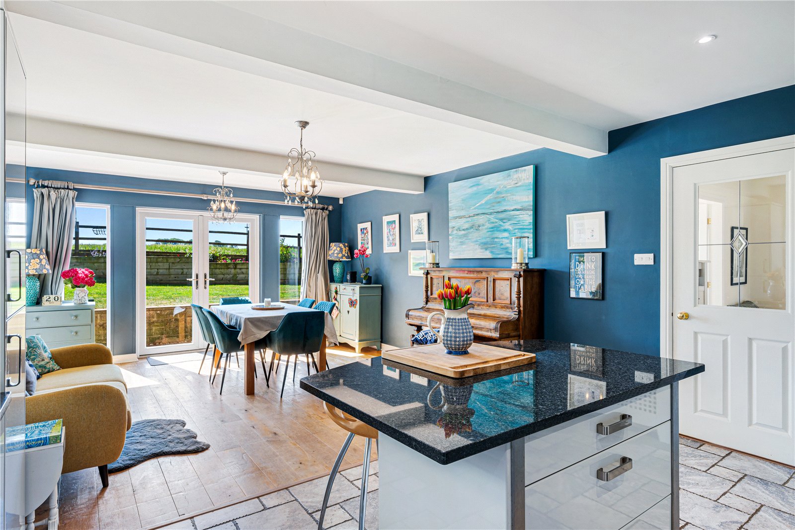 For those working from home, a dedicated office features built-in shelving and storage, ensuring a practical and quiet workspace. At the heart of the home is a generous open-plan kitchen and dining room, boasting a range cooker, integrated dishwasher and fridge, stone flooring, and ample space for a family dining table and entertaining — all framed by French doors and windows with stunning garden views. A utility room offers additional functionality, while the bright and airy garden room creates the perfect spot to relax and enjoy the natural surroundings year-round.