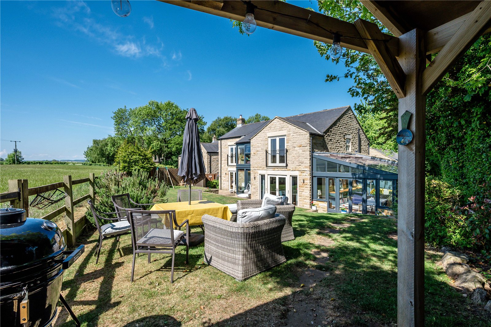 Outside, the property continues to impress. To the front, a gated driveway leads to a double garage with an electric vehicle charger and a well-maintained sunny lawned garden. The rear garden is a highlight being meticulously landscaped with a lawn, paved patio, garden shed, and an outdoor kitchen ideal for entertaining or al-fresco dining. All this is set against the backdrop of panoramic countryside views that truly make this stunning garden one-of-a-kind.