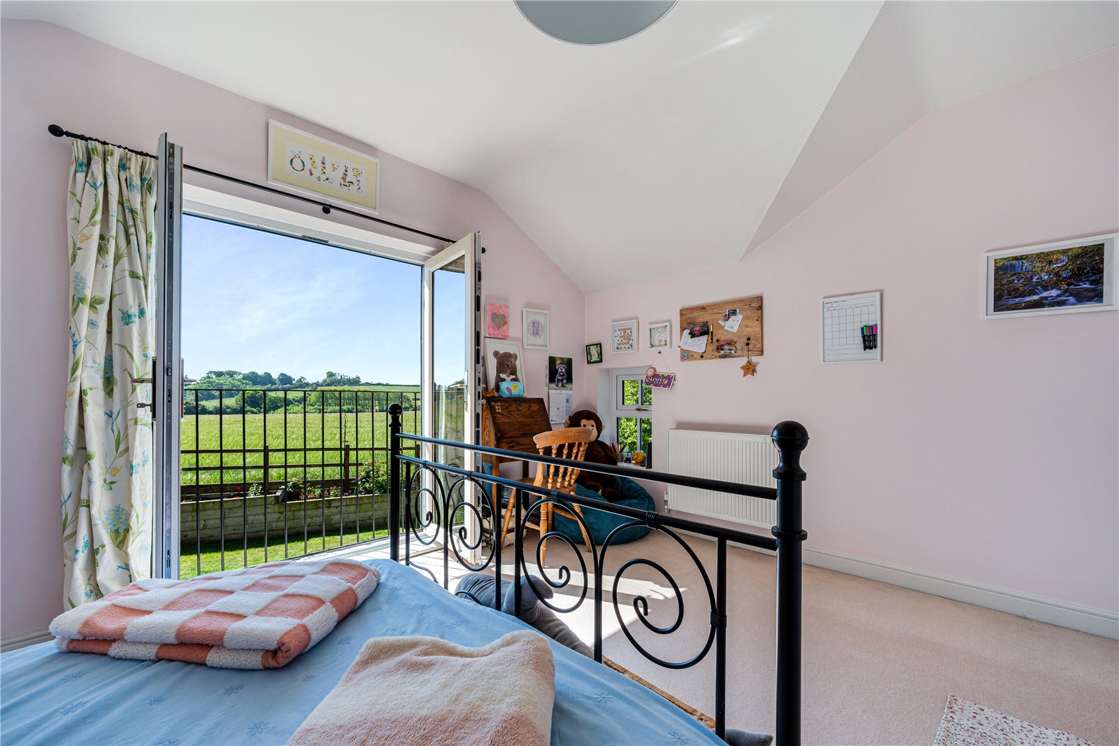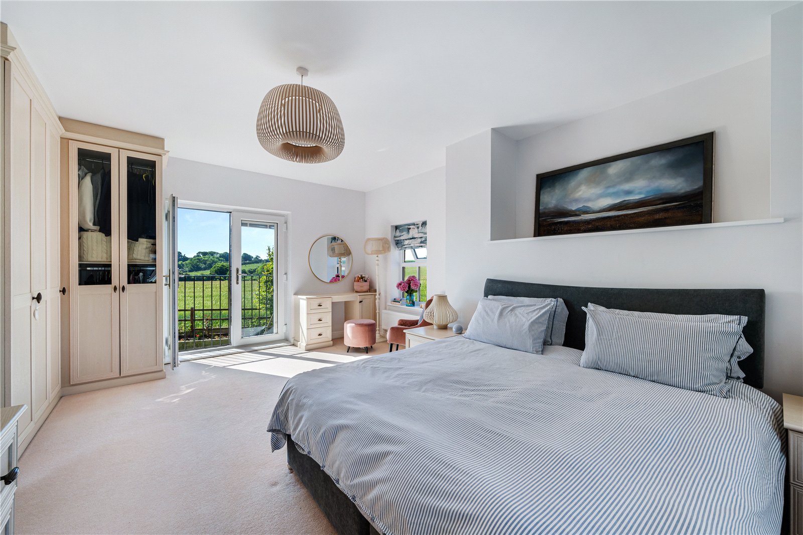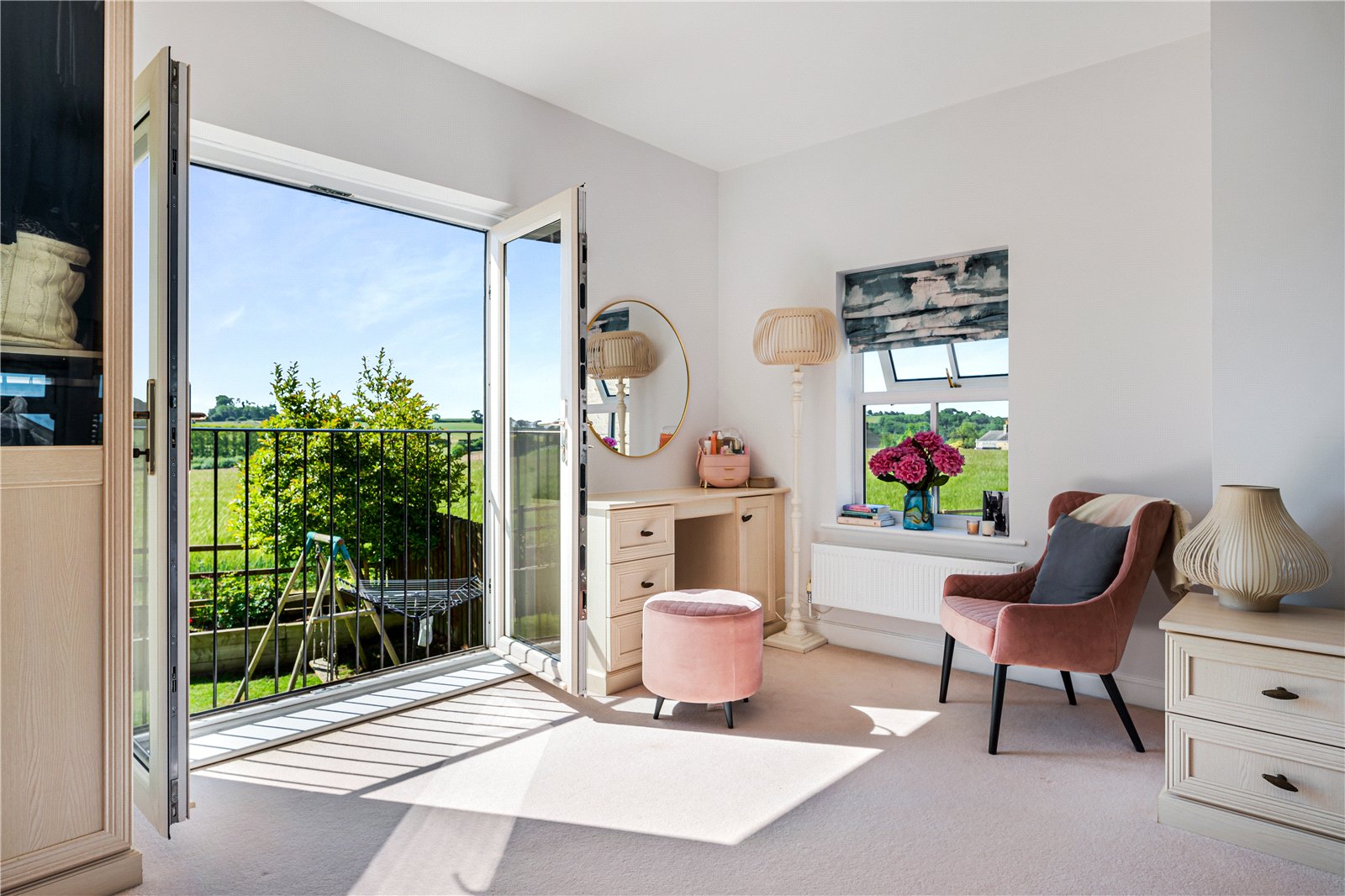 Upstairs, the main bedroom suite is a true sanctuary, complete with built-in furniture, a Juliet balcony overlooking the countryside, and a modern en-suite shower room. Three further well-proportioned bedrooms are served by a stylish family bathroom, perfect for a growing household.