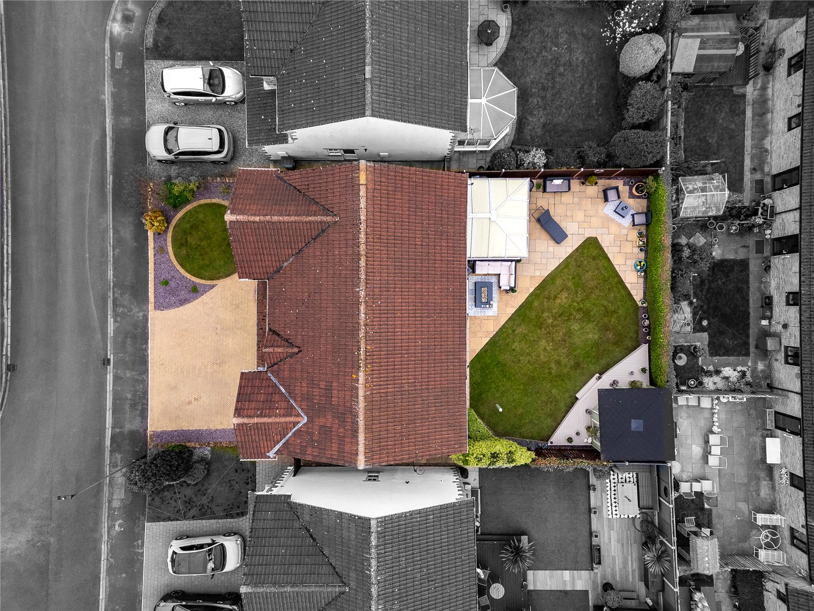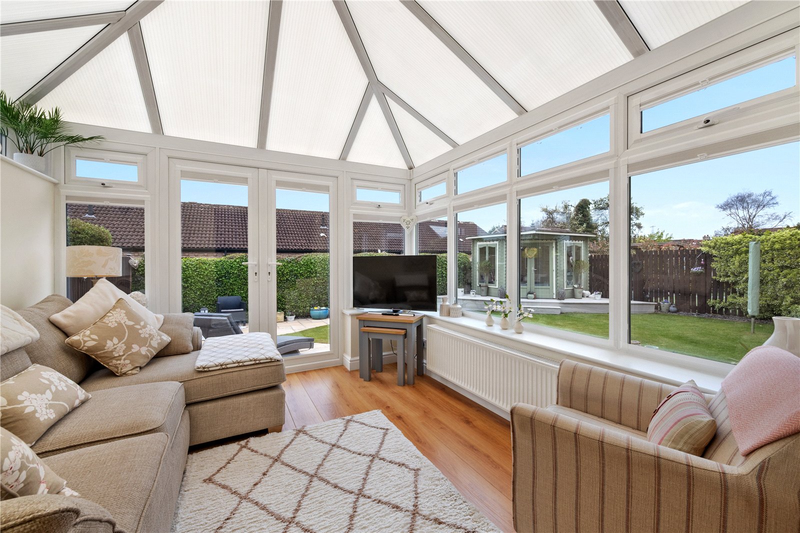 Outside, the property enjoys a well-maintained front garden and a driveway providing off-street parking for two cars in front of a single garage. To the rear, you'll find a delightful south-facing garden, mainly laid to lawn, with two paved patio areas—perfect for entertaining or relaxing in the sun. A charming garden room adds an extra touch of luxury, offering a peaceful retreat, home office, or creative space