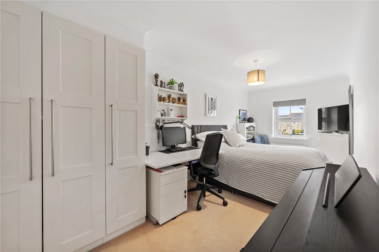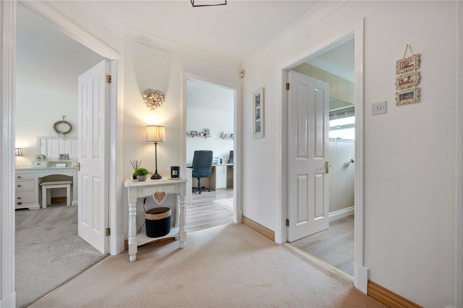 The principal bedroom features built-in wardrobes and a stylish en-suite shower room, creating a luxurious private retreat. The guest bedroom also benefits from its own en-suite. There are three further bedrooms, with two of the bedrooms having fitted wardrobes, and the fourth bedroom also features bespoke fitted Sharps office furniture, they are all served by a contemporary and well-appointed house bathroom. In addition, the property is heated by an efficient 3 year old Viessmann gas boiler supplying radiators and a large recently updated hot water tank.