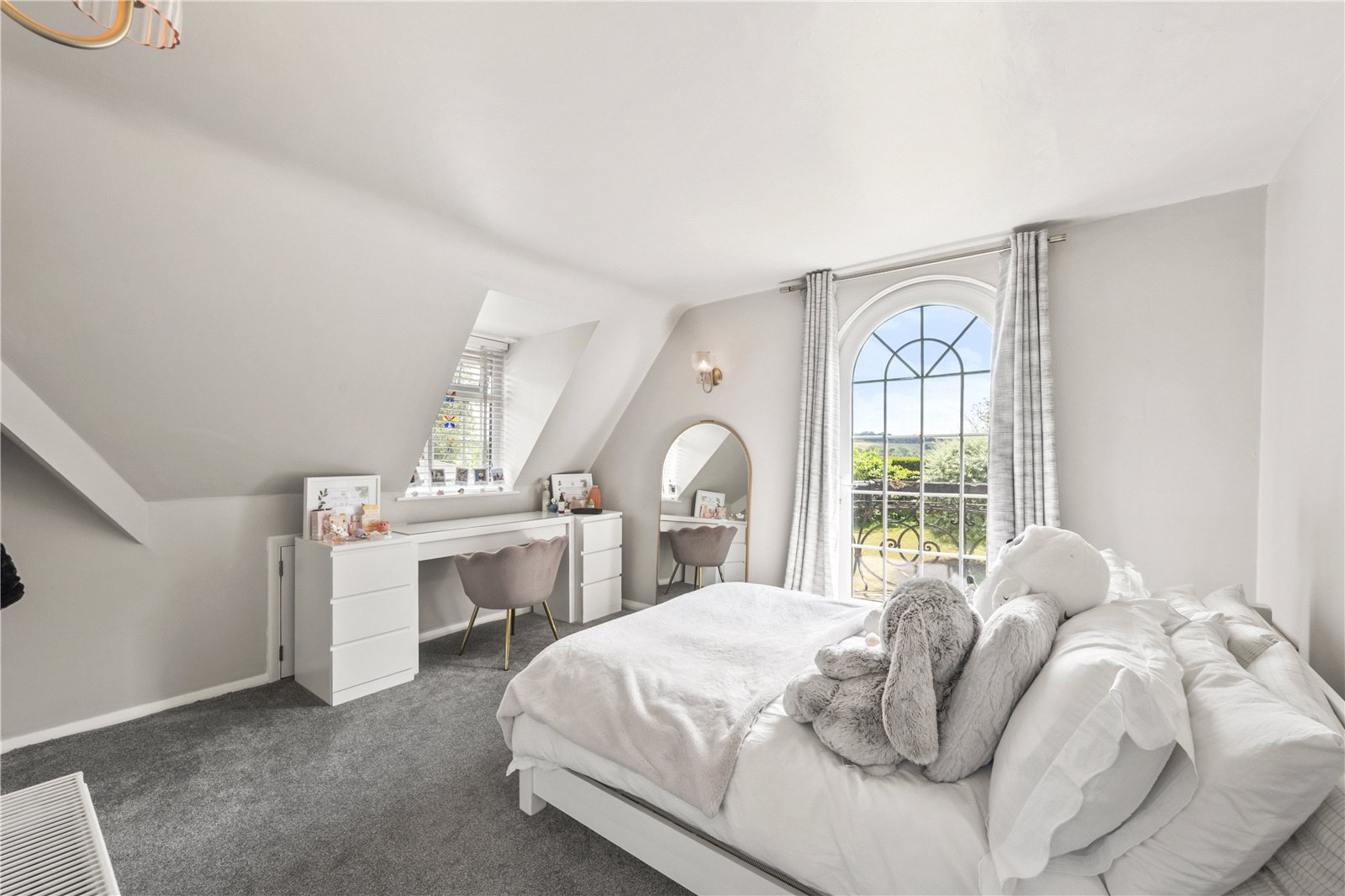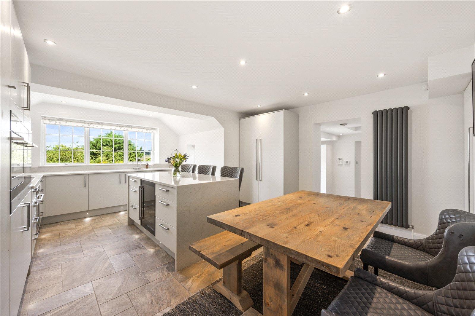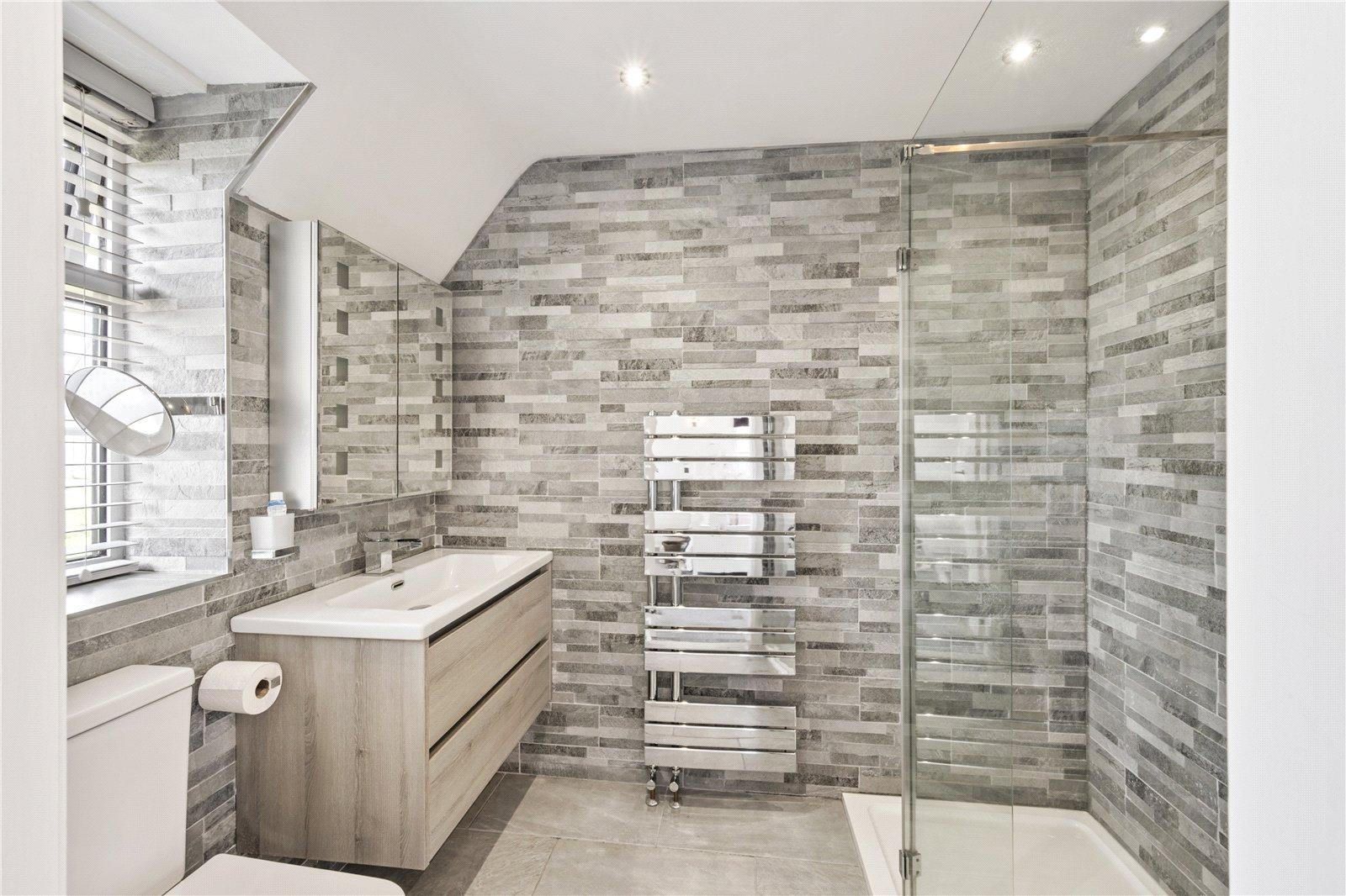 Upstairs, the principal bedroom benefits from countryside views and its own sleek en-suite shower room. Two further generous double bedrooms each enjoy built-in wardrobes, with one featuring a Juliet balcony overlooking the garden. These are served by a stunning house bathroom. A further spacious double bedroom occupies the top floor, with built-in storage and has beautiful countryside views.