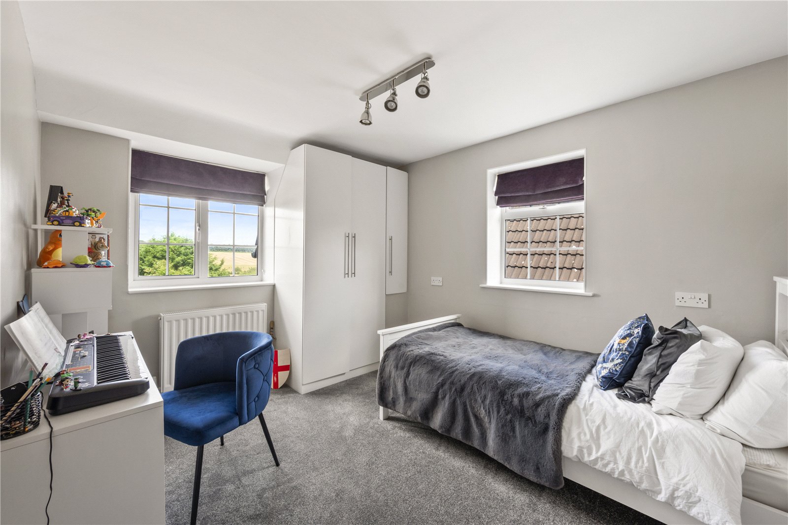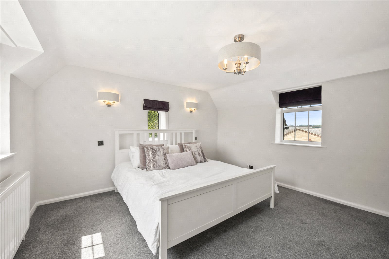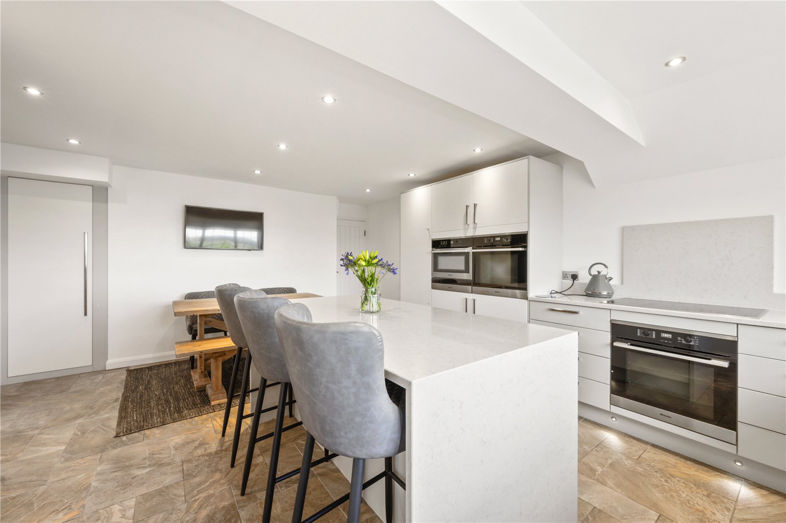 Upstairs, the principal bedroom benefits from countryside views and its own sleek en-suite shower room. Two further generous double bedrooms each enjoy built-in wardrobes, with one featuring a Juliet balcony overlooking the garden. These are served by a stunning house bathroom. A further spacious double bedroom occupies the top floor, with built-in storage and has beautiful countryside views.