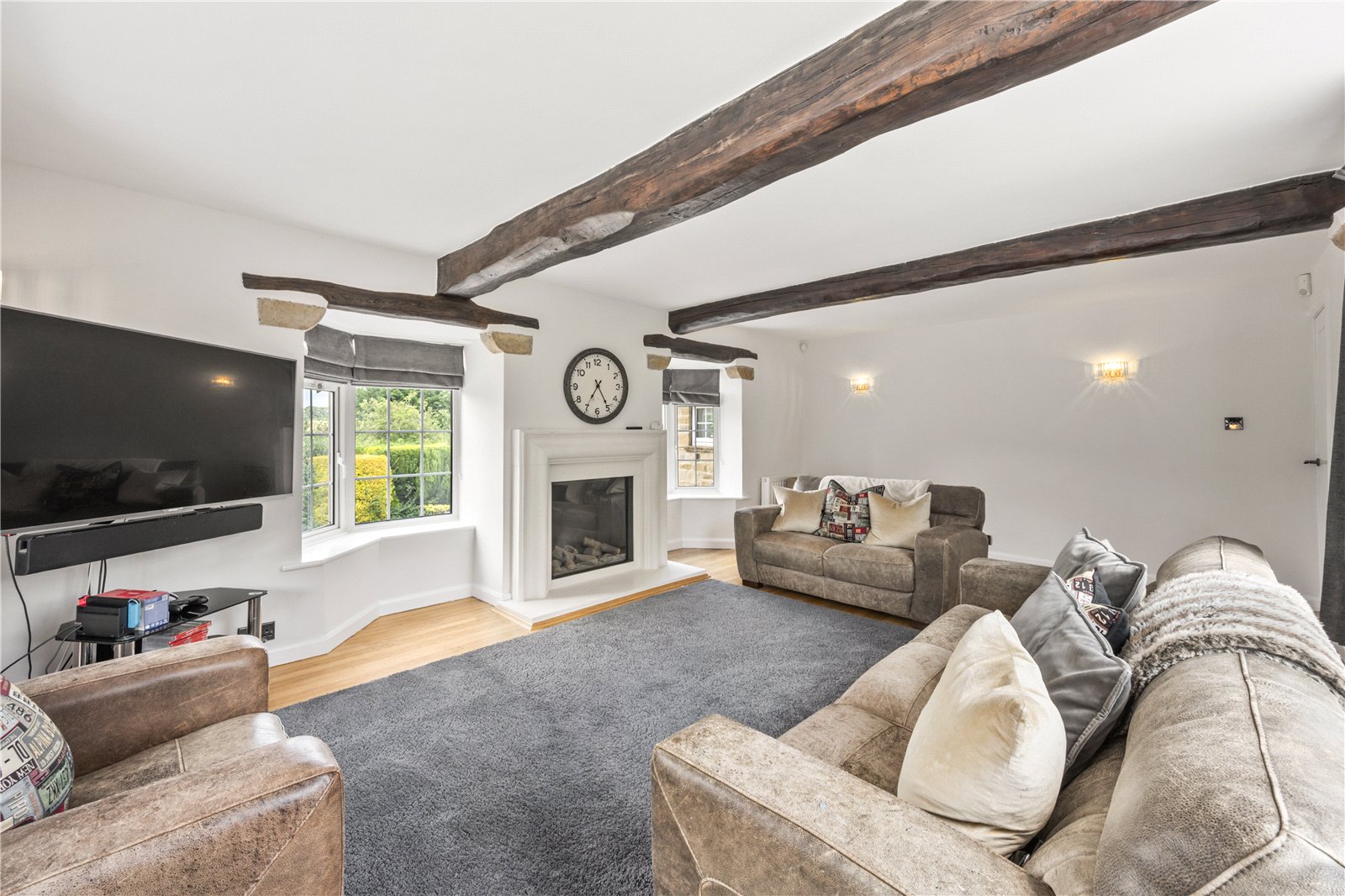 Internally, the home is well-appointed throughout and begins with a welcoming entrance hall, guest W.C., and a spacious living room complete with character features including exposed beams, and a modern fireplace. A separate study/snug provides a perfect space for home working, quiet relaxation or as an additional bedroom.