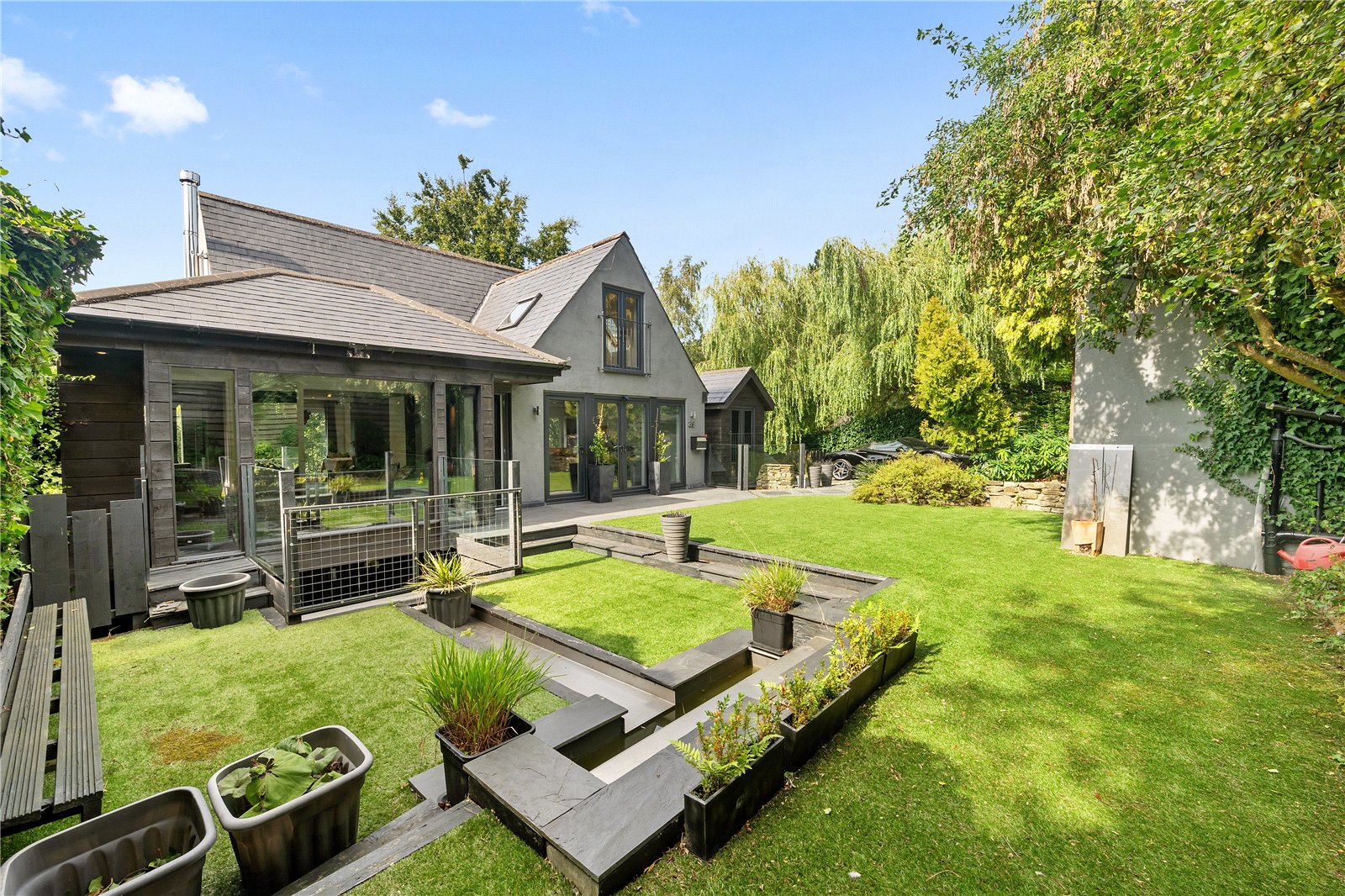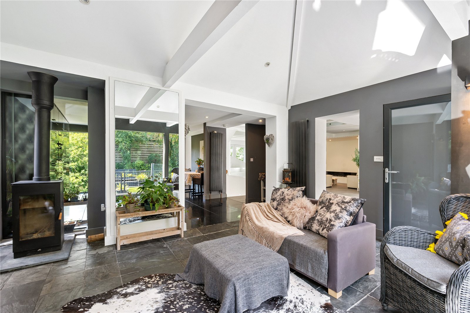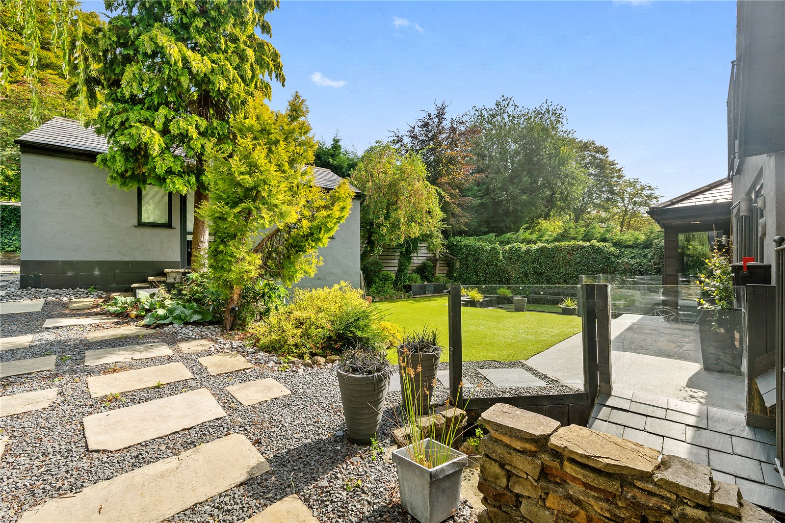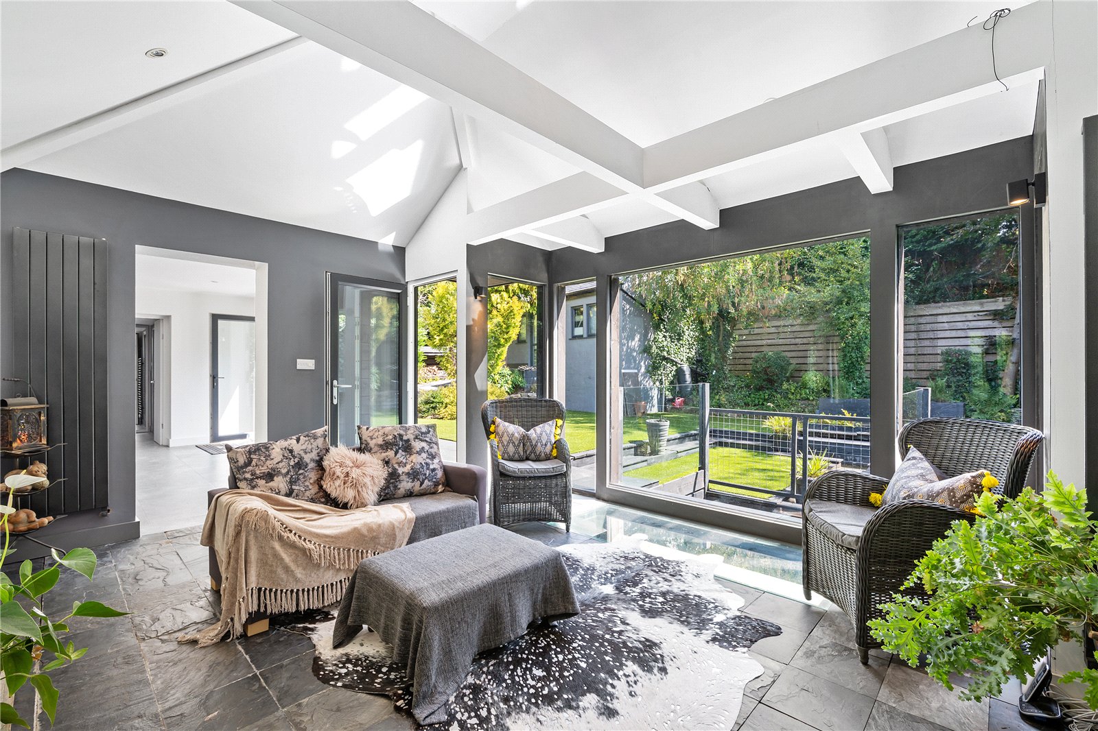 The modern kitchen features integrated appliances, a central breakfast island, and a Juliet balcony. Open-plan access leads into the dining area and through to the stunning garden room. This relaxing space enjoys a tranquil water feature which can be seen through a glass floor, a cosy log burner, and direct access to the rear garden—perfect for entertaining or unwinding. A utility room and a guest W.C. complete the ground floor.