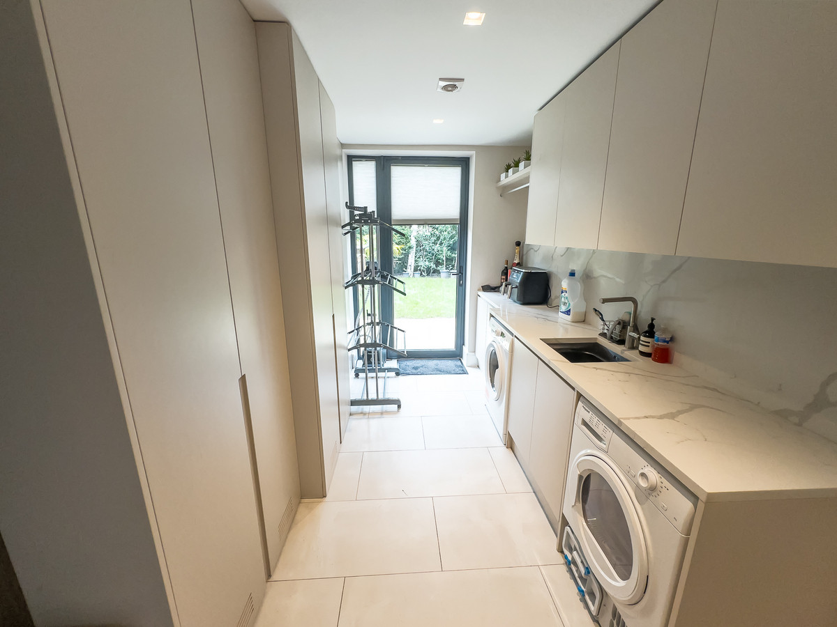 The extremely spacious living kitchen dining area is simply breathtaking and is the hub of the home, a separate utility rooms leads to the rear garden where there is a further outbuilding to the rear which is now a gym. The luxury kitchen with island and abundance of space for dining and lounge area also has a bespoke media wall and inset gas fire.