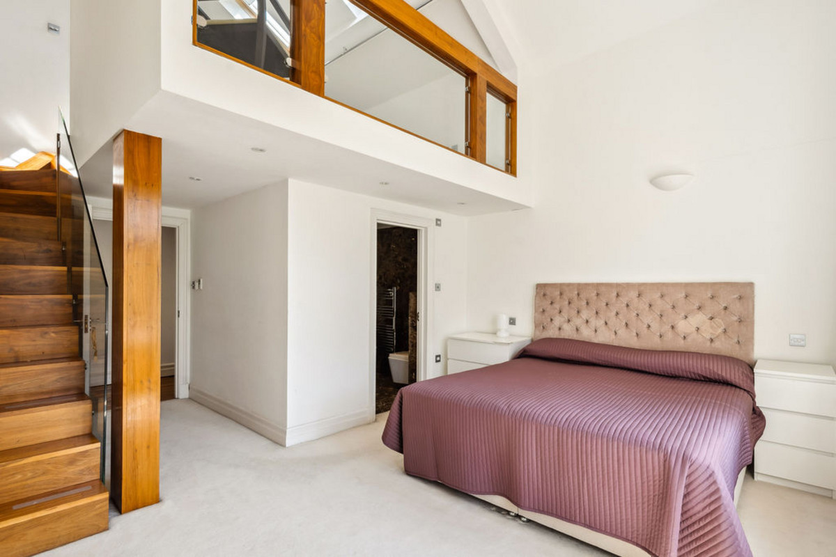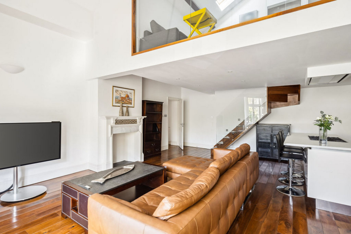 A generous open-plan reception boasts wooden flooring, a characterful bay window, and an ultra-stylish bespoke kitchen, forming the heart of this sophisticated home. Above, a mezzanine level—accessible via feature stairs—lends itself perfectly as either a third bedroom, home office, or snug reading nook. The principle suite impresses with an en-suite bathroom and a mezzanine dressing room, offering abundant storage and a luxurious, boutique feel. A second double bedroom and family bathroom complete the versatile accommodation.