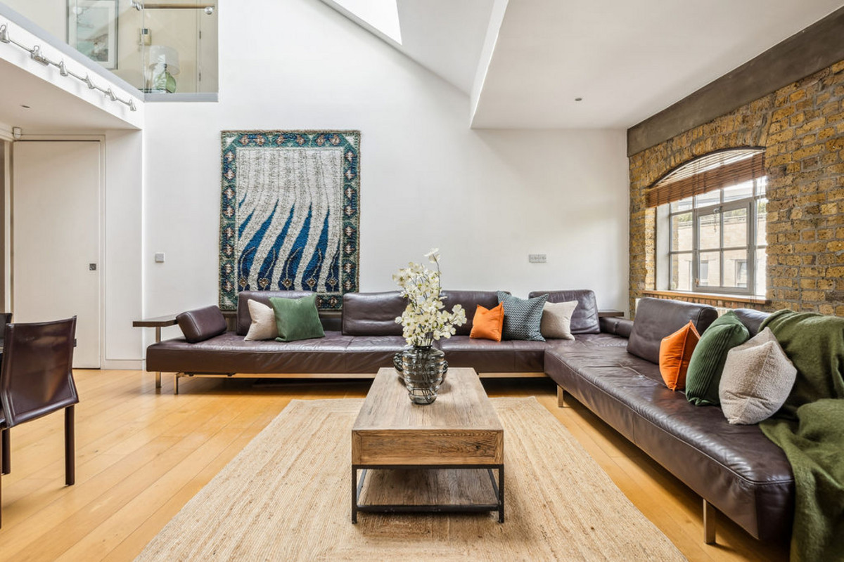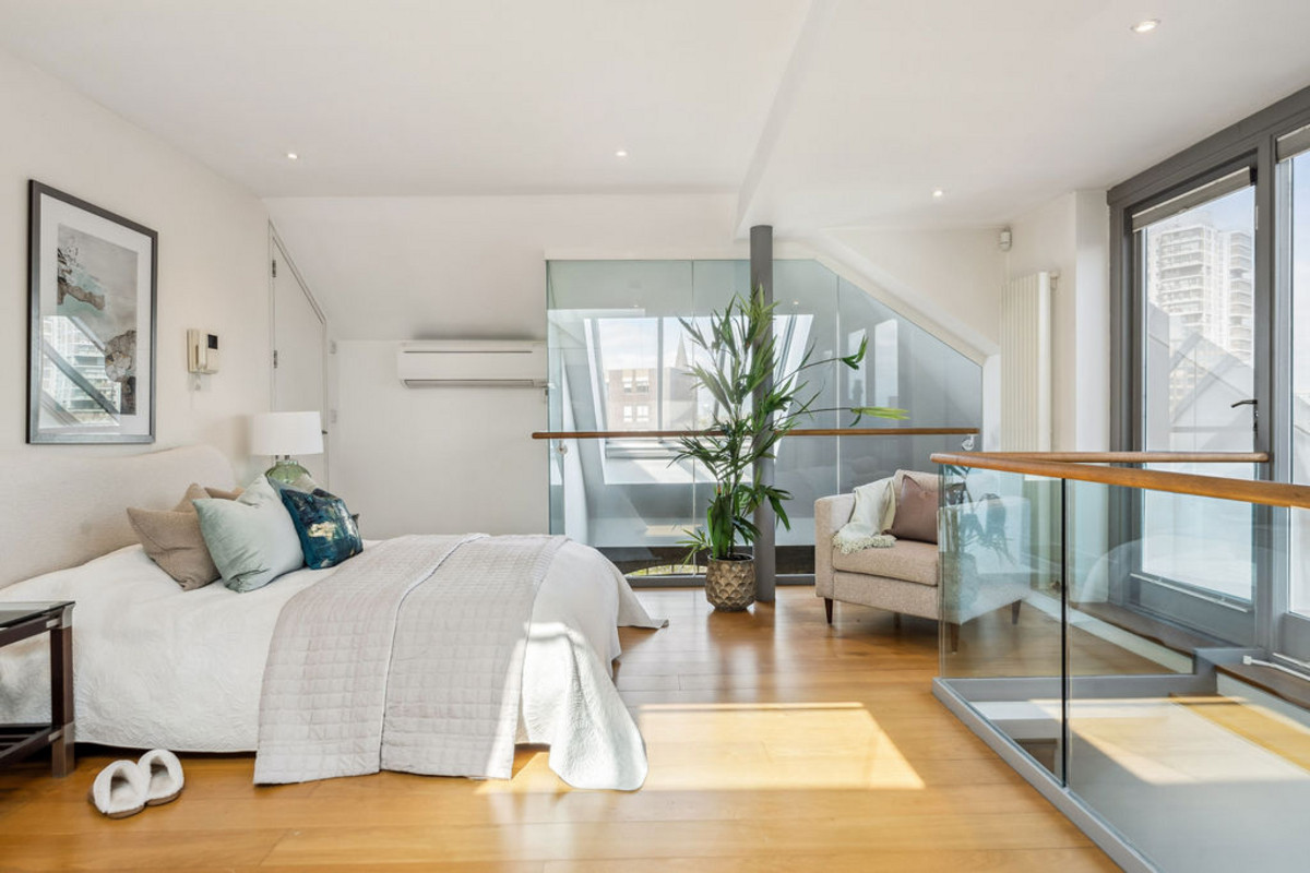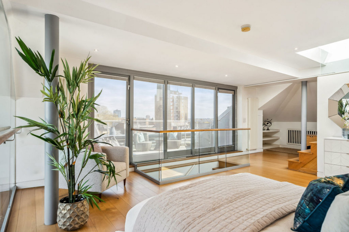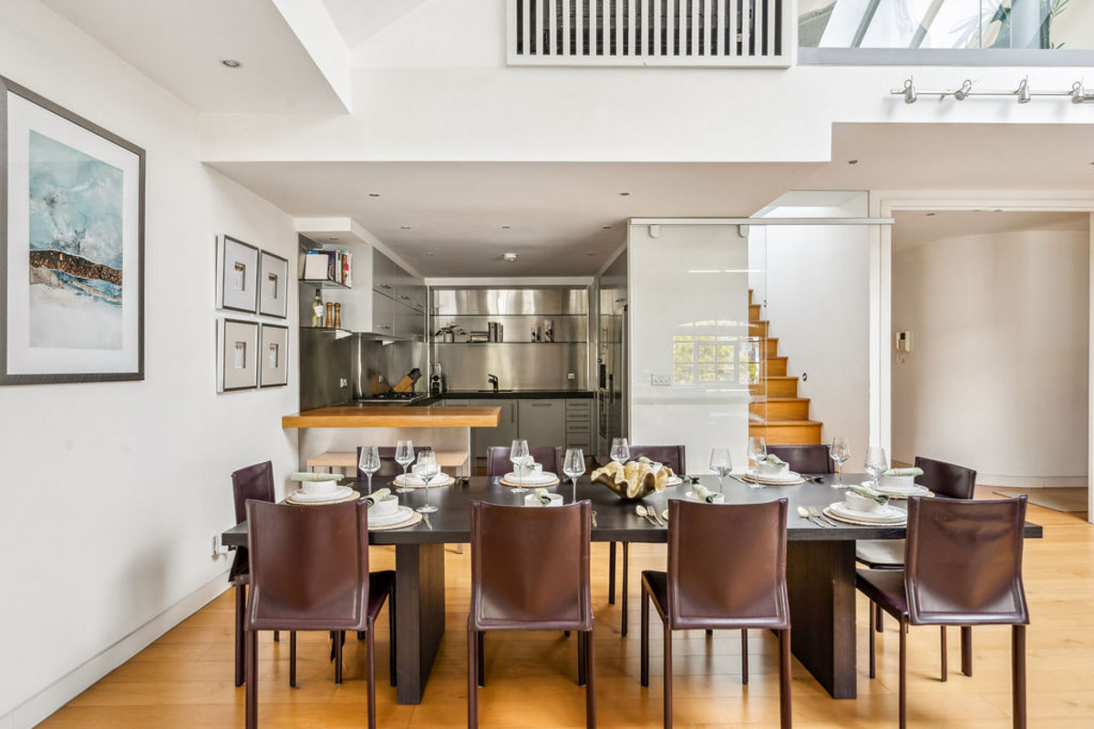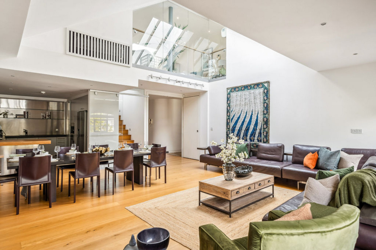 - Landmark duplex penthouse in a converted warehouse on Battersea Square.