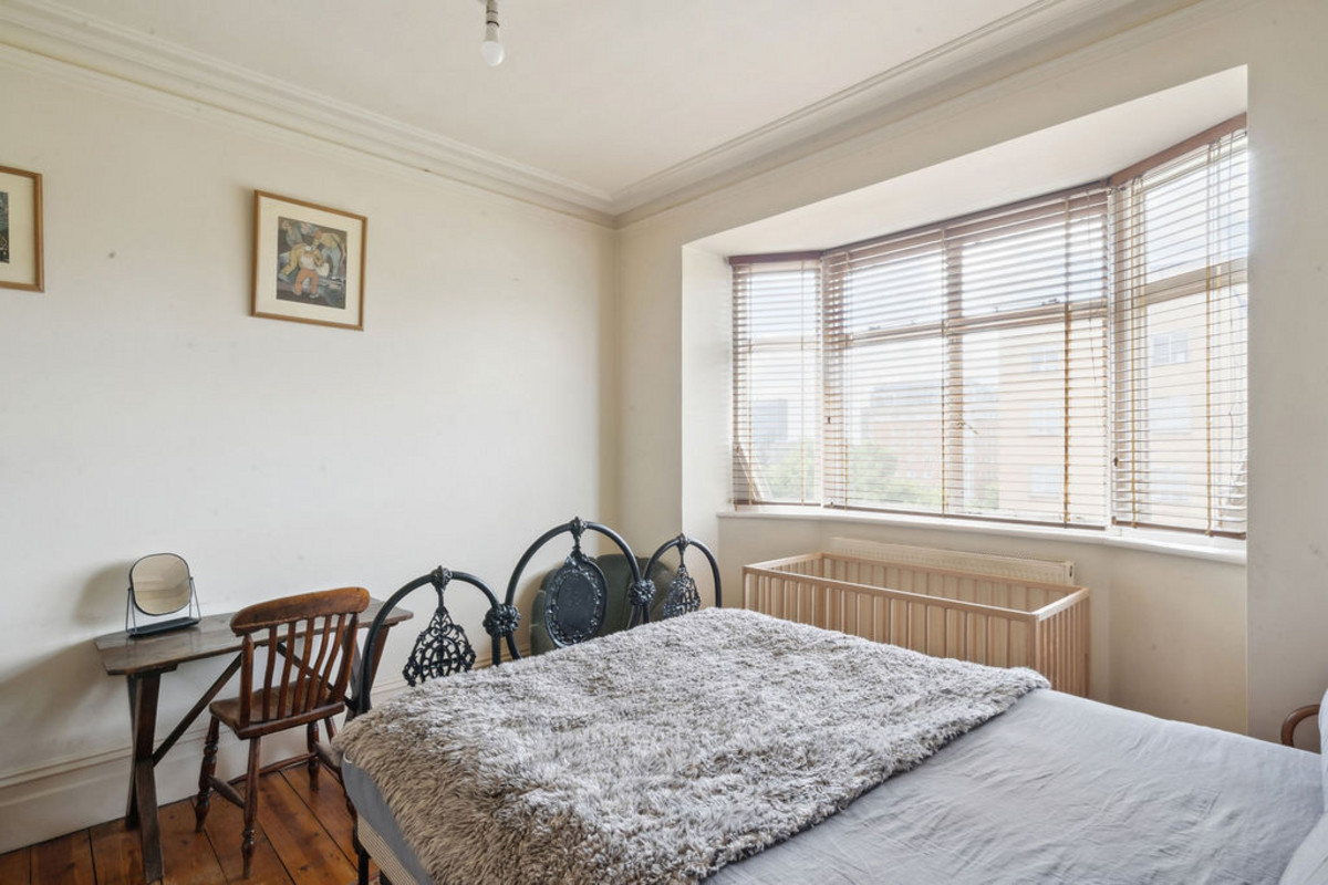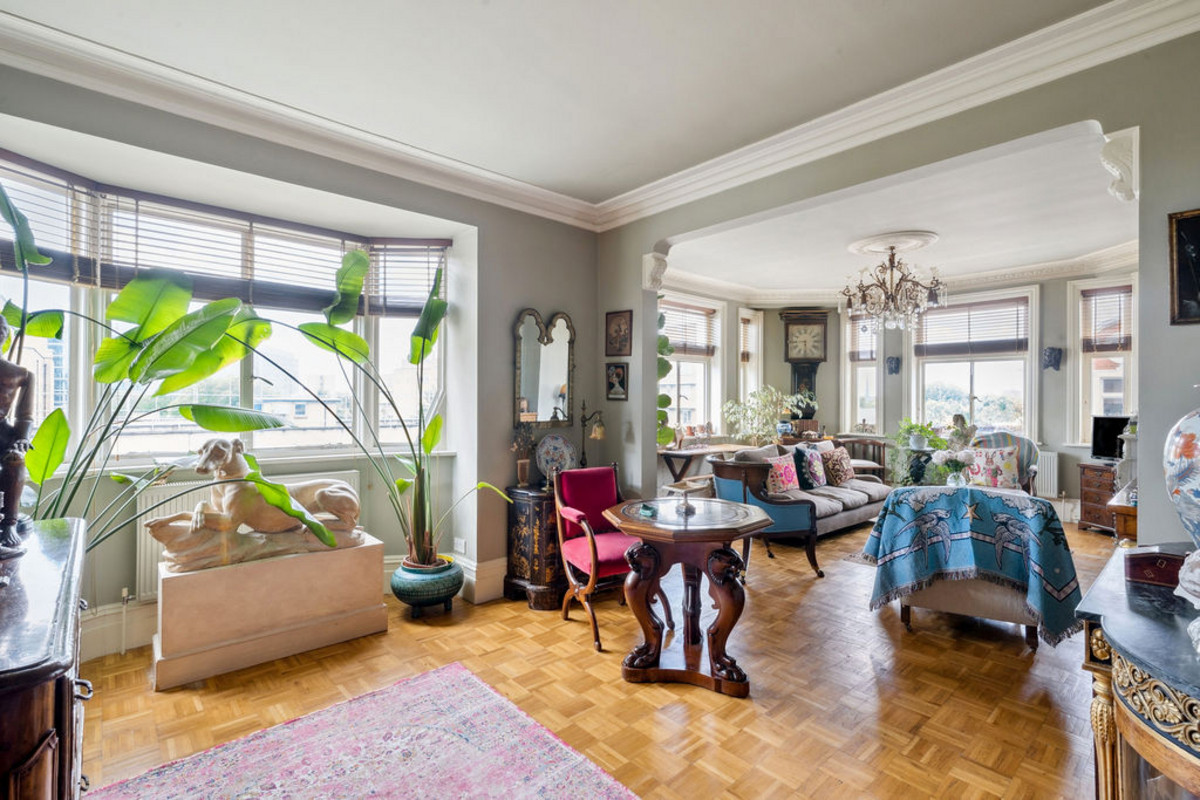 Crowning the handsome red-brick façade of St Mary’s Mansions, this rare top-floor corner apartment spreads gracefully across about 1,655 sq ft of lateral space, its large sash windows drawing daylight from three directions and framing wide, open views over the characterful rooftops of Little Venice. Step through the spacious entrance hall and the sense of volume is immediate: an elegant 29-foot, dual-aspect reception runs front to back, perfect for grand gatherings yet warm enough for quiet evenings by the original cast-iron fireplaces and ornate cornicing. Just along the hall, an 18-foot kitchen–dining room easily hosts family breakfasts or supper for ten, with generous cabinetry and worktops arranged so the cook can still join the conversation.