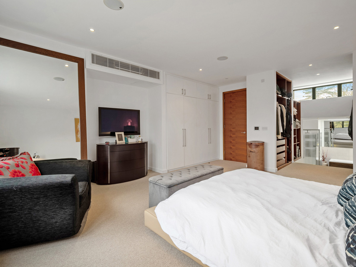 Upstairs, four generously sized bedrooms—each flooded with natural light and equipped with fitted wardrobes and air conditioning—offer plenty of personal space. The principal suite occupies an entire wing, complete with a sophisticated dressing area and an ultra-modern bathroom featuring a separate tub and shower. A further guest suite and a well-appointed family bathroom complete this floor, ensuring every comfort is at your disposal.