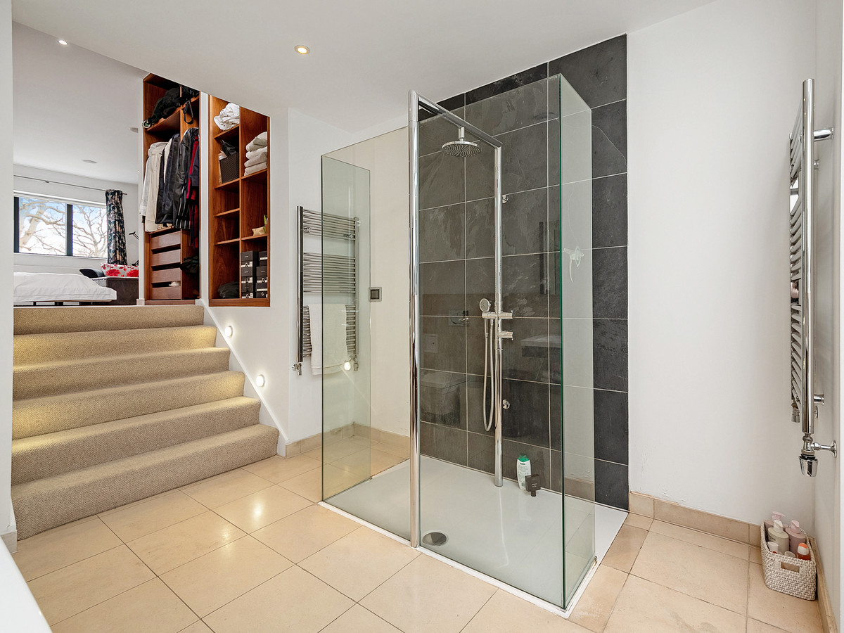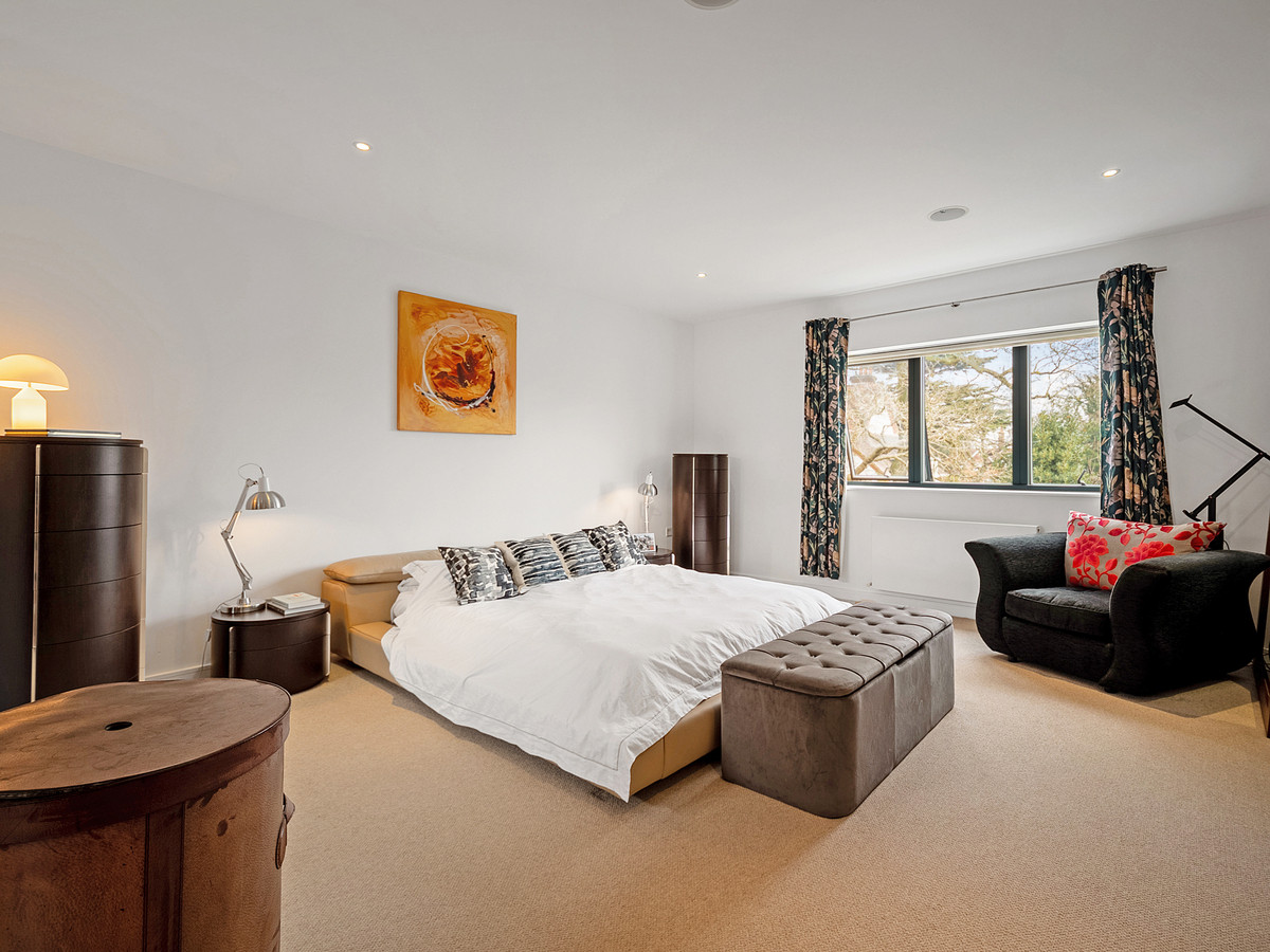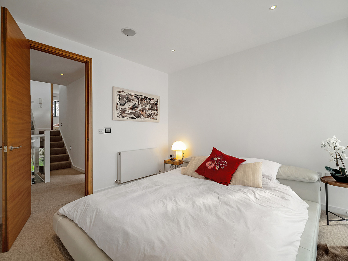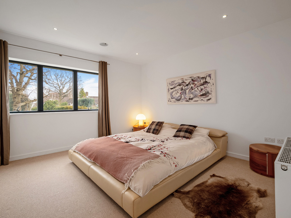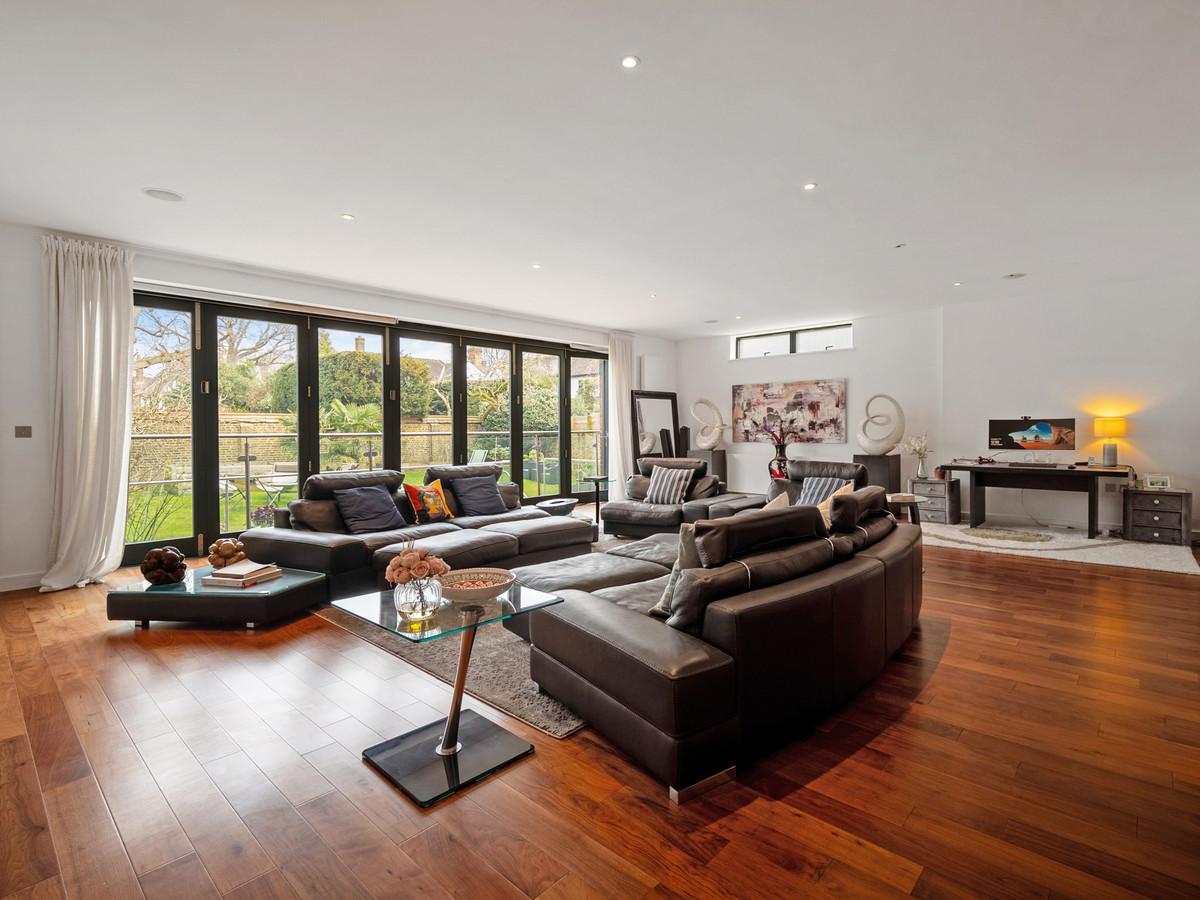At the heart of the home lies a contemporary, full-width kitchen showcasing integrated appliances, a stylish island, and a custom-built wine cellar. Bi-folding doors open onto the garden, creating a seamless flow between indoors and out—perfect for alfresco dining or lively summer soirées. A convenient utility room and a ground-floor guest bedroom with an en-suite shower ensure versatility for visiting friends or extended family.