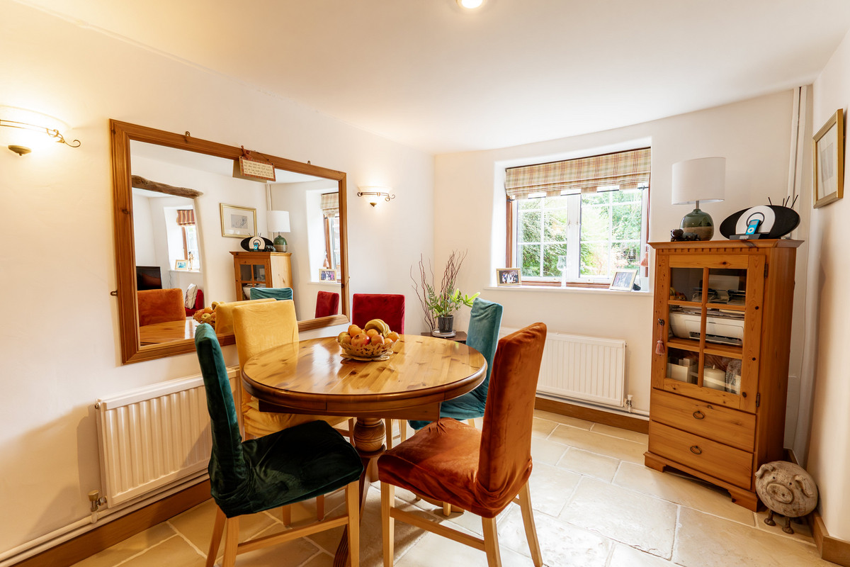 Inside, the cottage is filled with charm and natural light. A welcoming entrance lobby opens into a dual-aspect sitting room where a wood-burning stove is nestled within an original inglenook fireplace - an ideal spot for cosy evenings. The open-plan layout flows through to a front-facing dining room, while the rear of the house is home to a well-appointed galley kitchen with wood-effect worktops, decorative tiling and integrated appliances. A separate utility room completes the ground floor.