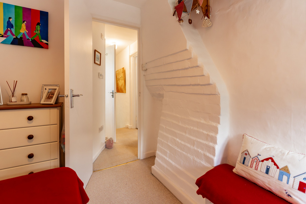 Upstairs, three well-proportioned bedrooms are served by a stylish, recently upgraded family shower room featuring underfloor heating. The principal bedroom is notably bright thanks to its dual-aspect windows and includes built-in wardrobes. The second bedroom, a comfortable double, enjoys a front outlook and access to the loft, while the third bedroom is a generously sized single with views over the side garden.