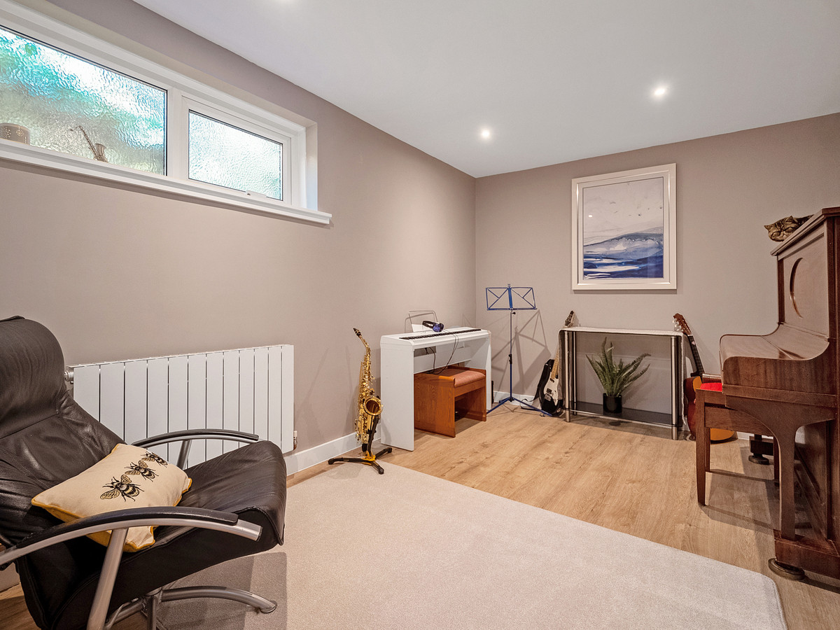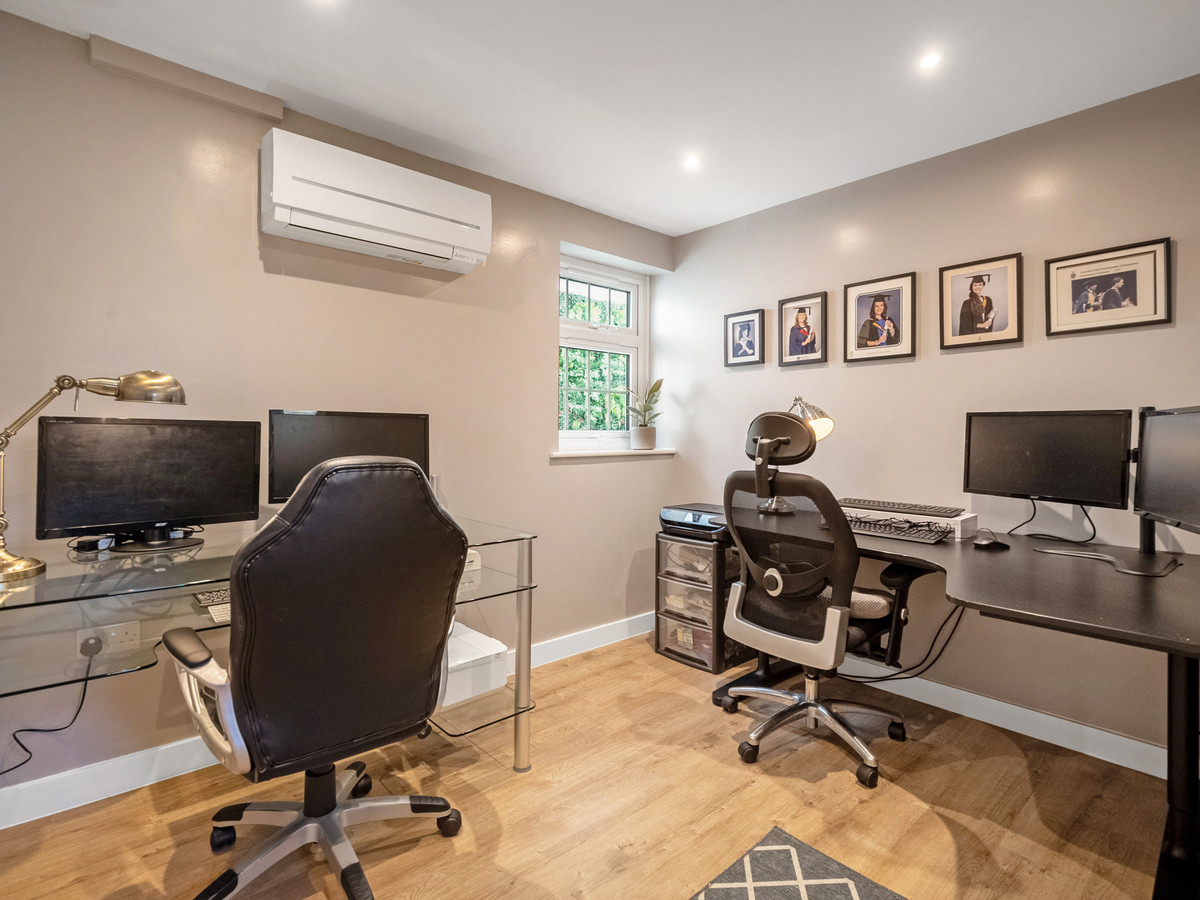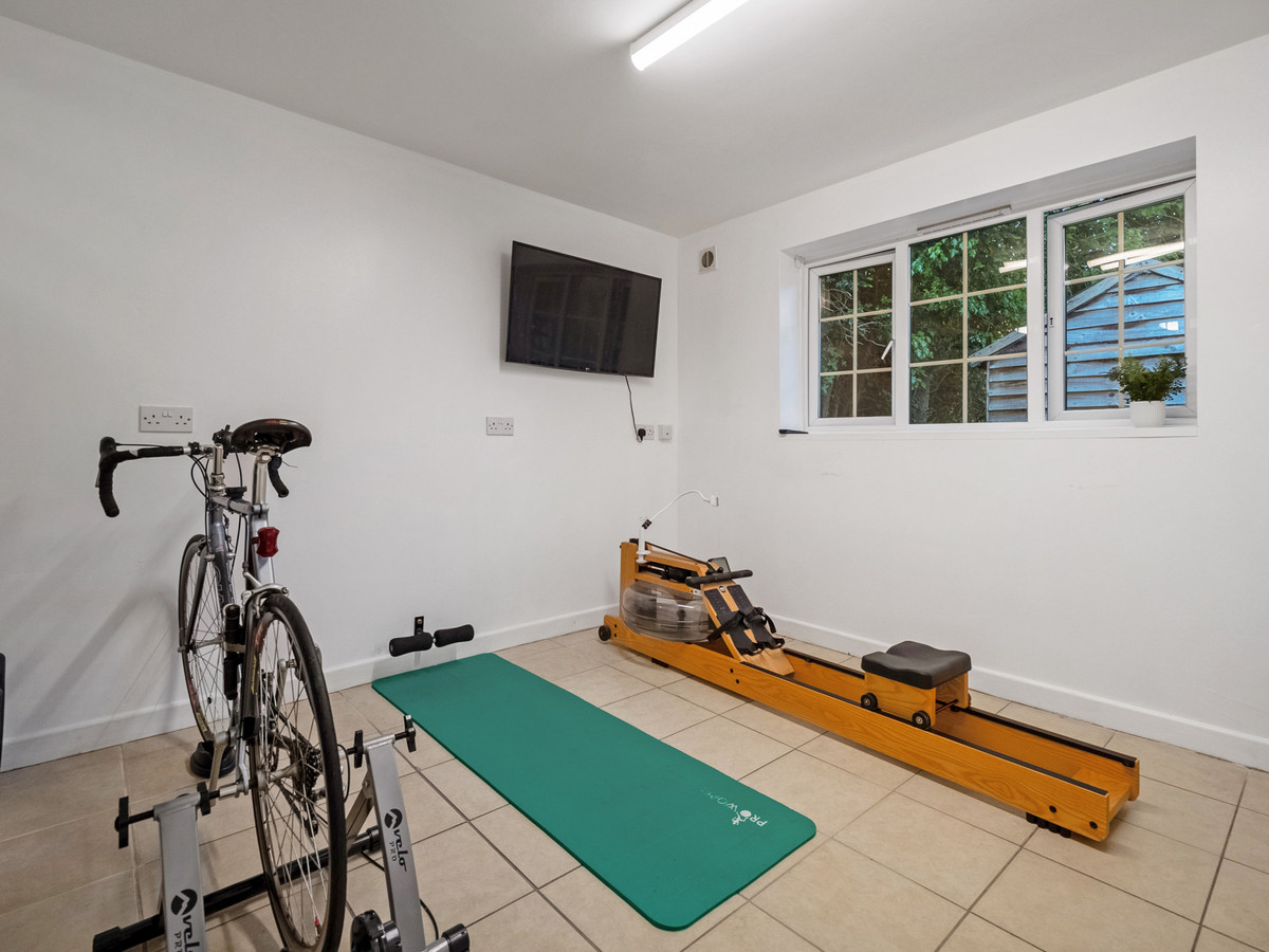Further living spaces include an elegant sitting room, a music room, a study for two and a ground-floor guest bedroom served by a spacious bathroom and guest cloakroom. A separate laundry room, home gym with en-suite, and additional outbuilding that is currently being used for a garden office and a games room.