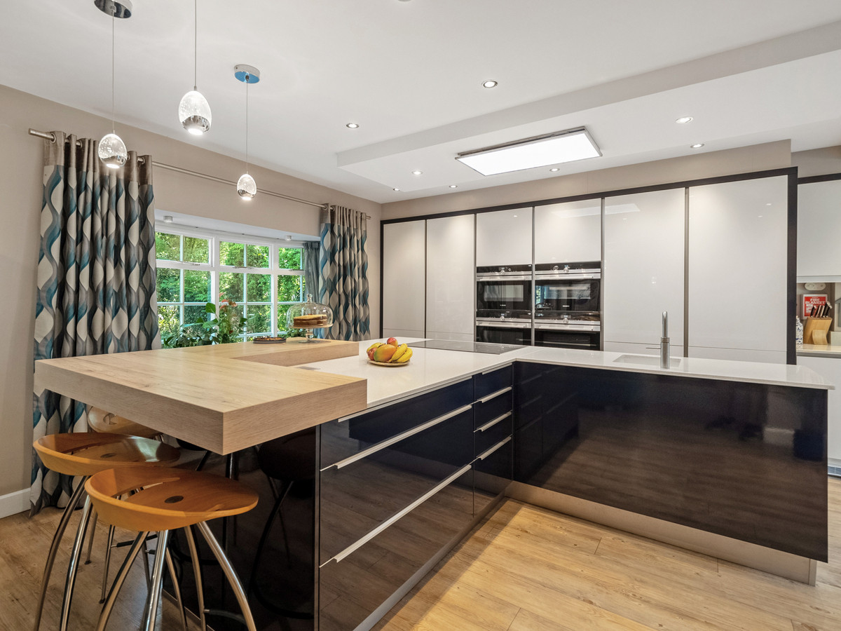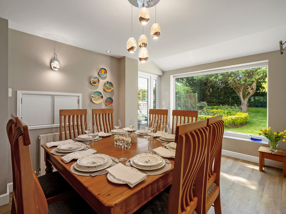 At the heart of the home is a striking open-plan kitchen/dining/family room, with panoramic views across the private, established garden - a cherished space for gatherings, celebrations, and quiet family moments. The well-appointed kitchen features a central island with induction hob, four ovens, a Quooker hot water tap, and a breakfast bar, all complemented by a large utility room.