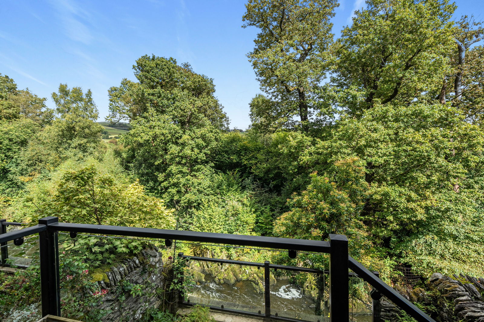 The outdoor space includes an enclosed rear terrace with paved patio. Offering captivating views of the river and countryside. Additionally, there's a decked patio accessible from the living room, leading down with steps.