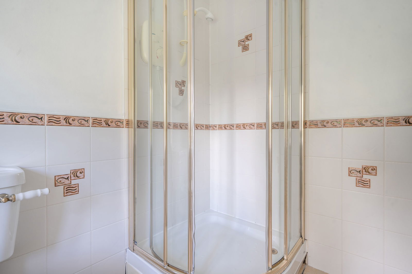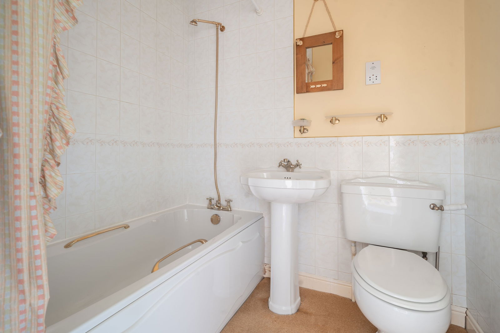 Completing the picture is the original family bathroom, with part tiled walls, WC, bath with shower over and pedestal wash hand basin.
