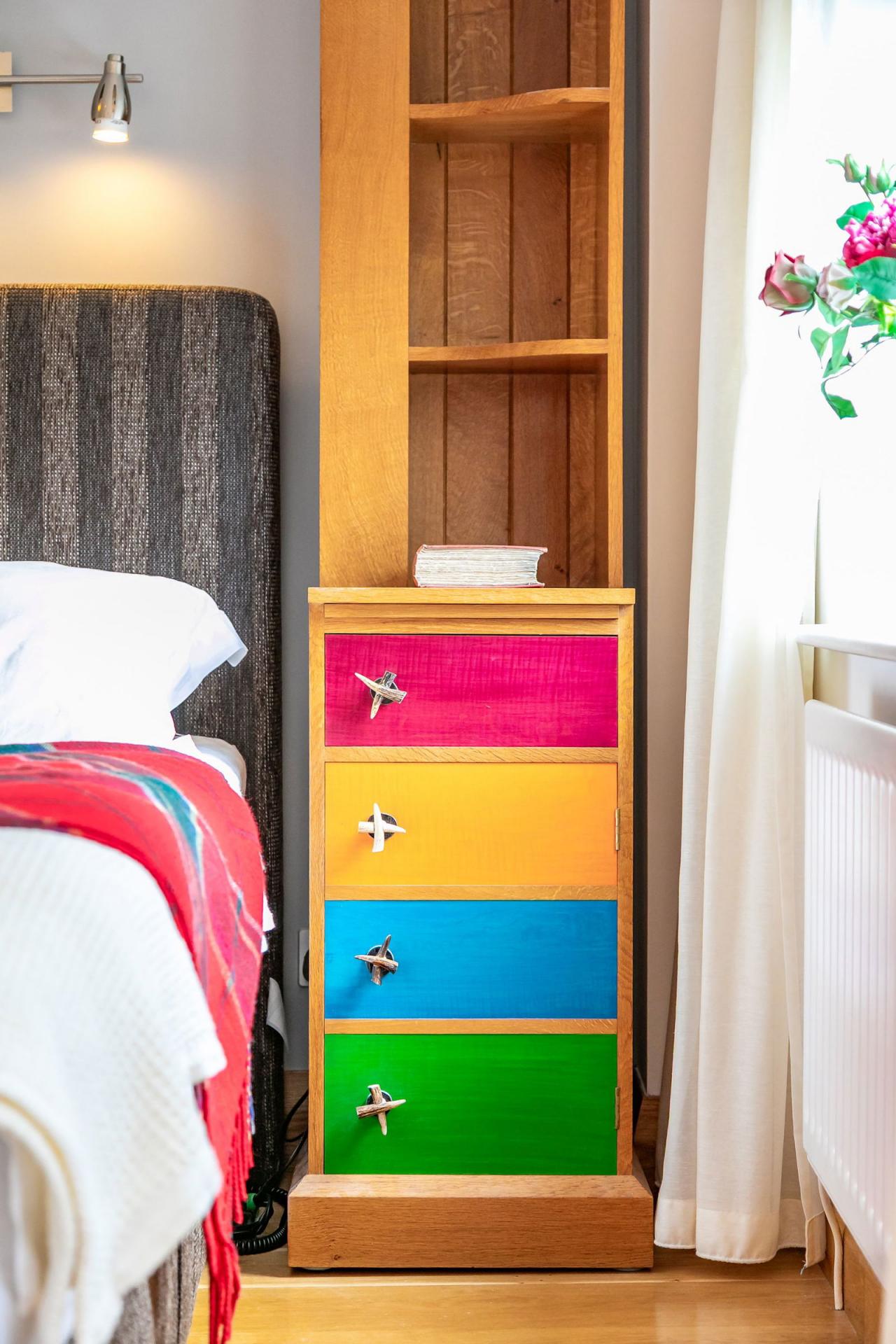 The proposed separate kitchen, sitting and dining rooms were combined to create one large and very impressive open plan living space. This most sociable of rooms has doors opening to a long, covered balcony which commands direct views over the River Kent’s weir and rockpools to the estate’s private golf course with the fells in the background. The gentle soothing tones of the water create a restful soundtrack to life here. The living area is further enhanced by a pair of oak framed colourful internal glass panels, one depicts the history of the paper mill over the years and the other highlights the wildlife and countryside setting of the development. The panels may be viewed from different angles and particularly striking in the evening as they are illuminated from above. Design inspiration was taken from Scottish architect Charles Rennie Mackintosh when the statement fireplace was built, incorporating fender seating, it creates one of several distinct seating area within this overall generous floor space. The distinct lighting within the living area was commissioned to complement the overall aesthetic of this remarkable apartment.