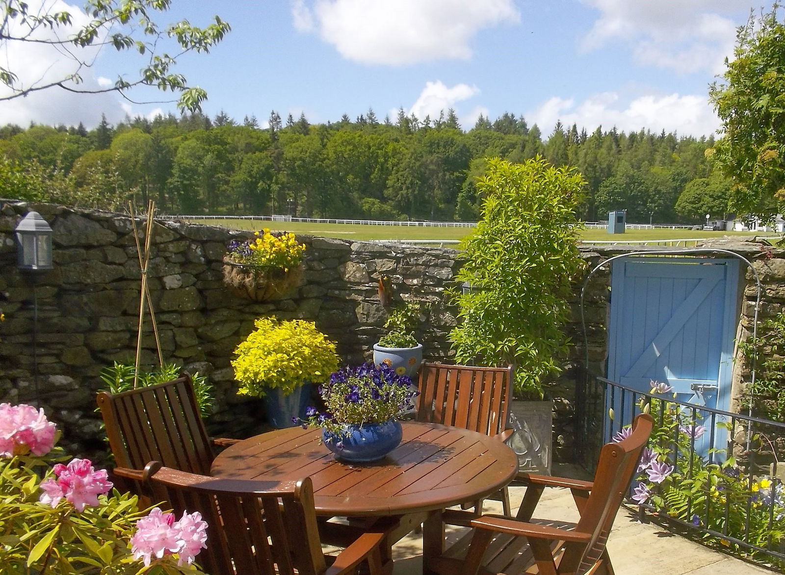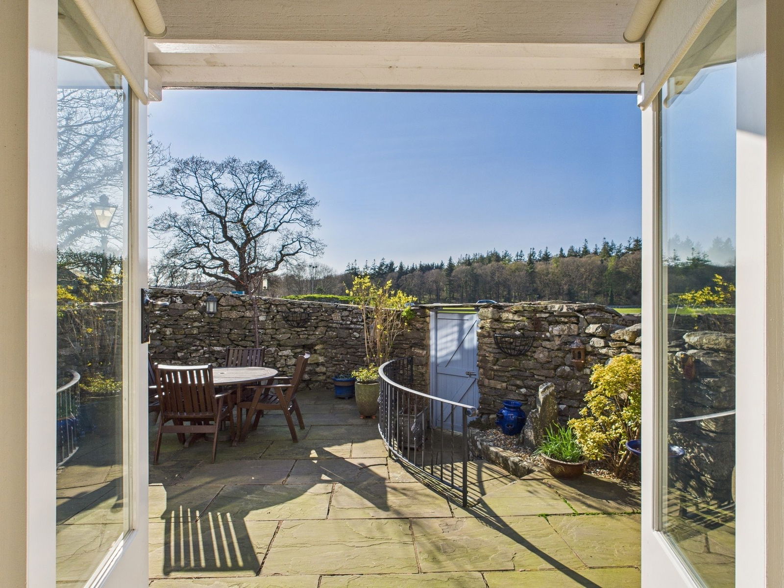 The walled courtyard has been laid with Indian sandstone flags to reduce upkeep to a minimum. It has just the right amount of space to accommodate an outside dining set as well as some more relaxed seating or a bench under the slight roof overhang of the garden room. A short flight of steps lead down to a tall wooden gate which opens to the grass on the side of the beck – an alternative vantage point for cheering on the racing action. A second tall wooden gate provides pedestrian access onto the lane and is handy if you are