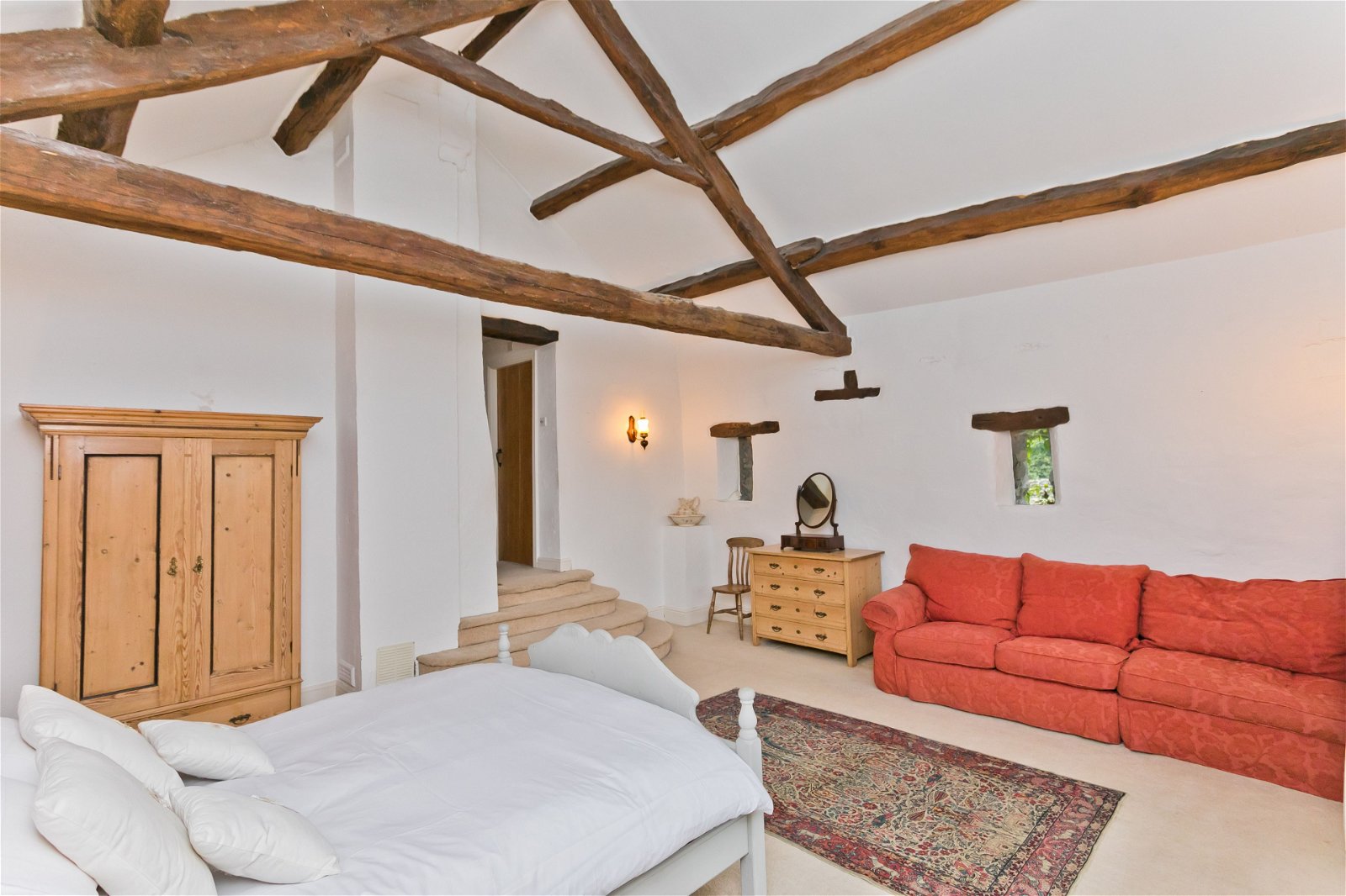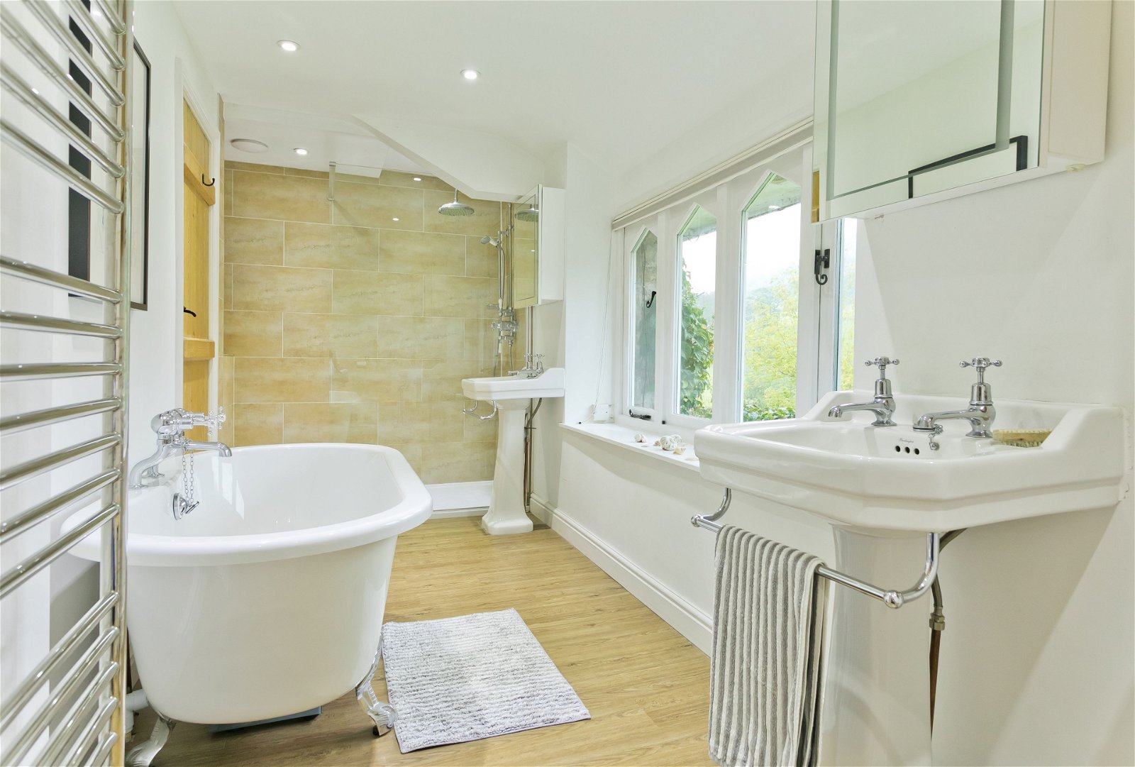 The staircase leads up from the entrance hall, opening out onto a large landing. This space was previously sectioned off as a further bedroom but has now been opened up to create a selection of full length built in storage cupboards however could easily be restored to a bedroom if required. At present, the first floor provides a choice of four double bedrooms, of which one benefits from an ensuite and there is also a modern family bathroom. Each room enjoys a unique snapshot over the surrounding countryside that stretches out across the fields of the Winster Valley to the distant fells of the Lake District. The master bedroom is situated within what would once have been the hayloft of the barn and thus enjoys high vaulted ceilings with original exposed wooden trusses and ceiling beams. The plaster work has been left rough in homage to its original heritage, so coupled with the triple aspect of stunning views, it is truly an idyllic country house master suite. The modern yet traditional style family bathroom is set as a Jack 'n' Jill to the principal bedroom and includes a good sized walk in rain shower and a Burlington freestanding claw-foot bath. It is the generously proportioned fourth bedroom located above the garage extension that benefits from an ensuite bathroom.