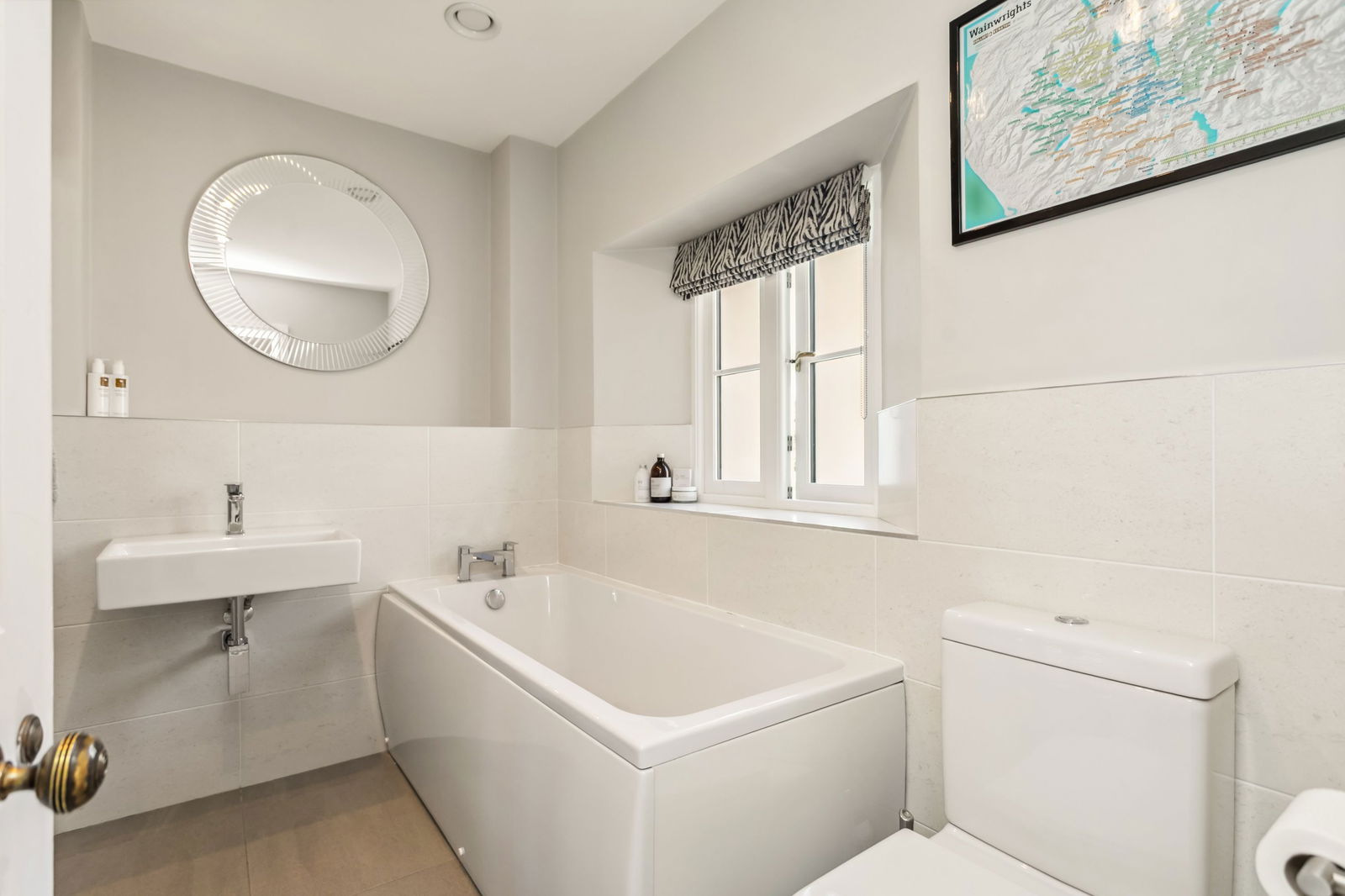 The family bathroom has both bath and a separate large rainfall shower, together with a floating wash basin and loo. The bathroom and ensuites feature chrome heated towel rails and ceramic tiled floors.