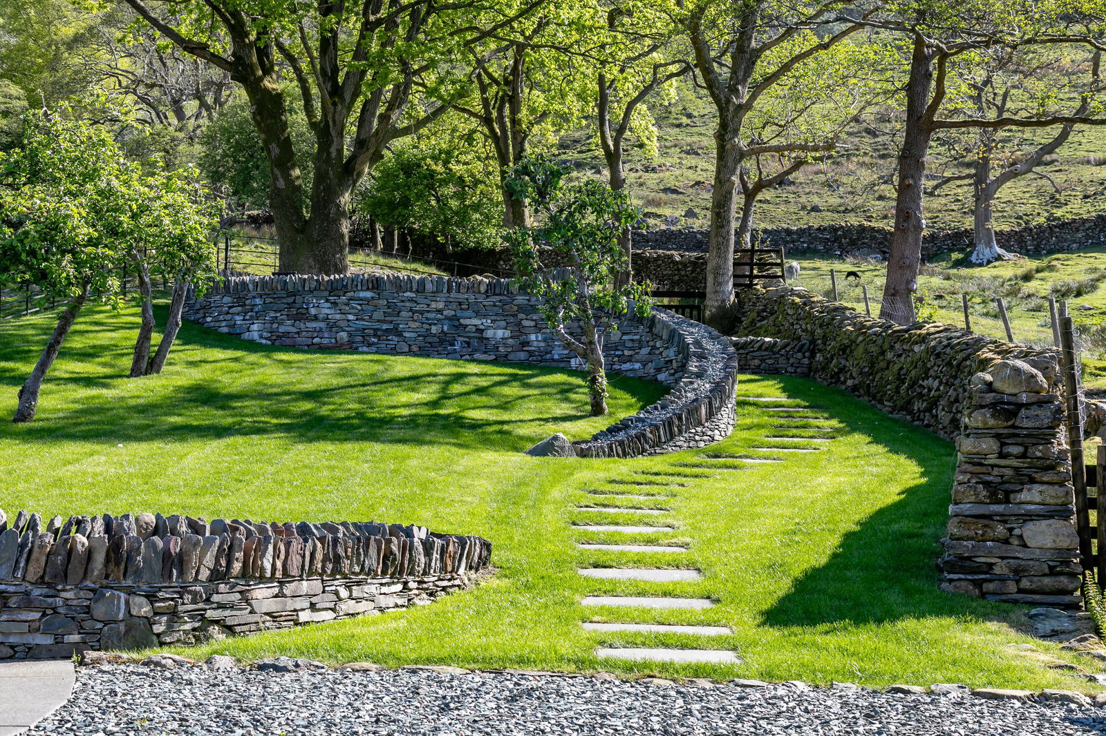 The main garden is approached over a charming Lakeland stone bridge which crosses a small stream as it flows down to the lake. Once across, there is a striking pair of circular stone walled seating terraces, reminiscent of sheep enclosures on the upland fells, these provide definition, privacy and shelter and are both contemporaneous and deeply traditional at the same time. The higher terrace has a built-in curved slate bench, take up some cushions, light a fire pit and you’re ready to go. From up here, under the dappled shade of the oak tree, you’ll be able to enjoy the restful sound of the passing beck as it flows down through the garden.