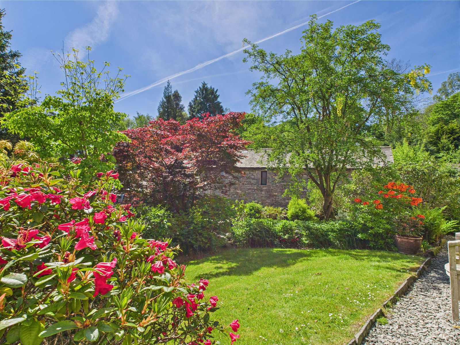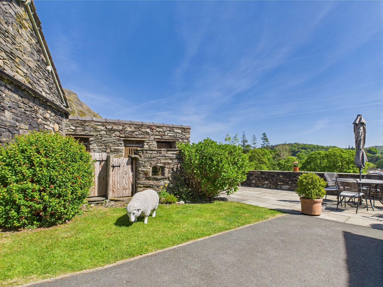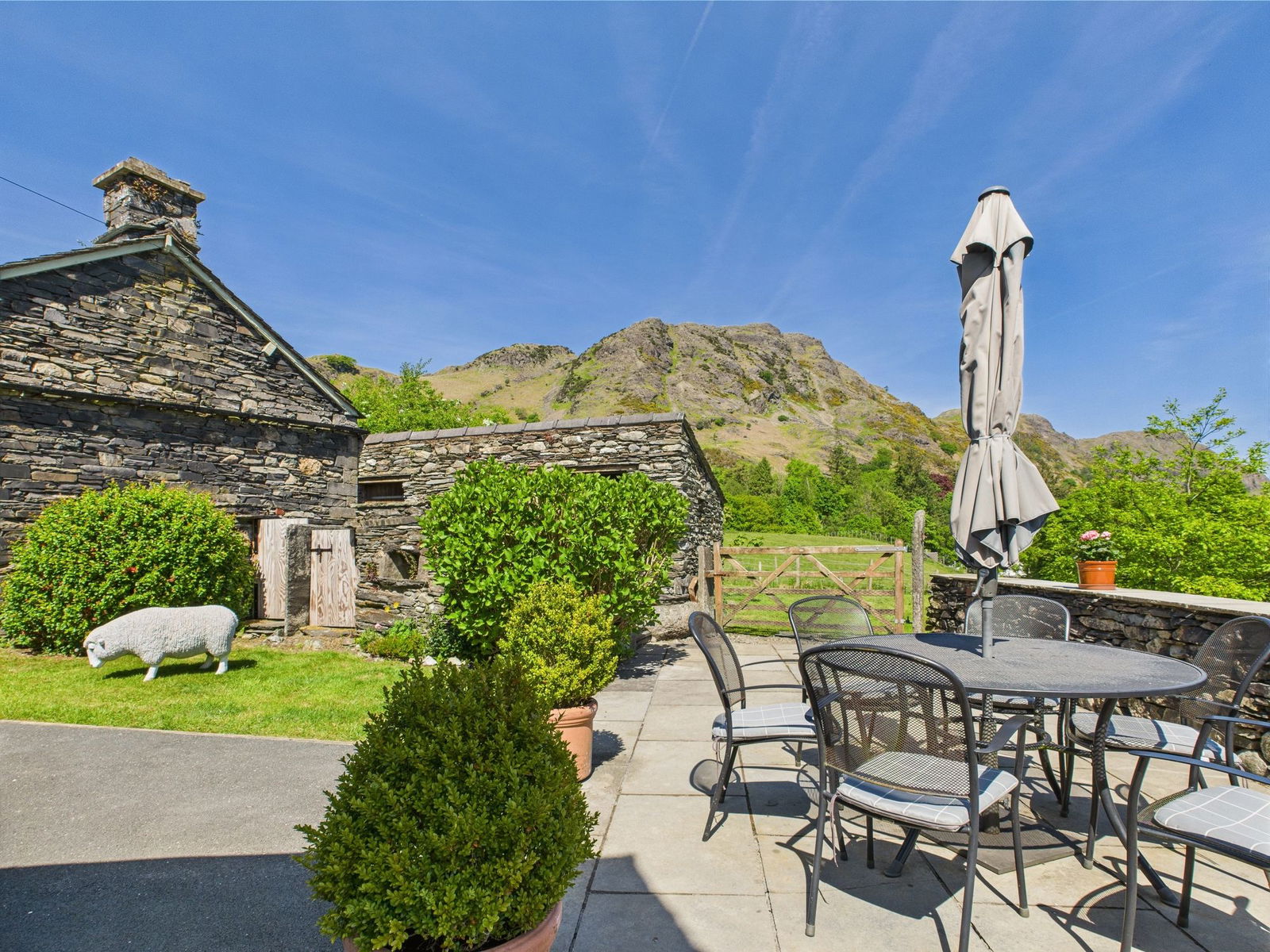 Cottage style gardens lay to the south of the farmhouse with well established colourful planting including azaleas, acers, camellias, peonies, roses and foxgloves. Paths of slate chippings run under the front windows and offer opportunity for bench seating. The path leads round to the side and then into rear farmyard. This is the main seating area, a sunny terrace with great views over the village to the fells beyond. Many comments left in the visitors’ book refer to the views, it’s easy to see why, they are incredibly restful. The hustle and bustle of the village below you seems a world away. The immediate garden is all walled, fenced or gated to be secure for children and dogs. However, beyond this there is a further garden area, a mowed lawn for picnics and play, adjoining this a delightfully informal meadow punctuated with flowering shrubs. A lovely area for exploration, spotting wildlife, nature appreciation, making dens, treasure hunts and games of hide and seek.