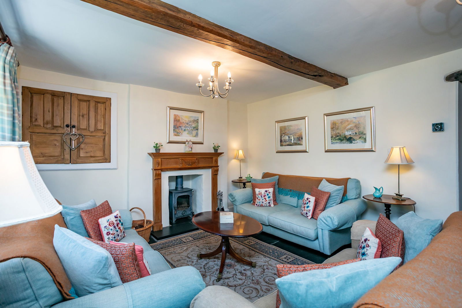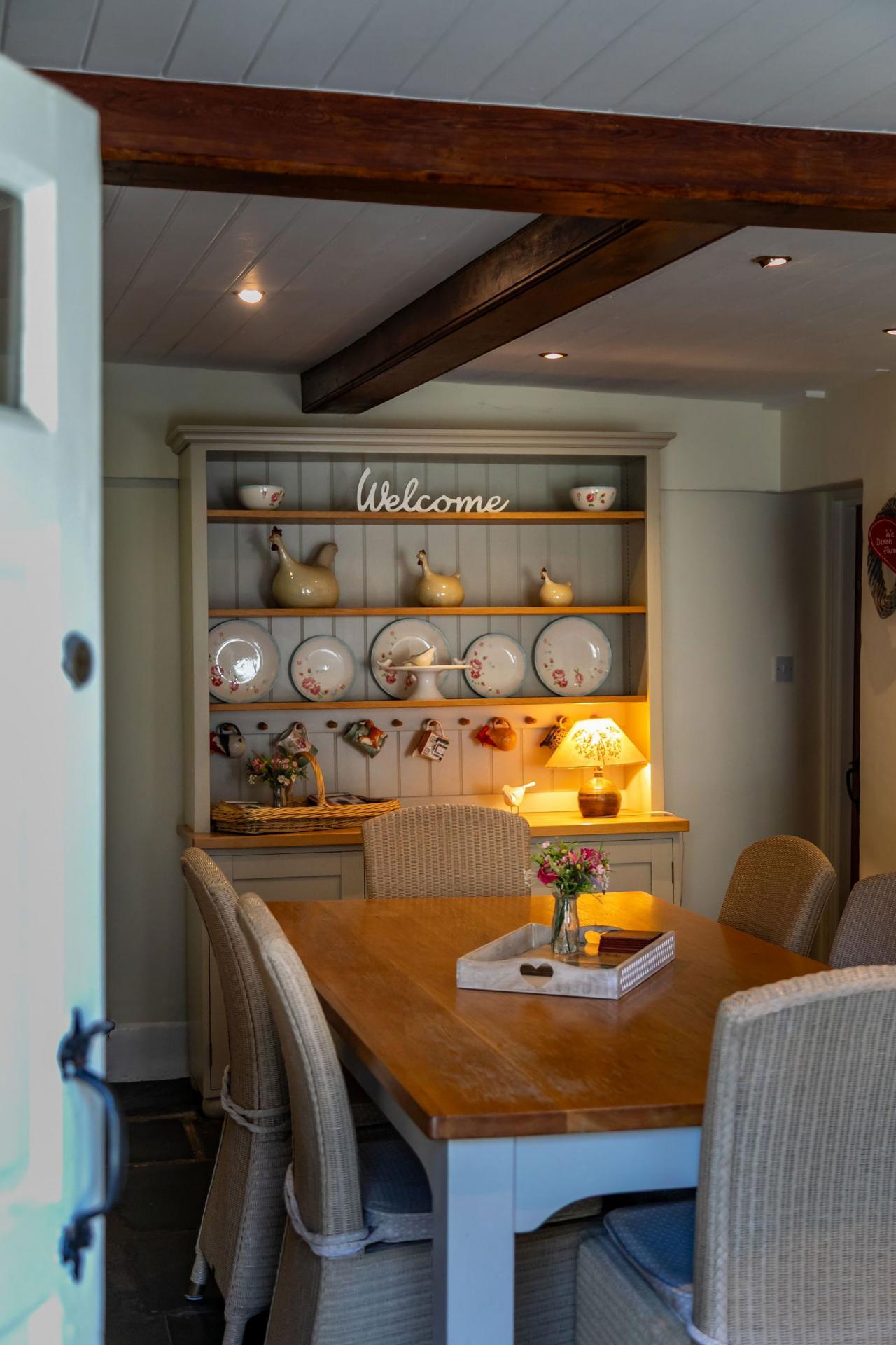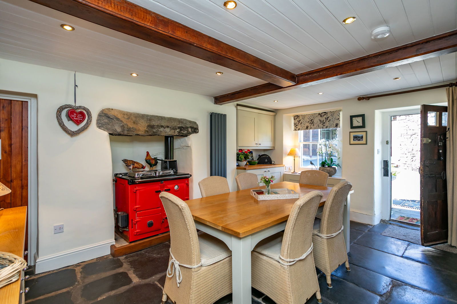 Exceptionally picturesque, the farmhouse has a striking cast iron decorative gabled porch adorned with scented honeysuckle and jasmine. The wide front door is unusual and opens into the sitting room which has a slate flagged floor. This continues into the staircase hall, dining room and kitchen. Between the sitting room and the snug is a plank and muntin partition with fielded panels and a panel door connecting the two. Ramping up the cosiness of this charming property are the woodburning stoves, the sitting room has an intricately carved pine fireplace with an alcove cupboard cleverly concealing the TV’s modern technology. The snug has a more rustic fire surround that’s no less characterful. The dining room has a cheery red Rayburn for decorative purposes only, cooking and heating now being provided by more modern arrangements. Two of the first floor bedrooms have sweet decorative fireplaces adding to their charm.