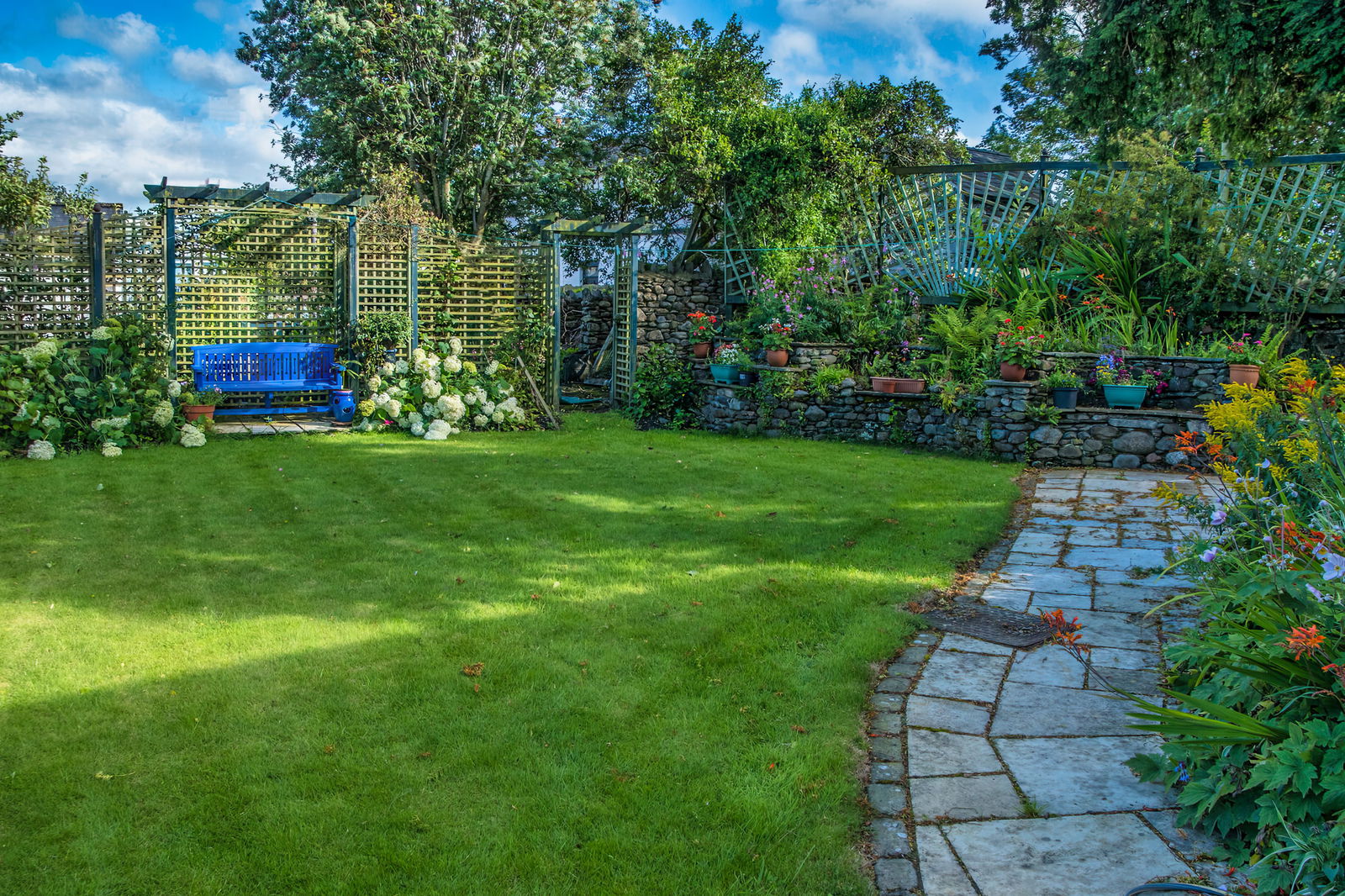 If you presently grow your own fruit and vegetables or aspire to a degree of self-sufficiency then the set up here is great. There are raised beds for veg (tucked behind a trellis to be out of sight from the seating area), a Rhino greenhouse which is internally subdivided for greater climate control and having power, light and water. It’s a lovely aspect from the greenhouse back to the house, no wonder a seating area has been built here. Around the main lawn are bushes of red and blackcurrants, gooseberries and clumps of rhubarb as well as fragrant lavender. Come harvest time there are damsons, apples (both cooking and eating varieties), cherries and figs to pick. As well as being productive, the garden is vibrant with seasonal floral colour including camelias, azaleas and hydrangeas. The main paved setting terrace is positioned to command a stunning Lakeland view, it’s close to the kitchen for convenient outside catering and has the advantage of a stone-built barbecue.