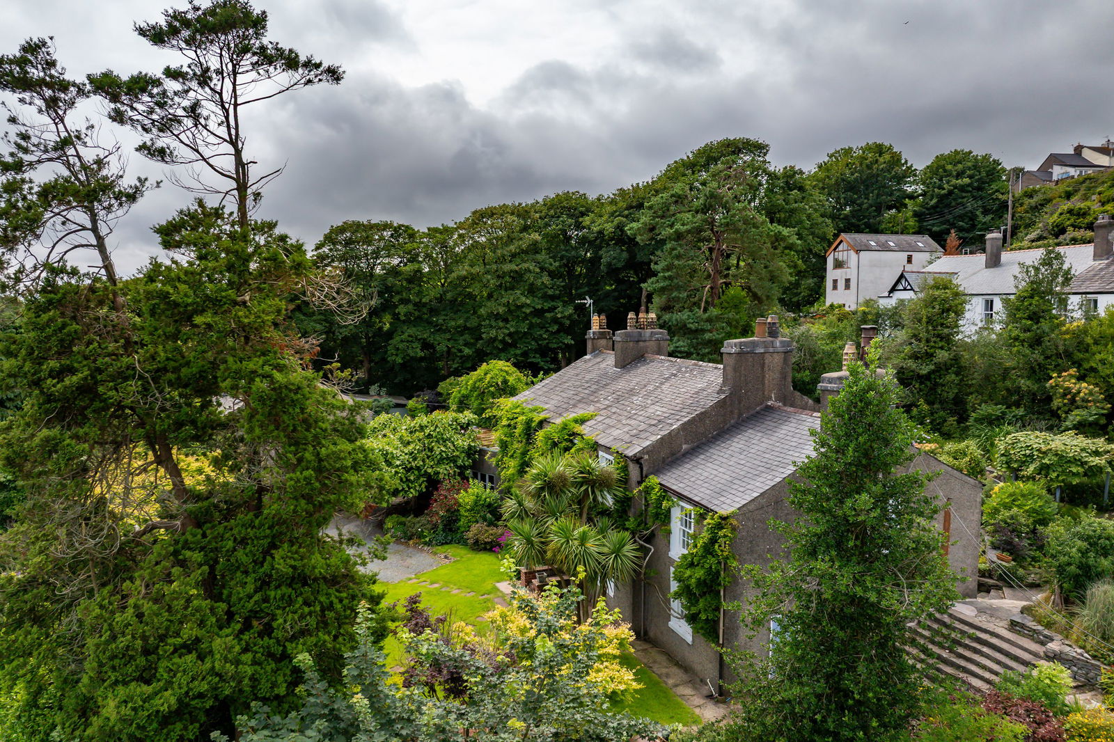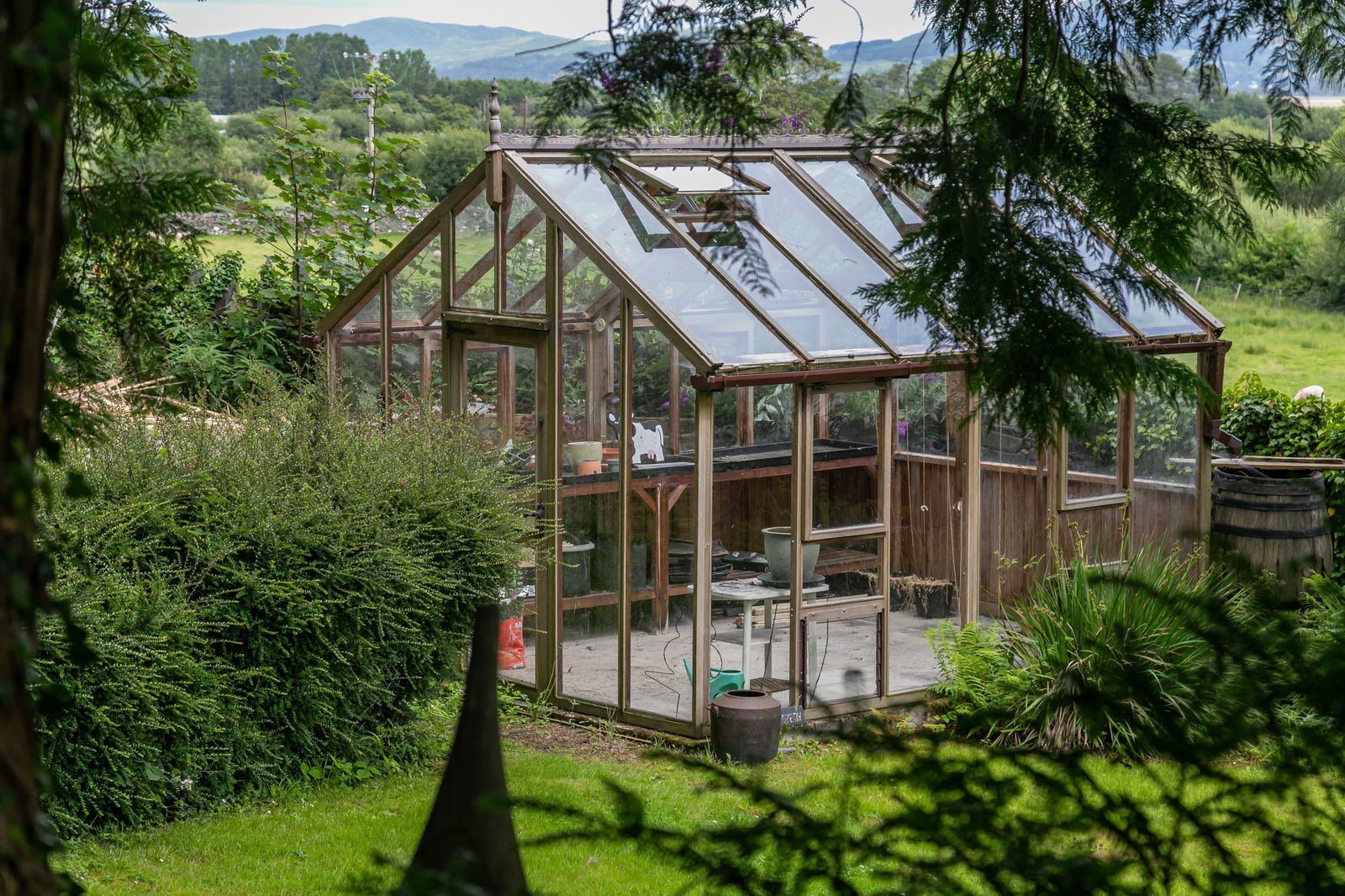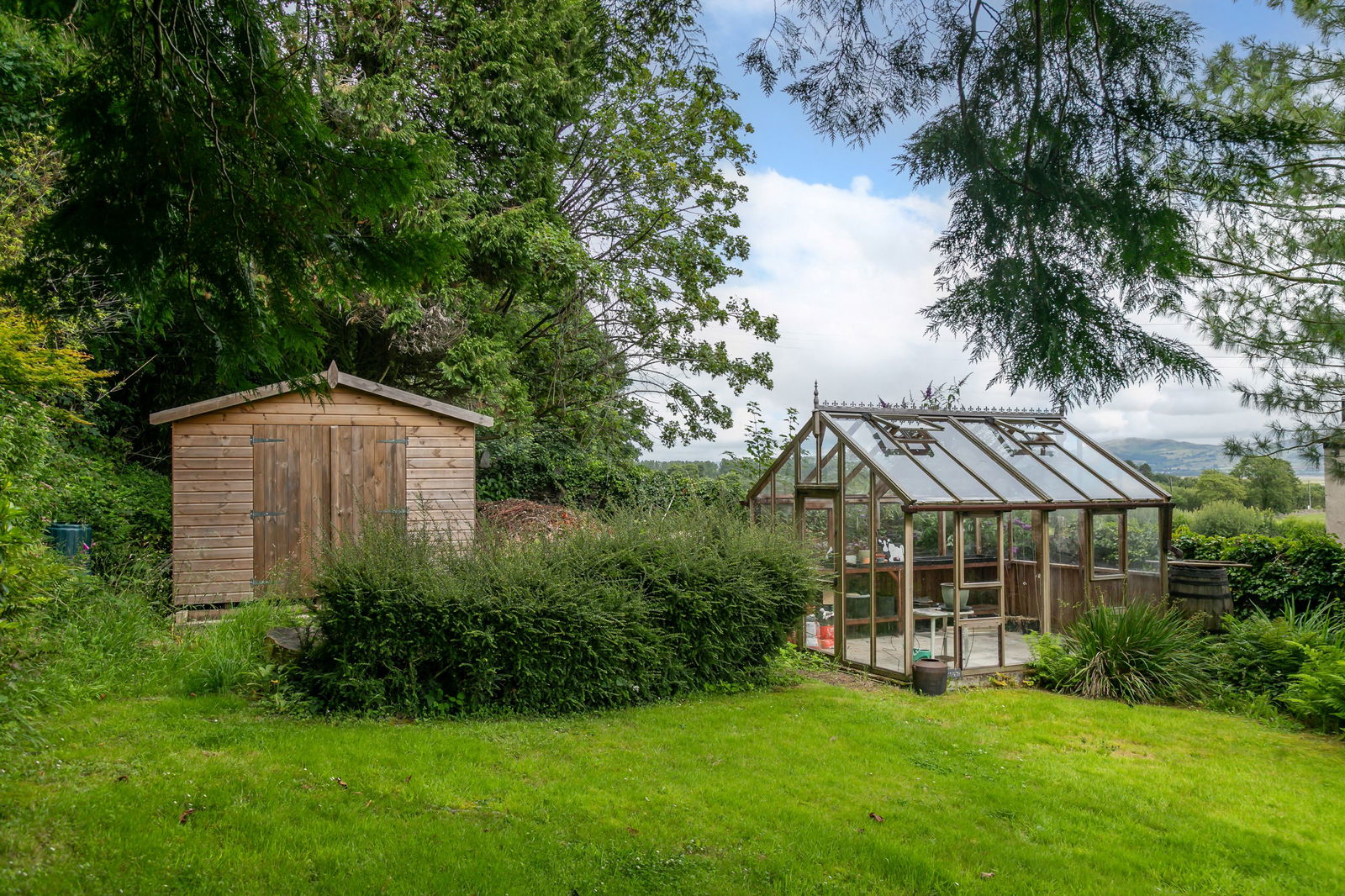 Paths meander and steps climb throughout the garden which include a hexagonal summer house, vine and jasmine covered pergolas, a pond, with decorative water pump, greenhouse, shed, and stone built fuel store. There’s a pedestrian gate up onto the top lane, a handy short cut.