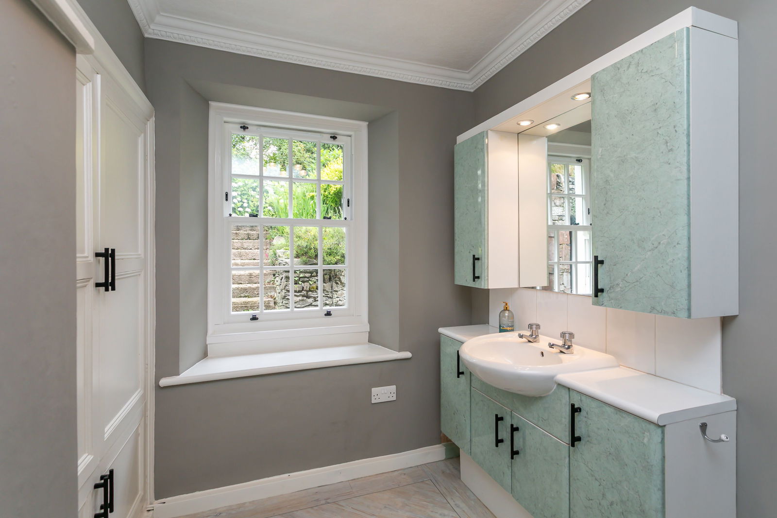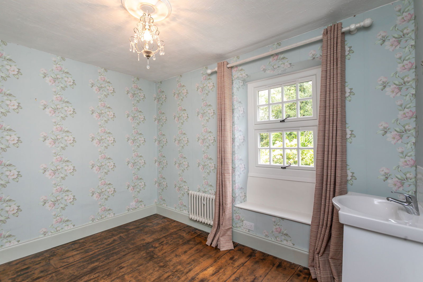 The front elevation is wisteria-clad, boughs and tendrils surrounding the windows and framing the views. The wide, glazed front door opens into an impressive double fronted reception room known as ‘The Garden Room’ as the outlook is to the front garden. An open fireplace creates a focal point and a cupboard conceals a handy serving hatch through to the kitchen. The partially paneled sitting room is an elegant, formal room with an enviable triple aspect with a multi fuel stove and floor-to-ceiling bespoke bookcases. From here, it’s through to ‘The Music Room’, a space equally well suited to being a games room, cinema room, office or den. A double aspect and external door provide a strong connection to the gardens. The characterful snug has a period open fireplace and a slate tiled floor which continues through into the sociable dining kitchen which embraces a contemporary aesthetic with on trend units in contrasting pale grey and navy blue, brought together with Quartz worktops. A traditional touch is the Belfast sink, this one fitted with a waste disposal unit. The kitchen is well equipped with appliances and with windows to both front and rear and a part glazed back door, the garden can be fully appreciated and easily accessed. Completing the ground floor layout is a smart cloakroom with a vanity unit and WC. A door leads down to the cellar where there are two rooms for storage.