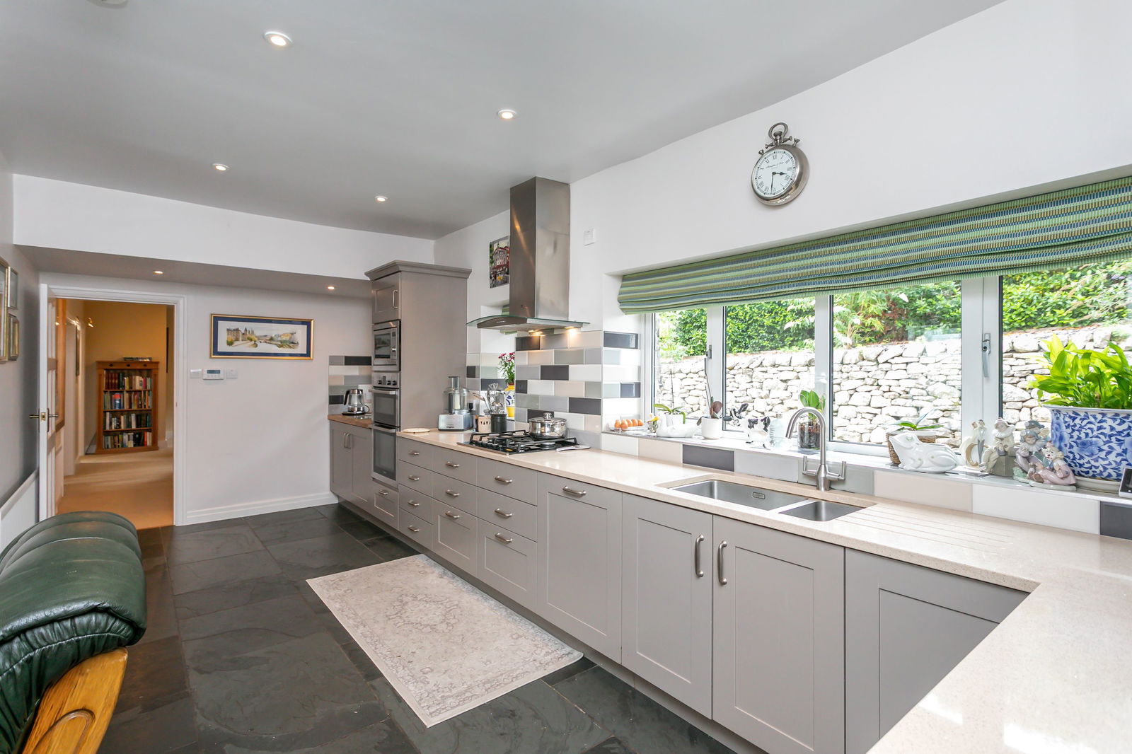 Craiglands feels very well connected to the garden in a variety of ways. The wide oak door opens into the spacious hallway, great for welcoming guests. Through a combination of glazed doors, the hall has a sight line through to the garden. There are two main reception rooms, the dual aspect sitting room has a picture window and Clearview multifuel stove in a stone surround. The formal dining room is atmospheric with a living flame gas fire and an illuminated cupboard. South facing, two sets of French windows open onto the terrace or into the conservatory.