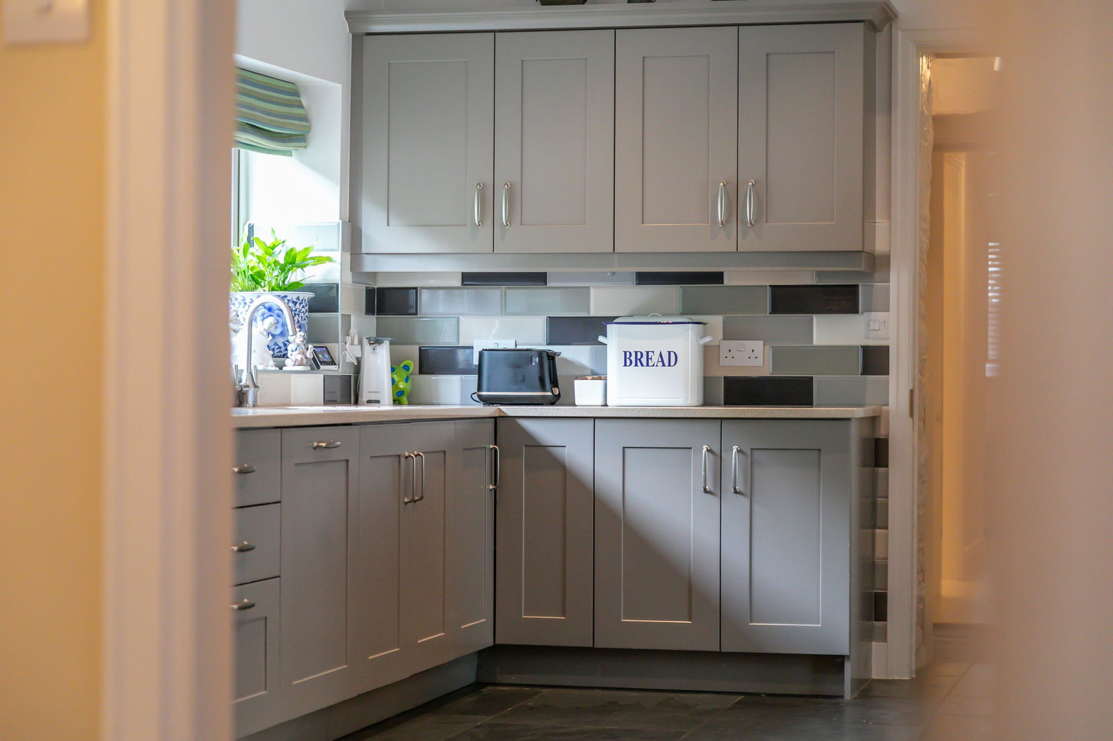 The big L shaped kitchen will appeal to anyone seeking a great sociable space, perfect for family life and ideal if you like to entertain. French windows open to the conservatory and continue the layout’s convivial flow. The dark grey slate floor complements the soft grey of the kitchen cabinets which are topped with either Silestone or oak worktops. There’s a third fireplace, this time housing a Gazco gas stove offering the aesthetics of a real fire, but a lot less work! To the side, an alcove cupboard offers space for both storage and display.