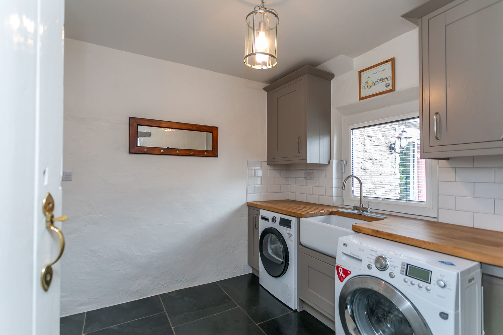 The slated floor continues from the kitchen into the hall and laundry room which has soft grey painted wooden cabinets, oak worktop and a Belfast sink. There’s a shelved pantry and storeroom (with plumbing if converted back to a kitchen for an annex). The fifth bedroom has use of a shower room.