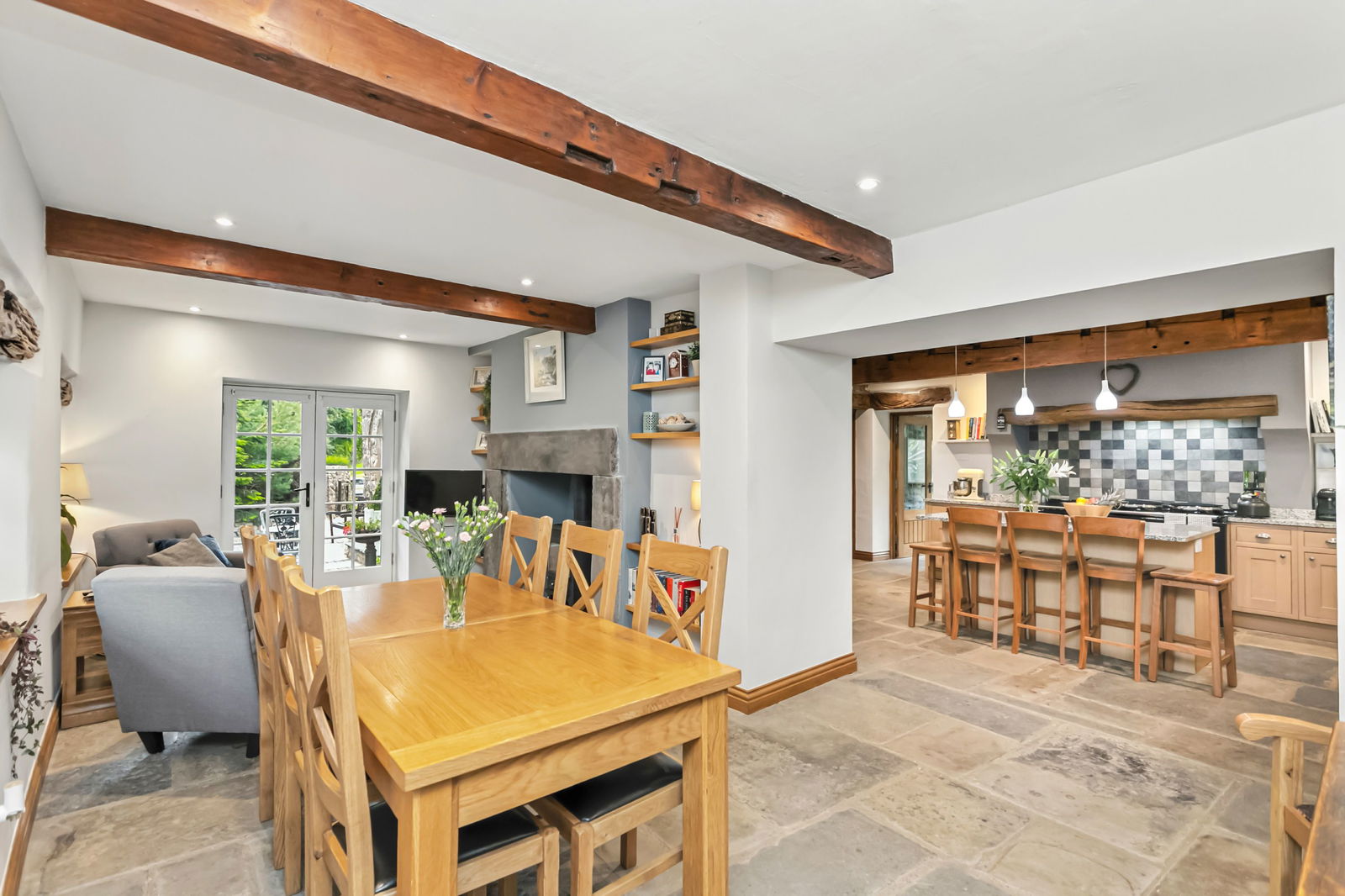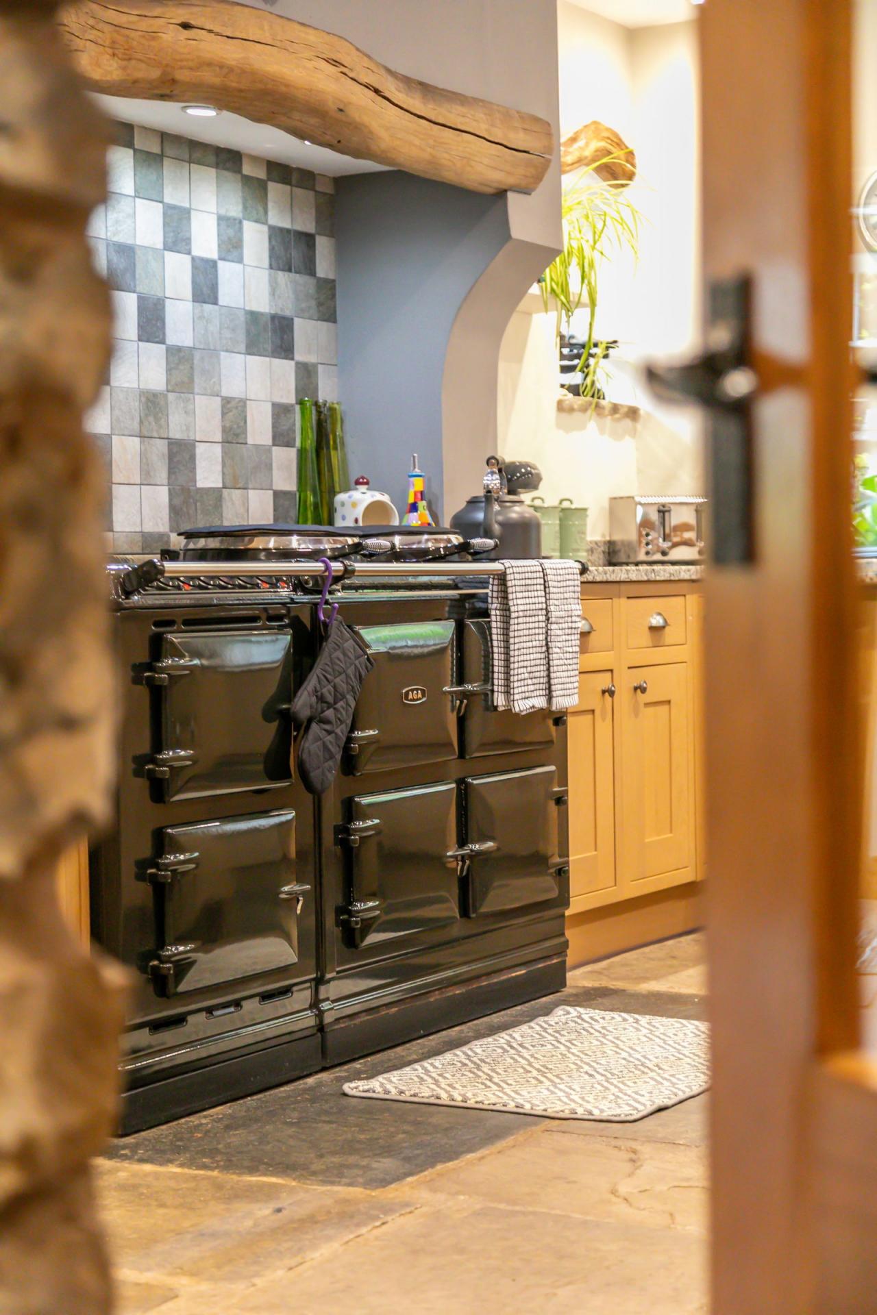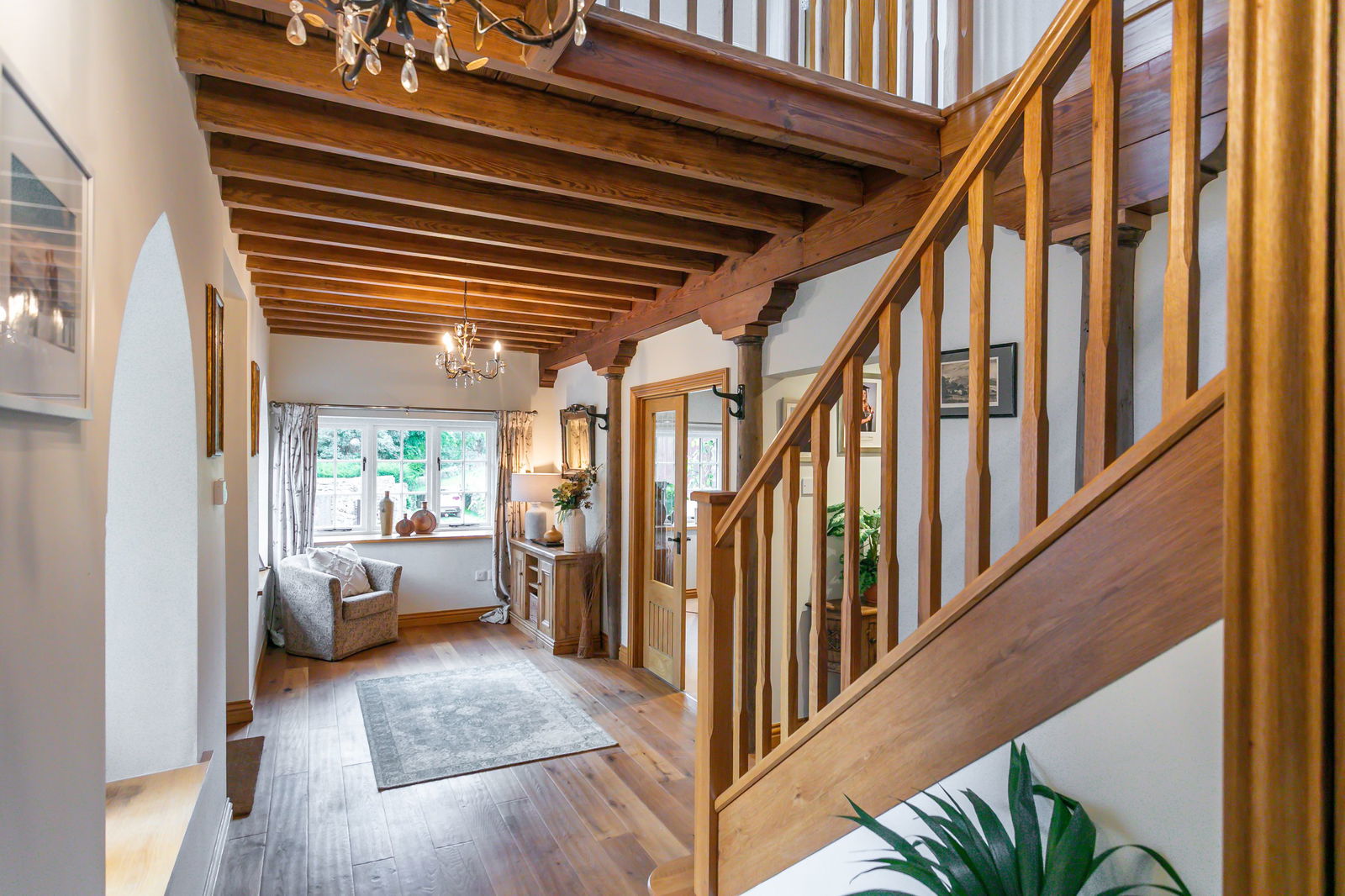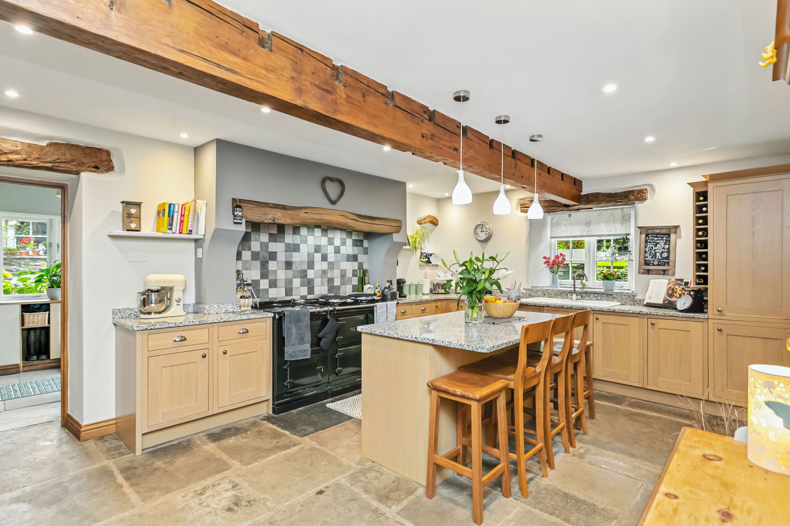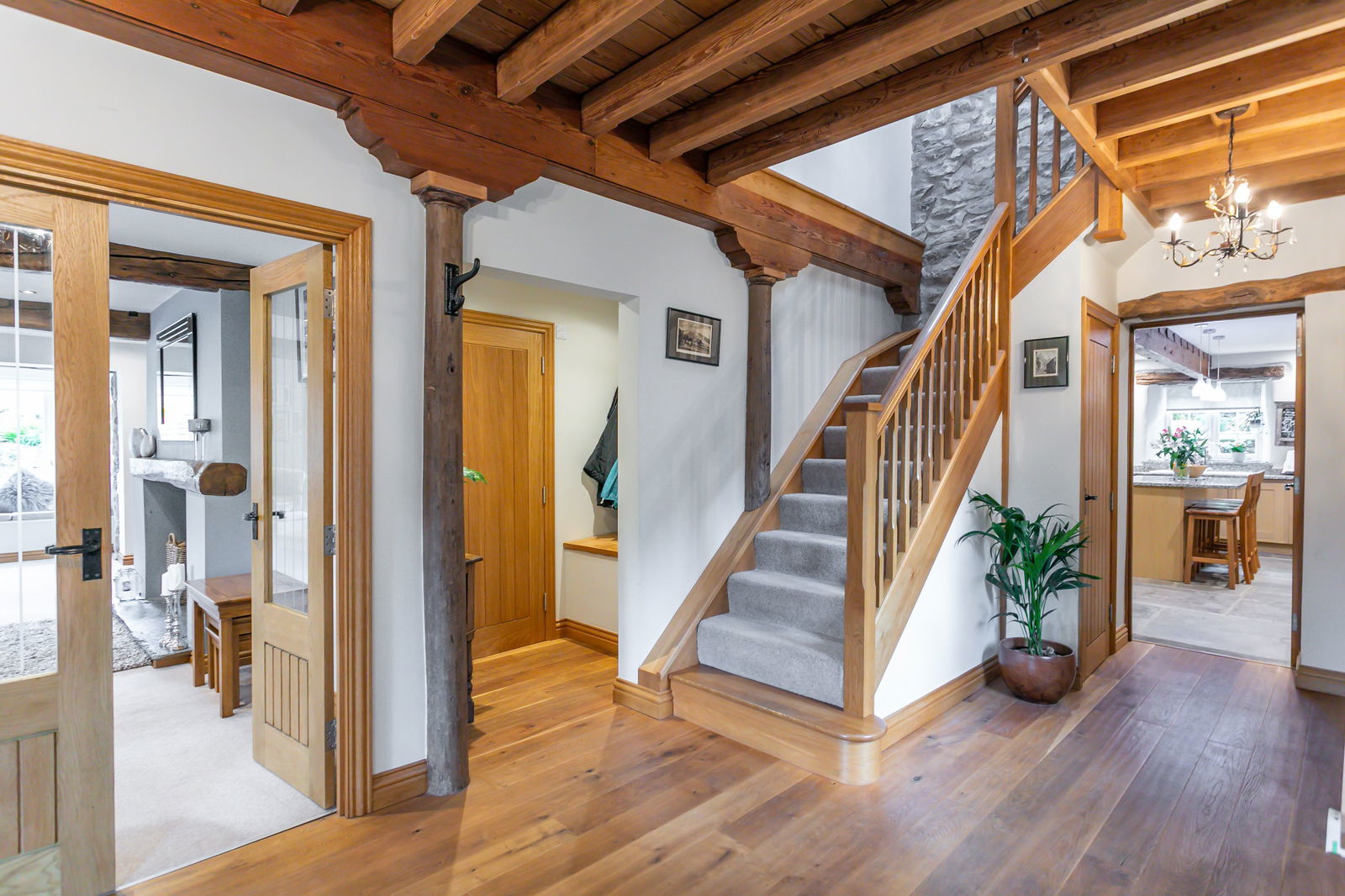 The house is spacious and characterful with an inviting nature that lends itself perfectly to family life and will appeal to those who enjoy entertaining at home. An impressive entrance through the arched front door leads into the roomy hall, a great circulation space when welcoming guests. No wonder the family choose this room for their Christmas tree. Off the hall is an inner cloakroom with space for coats and a fitted bench with hidden storage for logs and firewood, through into a downstairs WC. The sitting room is a large room with a wide and deep square bay offering space to sit and enjoy the delightful views. The heart of a country home, the kitchen is open to the dining area and snug creating a living kitchen that is sure to be a well-used family space and great for entertaining a crowd with plenty of room to spread out. The various areas are united by big old original York stone flags, with underfloor heating and an electric Aga that ticks over during the day until needed for cooking so generating a warmth which permeates through the house. Traditional cabinets with light oak doors and granite worktops are a timeless choice and include an island which extends into a breakfast bar. The snug has ample space for comfy seating in front of the stove and French doors to the garden. Completing the ground floor is a separate pantry, utility room, rear porch and a second cloakroom, handy for when out in the garden.