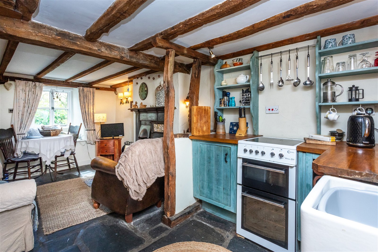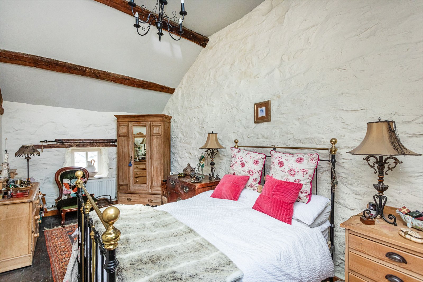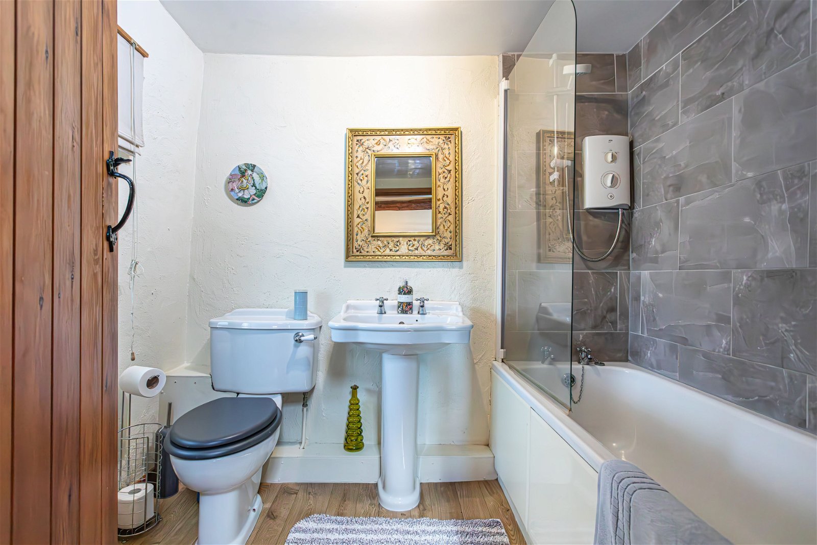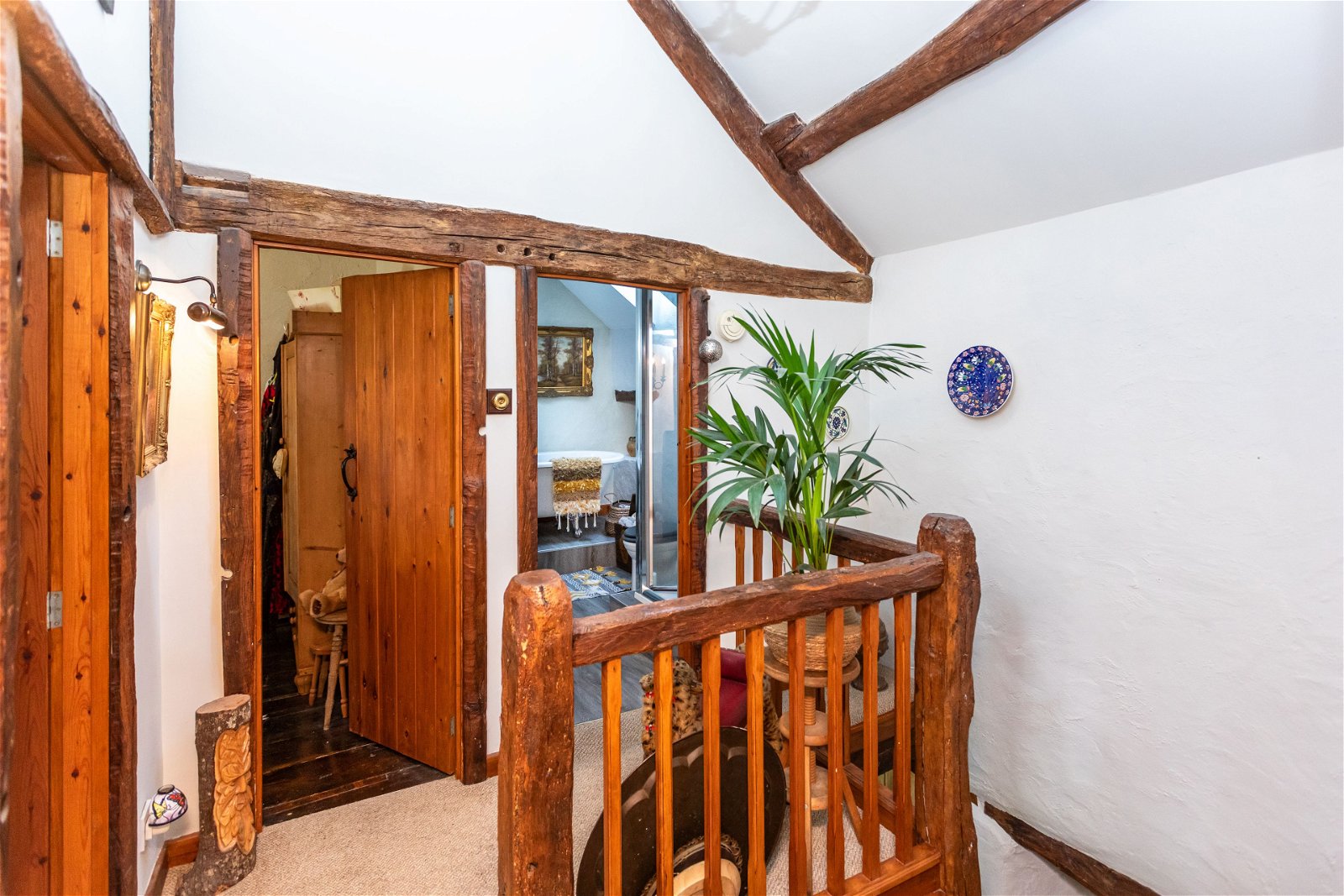 The side hall opens into a hallway with store cupboards. The charismatic sitting room enjoys the evening sun and has a flagged floor, beamed ceiling and plenty of exposed woodwork, including spice cupboards and the stairs which rise from here. Embracing a quintessential country look with a cast iron range under a stone mantle and a door opening to the front porch; how lovely to have it open on a warm day and allow a gentle breeze to waft through. For most of the year however, it’s a room for evening use, for getting cosy, hunkering down and enjoying a film or binge-worthy box set. Off the sitting room is a snug with a wood burning stove and rustic touches of exposed stonework (with a recessed niche for display), timbers and beams. The kitchen has a solid fuel Aga at its heart and joiner made pine cabinets with black granite work tops, a Belfast sink and serviceable butcher’s block. The antique pine wall cabinet is included as is the free-standing electric oven and fridge; there’s plumbing for a dish washer. The kitchen is open plan to the garden room – a wonderful and very atmospheric addition with wide pine floorboards, a ceiling open to the roof’s apex with exposed roofing timbers and three walls of glazing with central French windows out to the garden’s terrace. A fitted bench provides seating along one side of your table. The owner tells us they practically live in here during the day and that it's a magical setting for a dinner party with lamps and candles reflecting in the glass all round. You’d need two Christmas trees for sure, one in here, the lights bouncing back off the windows and one in the deeply traditional sitting room. Completing the picture on the ground floor is a shower room which has a shower, wash basin, loo and old tall pine corner cupboard for plentiful storage.
