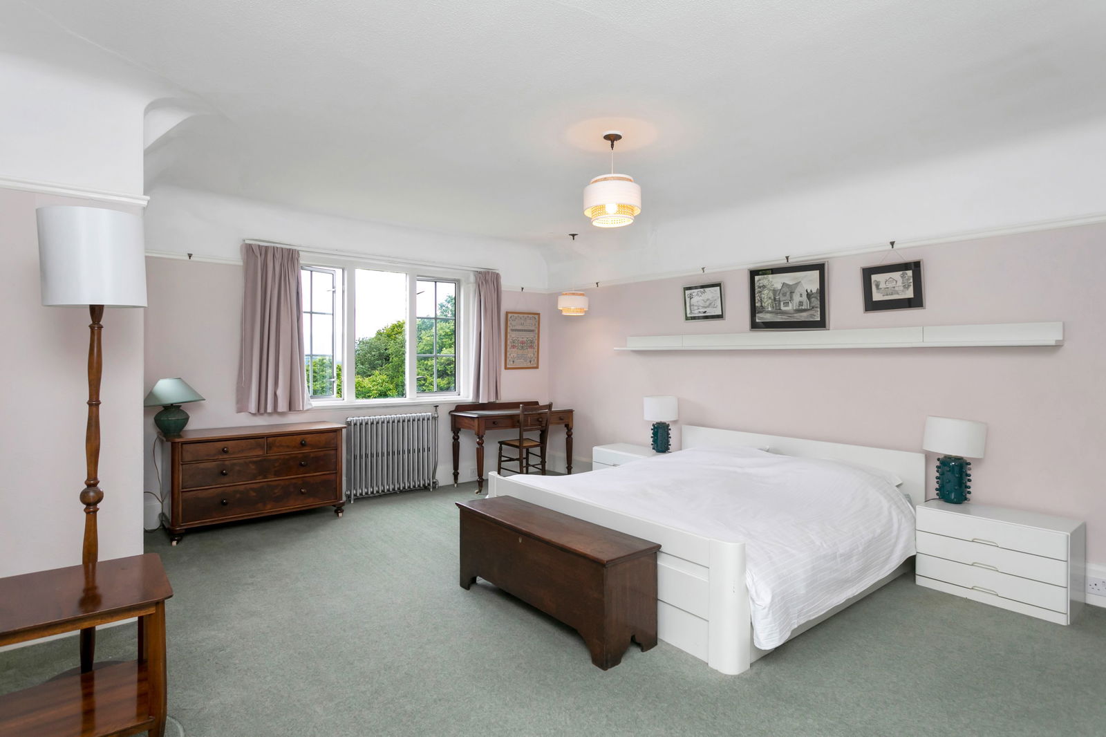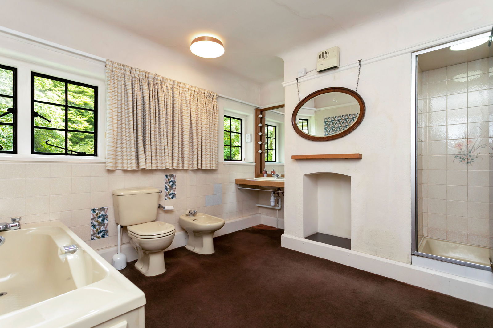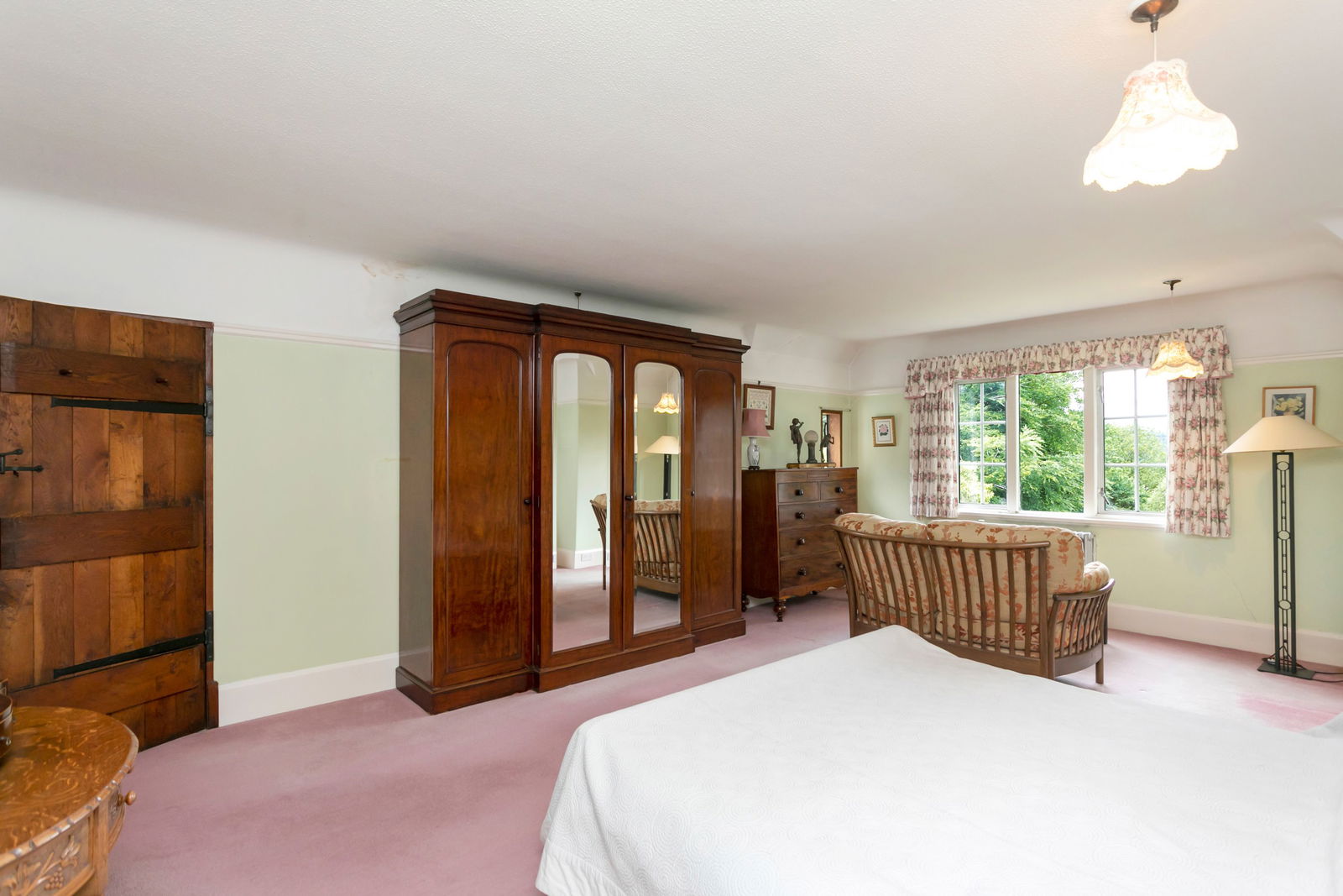 The spacious principal bedroom commands garden views in four directions. The view westward is panoramic with the fells rising beyond the tree tops. The bedroom has a Jack and Jill style bathroom with a vanity wash basin, WC, the original roll top bath and a second door onto the landing. The second double bedroom is dual aspect with a small ensuite shower room and enjoys a slightly different slice of the same impressive view. Between these two bedrooms on the west facing elevation is the third double room, it has French windows to the oak balustraded balcony (the ideal place to watch the sun set), an original open fireplace and fitted alcove cupboard. Most recently, it’s been a home office and would be a lovely place to work if you’re not easily distracted with the impressive view. From the landing, a short flight of three steps leads down to the fourth double bedroom, it enjoys garden views from the triple aspect and has an original wash basin. The fifth and final bedroom on this floor is a single room, also with a wash basin. The house bathroom was refitted some time ago, but is well proportioned and has a bath, separate shower, vanity wash basin and WC. There is a further stand-alone cloakroom with WC. Completing this floor is the housekeeper’s linen store with a Belfast sink and good storage space for linens and towels.