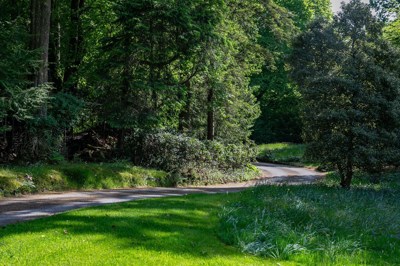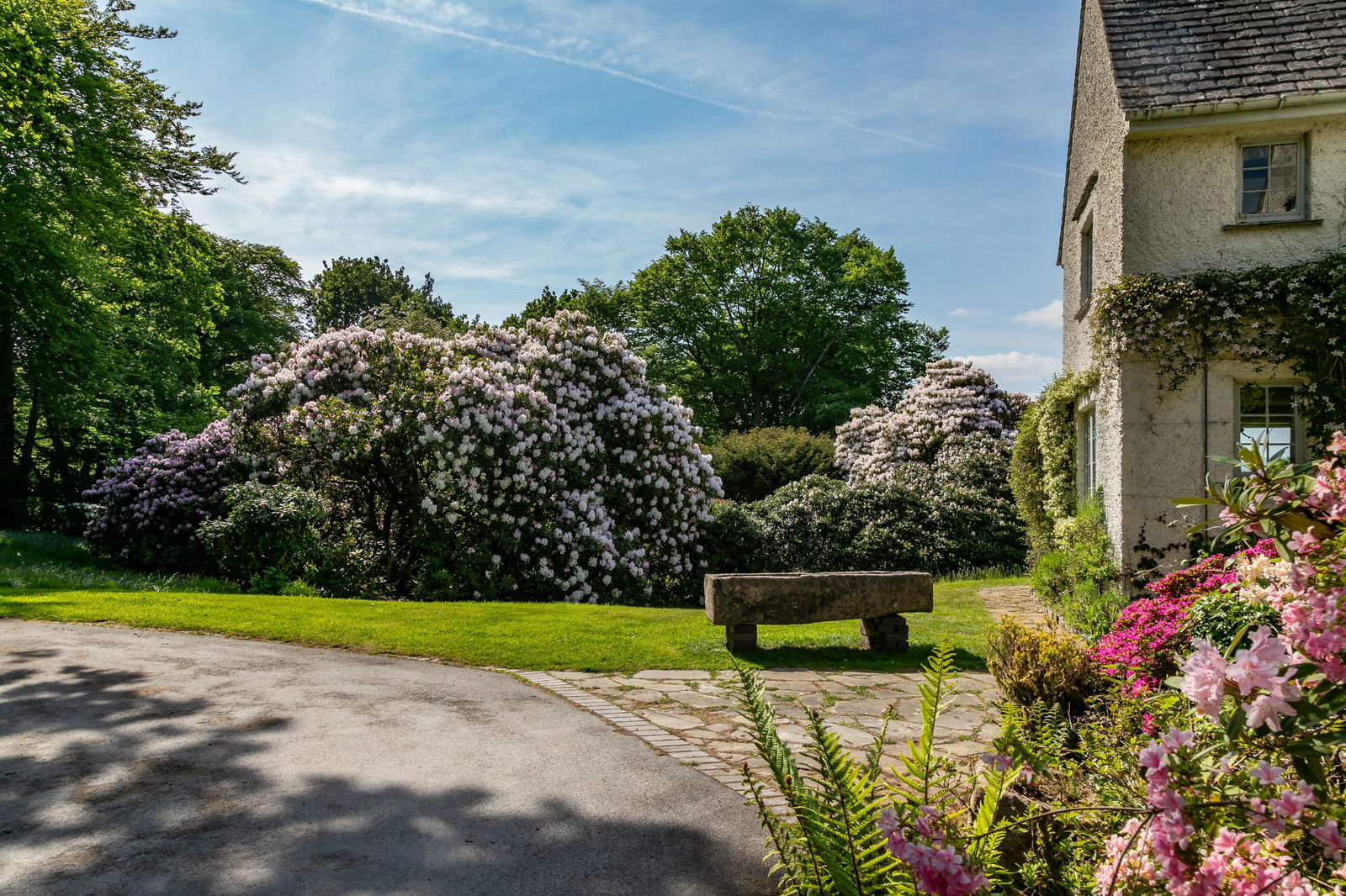 From the front door, a path leads round to the front of the house and the verandah which faces almost due west. With a door from the drawing room, it has external power and light and is a lovely place to sit and enjoy the garden. Above the verandah is a balcony, another great vantage point and choice spot for an evening drink as you watch the setting sun. The path continues all the way round the house, passing elevations clad with wisteria, jasmine, clematis, roses and climbing hydrangea. The main garden lies to the west with paths leading through established shrubberies of multi-coloured rhododendrons and hydrangeas – a lovely array of pinks, purples, blue and white are a sight to behold in spring. The paths lead to a circular paved heather garden from where stone steps then climb back to the lawn in front of the house.