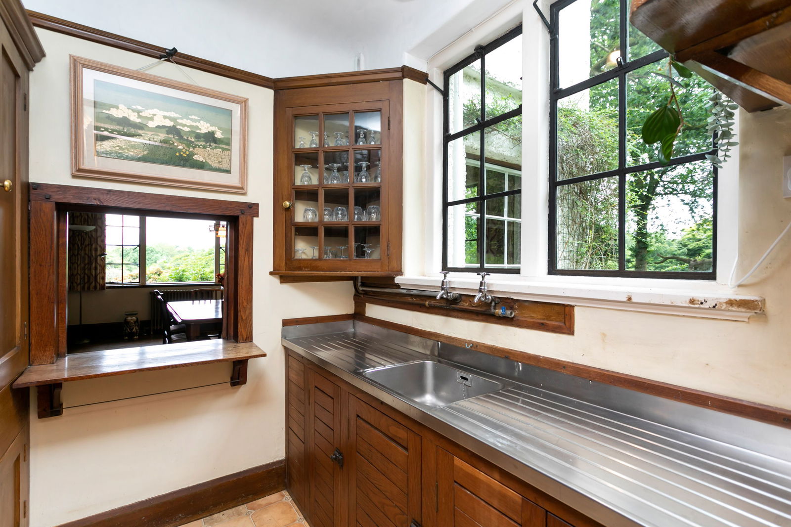 This can all be seen throughout Broomhill in the use of Lakeland stone, local slate (not just on the roof, but also floor tiles in the hall and cloakroom), copper (many of the light switches are hammered copper, as is the name sign hanging in the front porch) and plentiful oak (used here to great effect in the stunning galleried staircase, internal doors, beams, skirting boards, architraves and floors in the drawing and dining rooms). The aesthetic has a friendly, informality which includes asymmetrical forms; steep slated roofs with overhanging eaves, rounded chimney stacks and handcrafted details such as the fireplaces and built-in furniture. Rich in period detail there is also the original servants’ bell board, many original windows with stays and latches as well as original ironmongery on the doors. Indicative of a long gone era are the ancillary domestic offices including a butler’s pantry, a traditional shelved pantry and on the first floor, a housekeeper’s linen store.