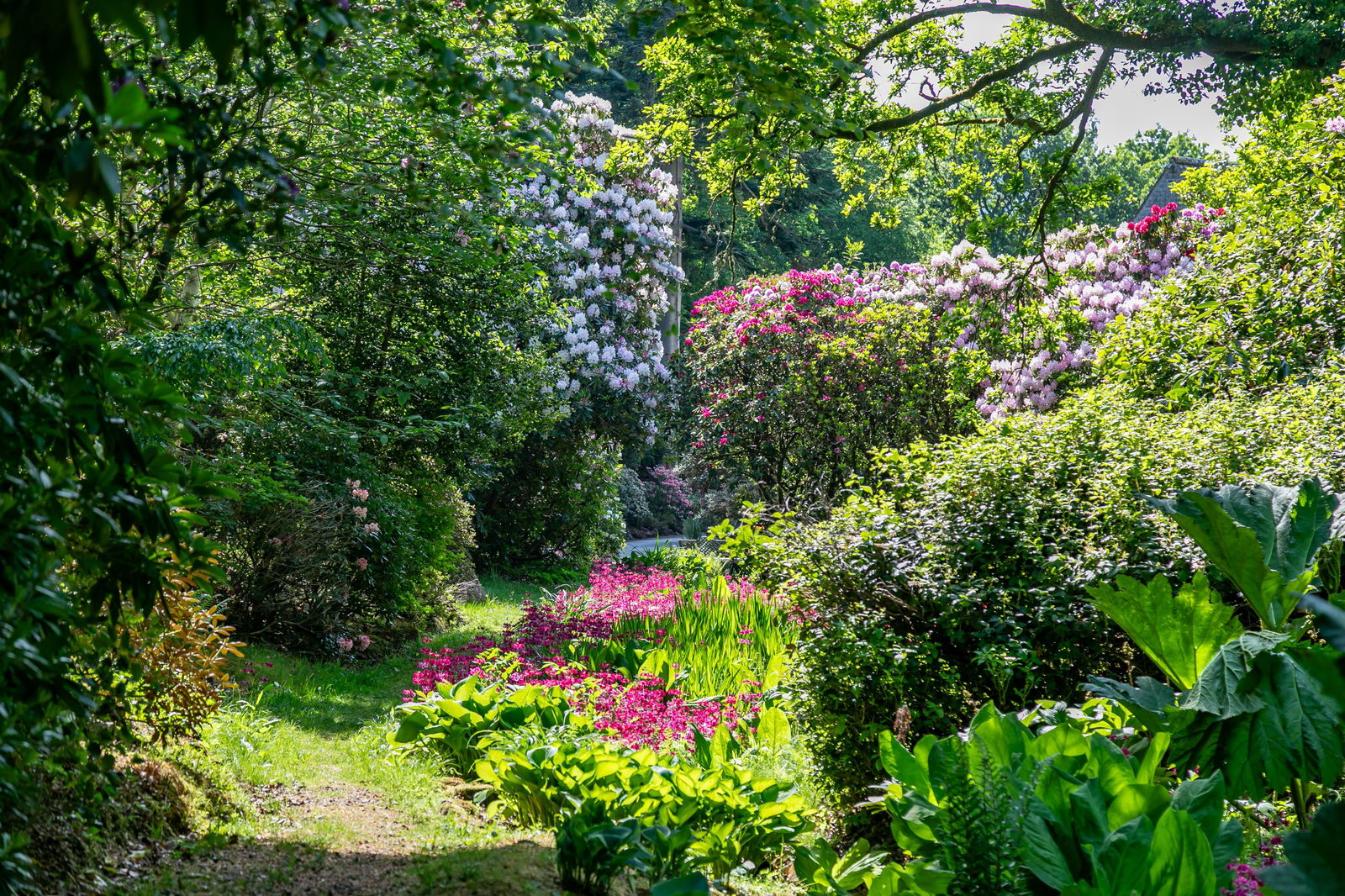 The most formal area is a large level lawn with central pond, edged with colourful rhododendrons, azaleas, hydrangeas, maples and acers, beyond them oak, beech and birch trees.
