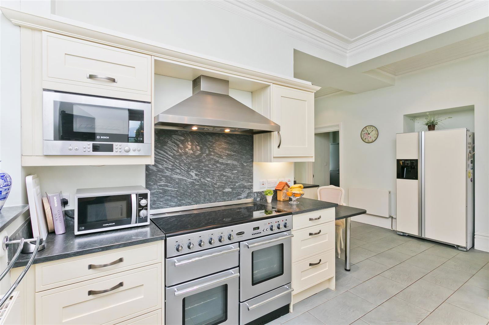 Fitted carpets, curtains, curtain poles, blinds, light fittings, Rangemaster cooker, integrated Bosch dishwasher and a microwave.