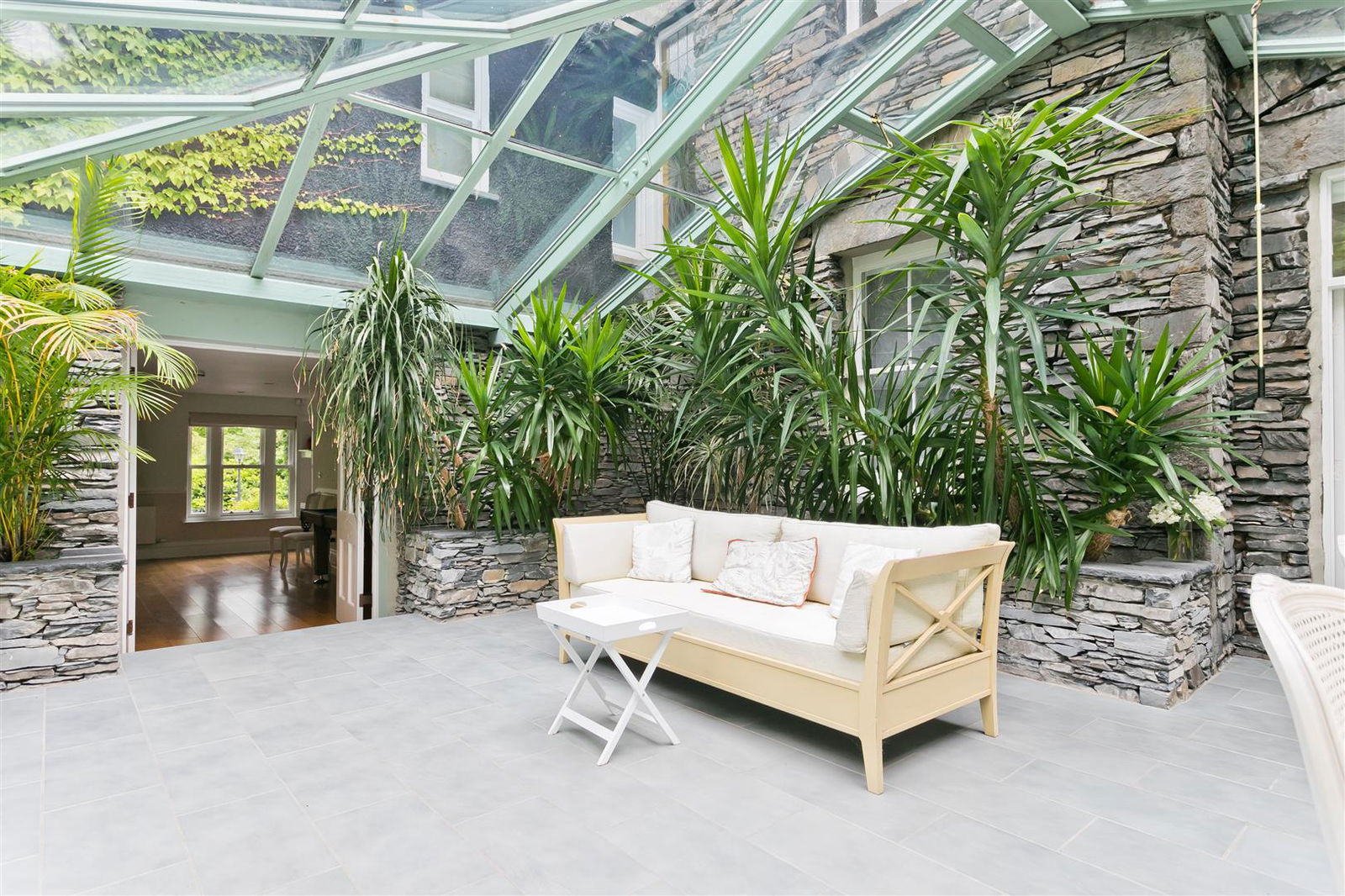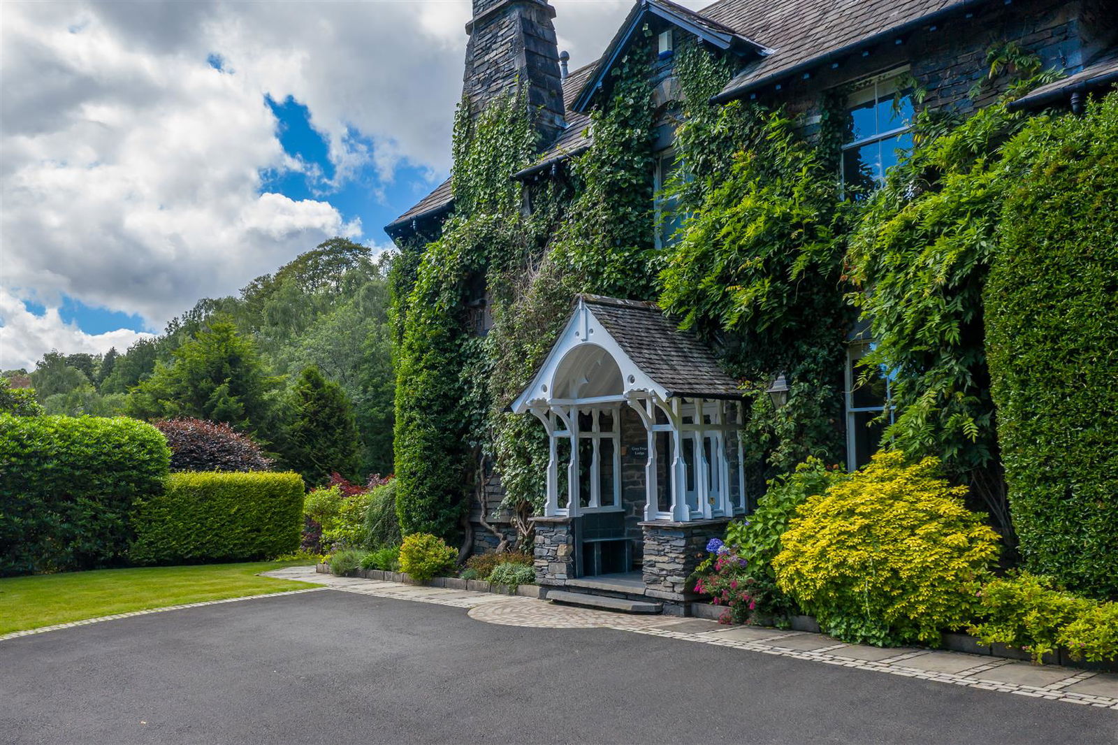 Set back off the road and offering a rare degree of seclusion for such a central Lakeland location, Grey Friar Lodge is approached through electric gates to a long sweeping tarmacadam drive with strategically placed external lighting. The drive leads to a large parking area next to the house.