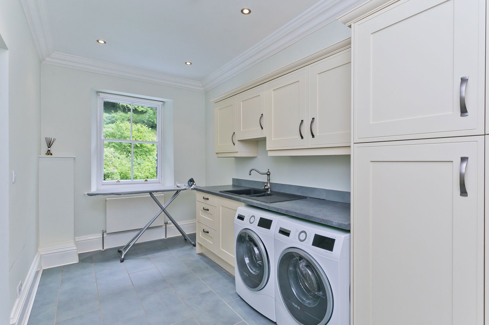 An attractive open porch with slate seating either side is perfect for donning boots ahead of your next outdoor adventure. The glazed front door leads into a vestibule which in turn opens into the impressive entrance hall, setting the tone for the rest of this imposing residence. The cloakroom provides plenty of space for coats and boots with a loo and wash hand basin.