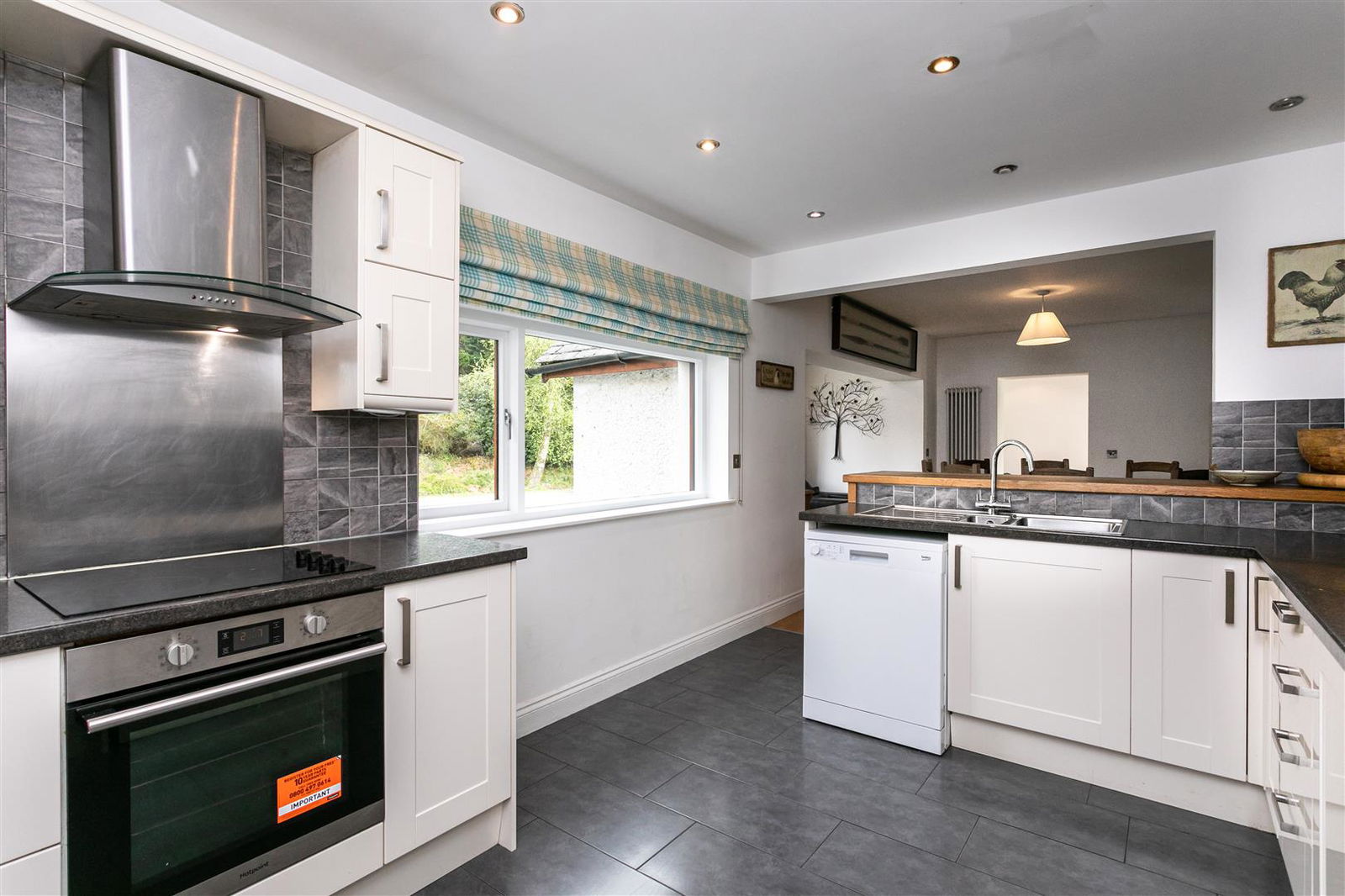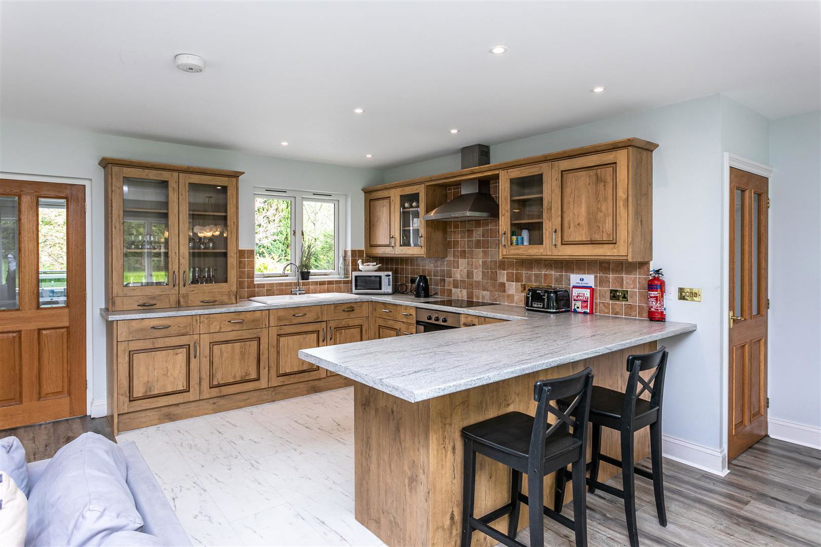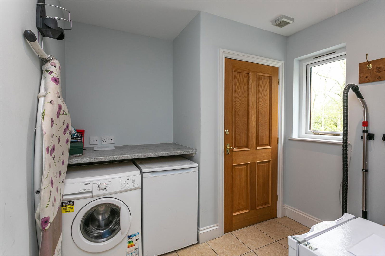 The entrance is straight into the central dining hall, with wood strip flooring and an open riser staircase it is an attractive approach. The kitchen is open plan and separated from the dining hall by a high oak breakfast bar. Sleek and stylish, the cabinets are fitted with cream high gloss doors. Integral appliances comprise a Hotpoint electric oven under a Zanussi hob with extractor fan over, Kenwood fridge freezer, Whirlpool microwave and a freestanding Beko dishwasher. The utility room provides a useful back up and provides a wet weather entrance with a door in from the rear porch. A freezer, washing machine and tumble dryer (all Beko) are here as well as the Vaillant central heating boiler and hot water storage tank.